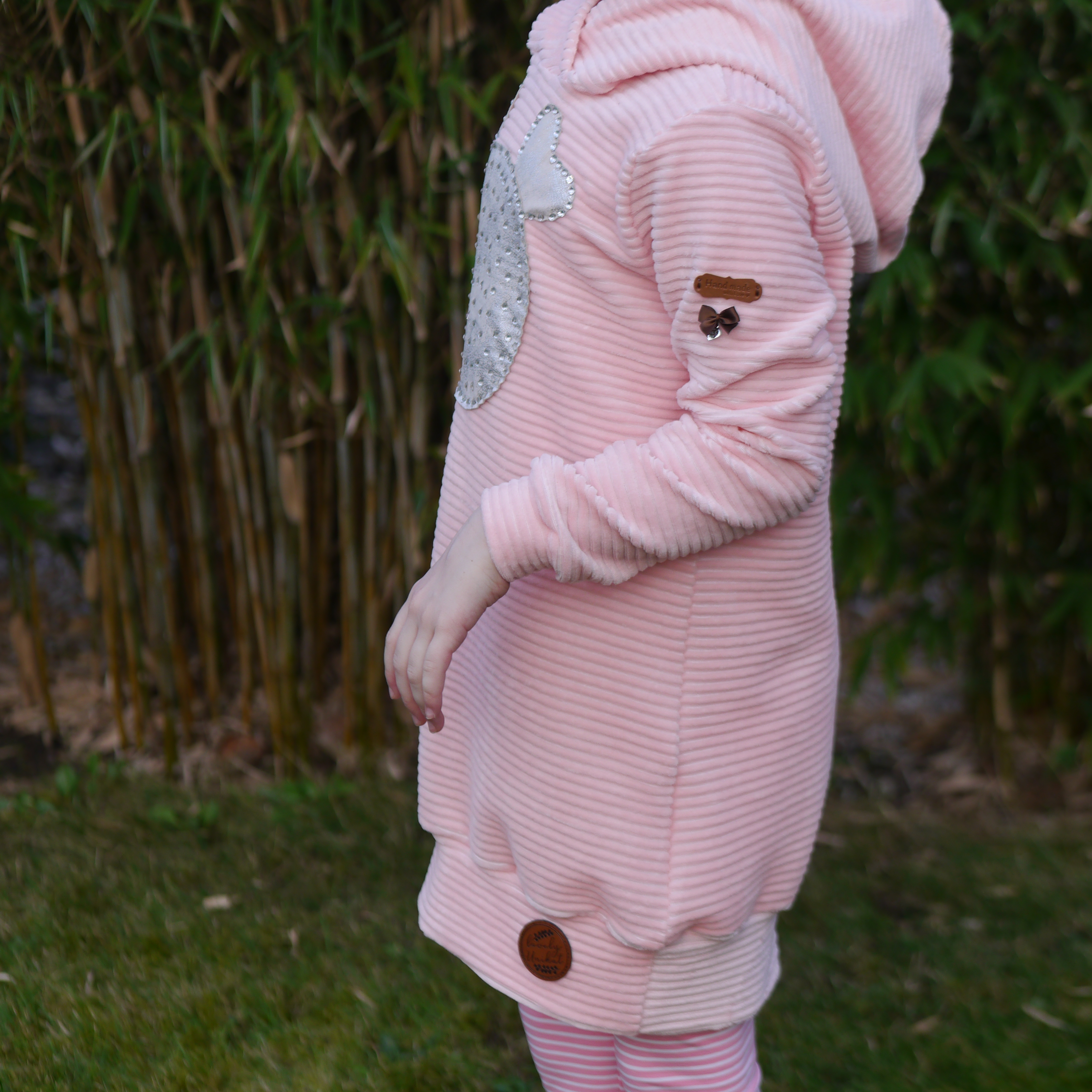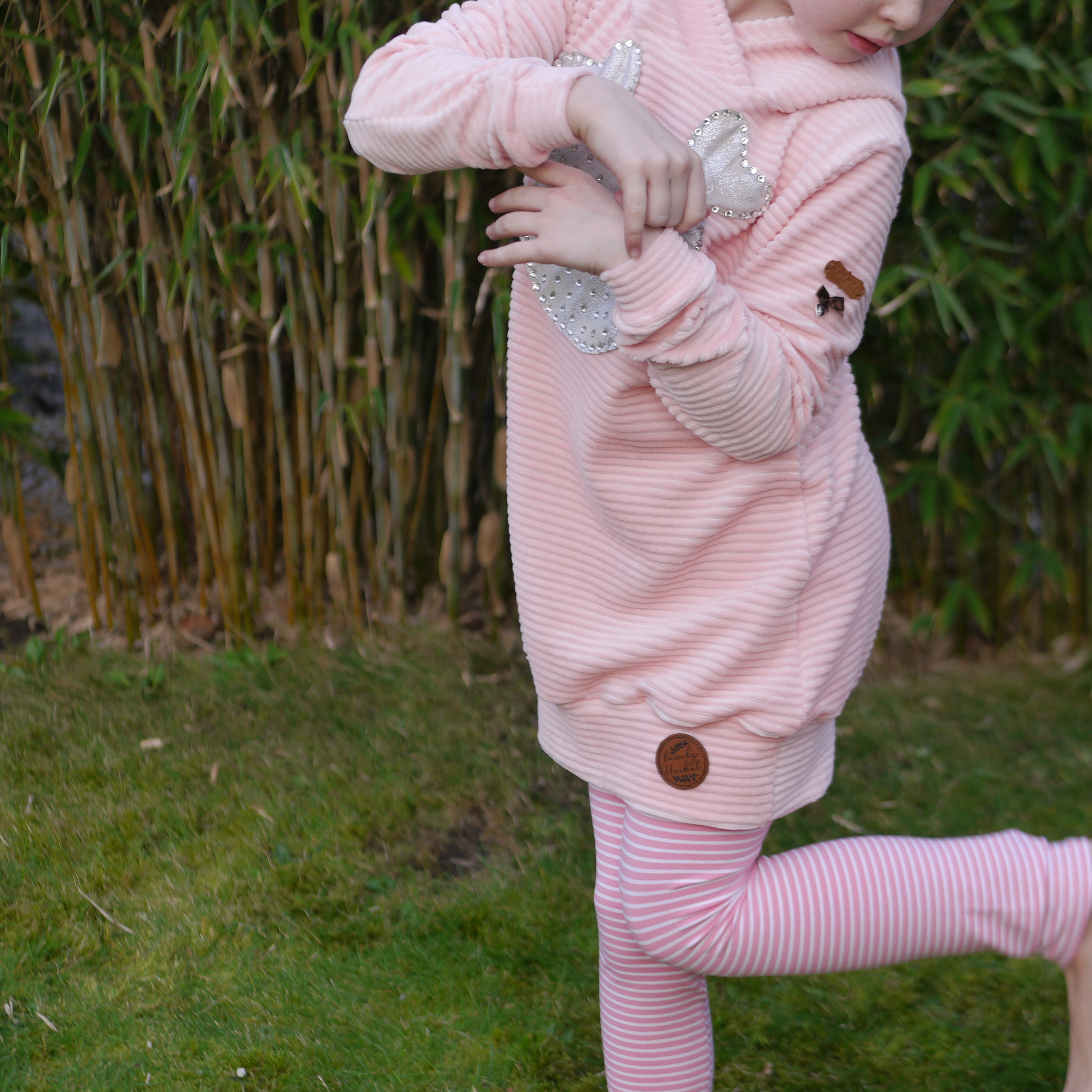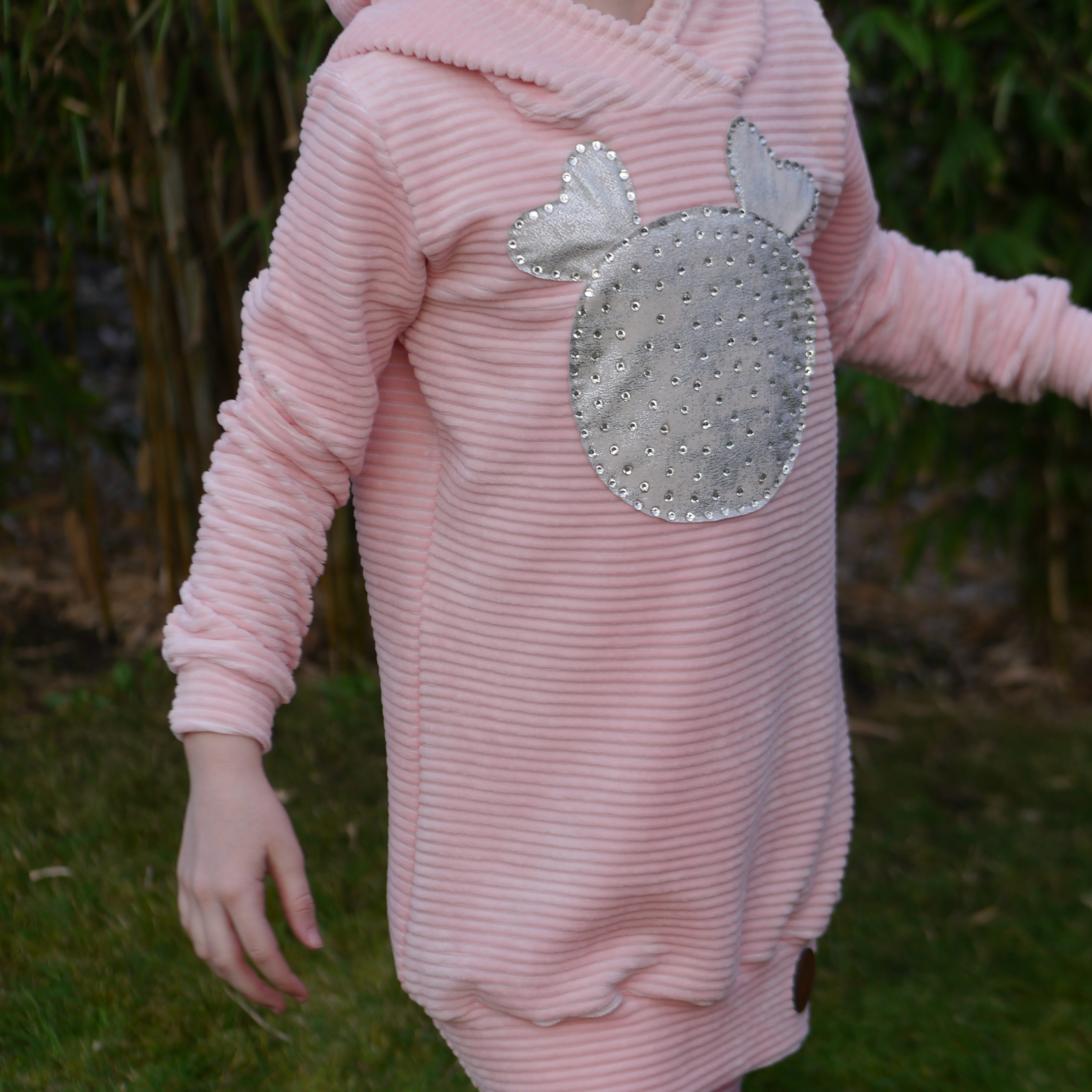 Ballonkleid für Mädchen mit Kapuze in der Farbe Rosa aus elastischem Cord Stoff. Der Stoff ist sehr weich und super bequem. Vorne hat das Kleid einen Mickey Mouse Kopf aus Vegane Leder mit Strass Steine.