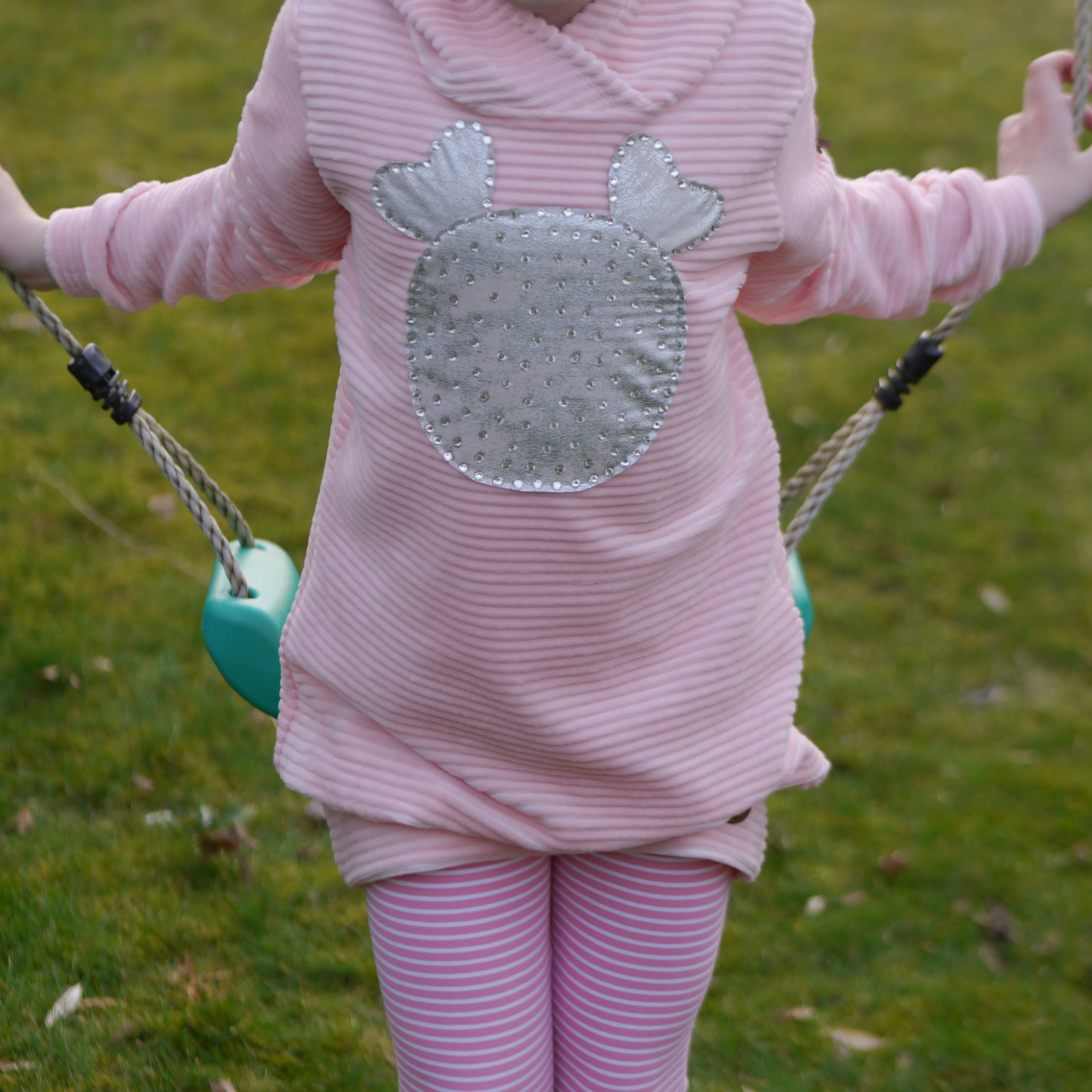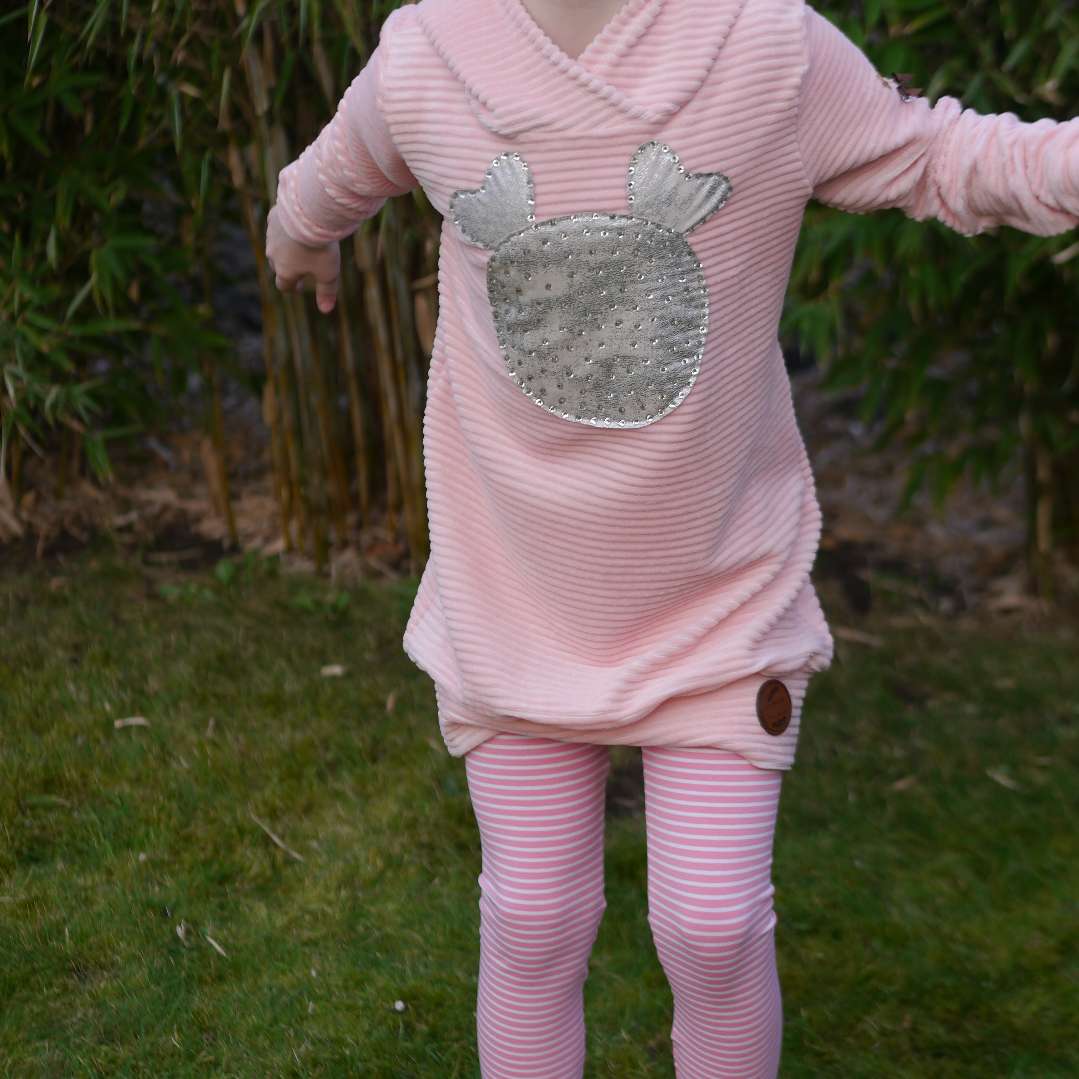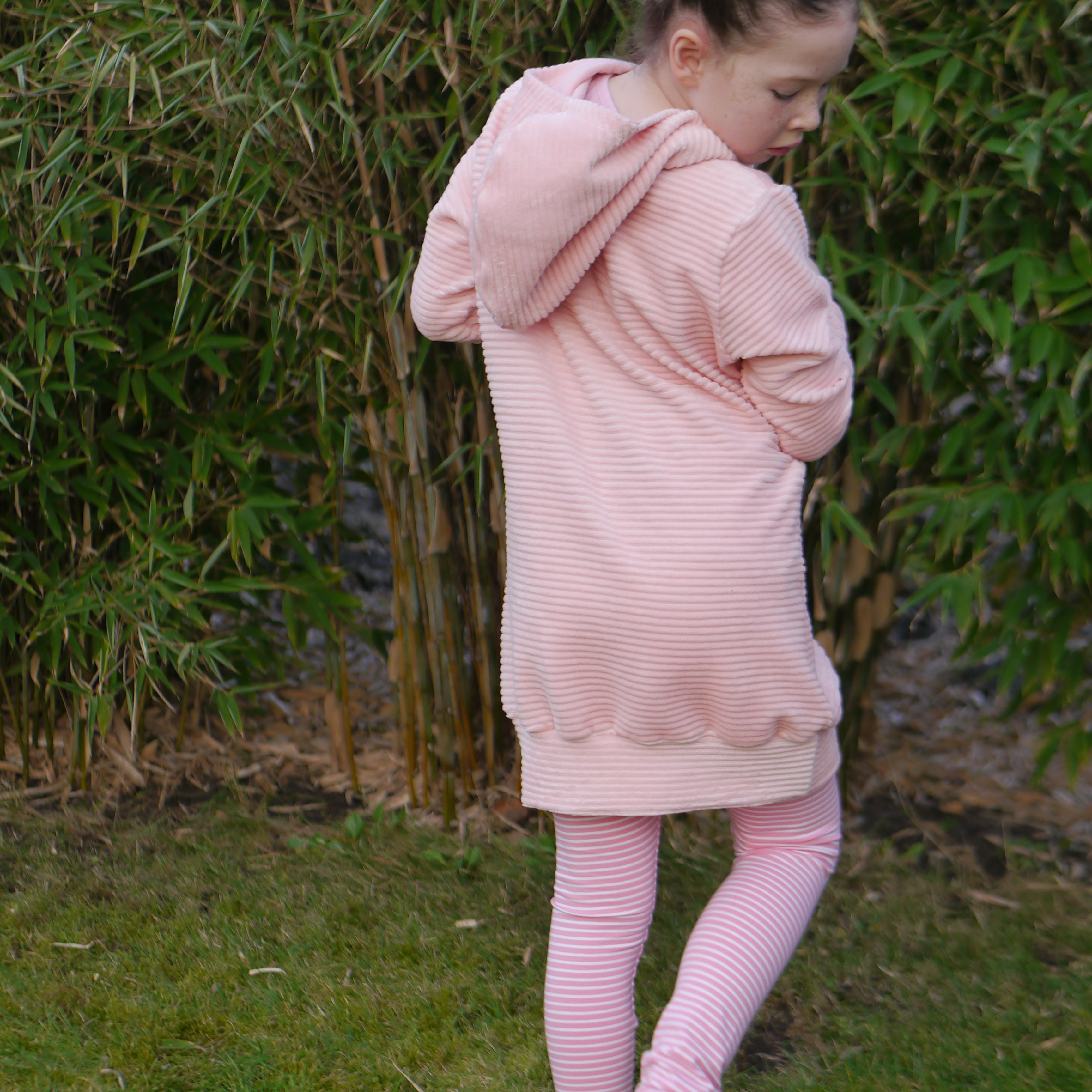 Ballonkleid für Mädchen mit Kapuze in der Farbe Rosa aus elastischem Cord Stoff. Der Stoff ist sehr weich und super bequem. Vorne hat das Kleid einen Mickey Mouse Kopf aus Vegane Leder mit Strass Steine.