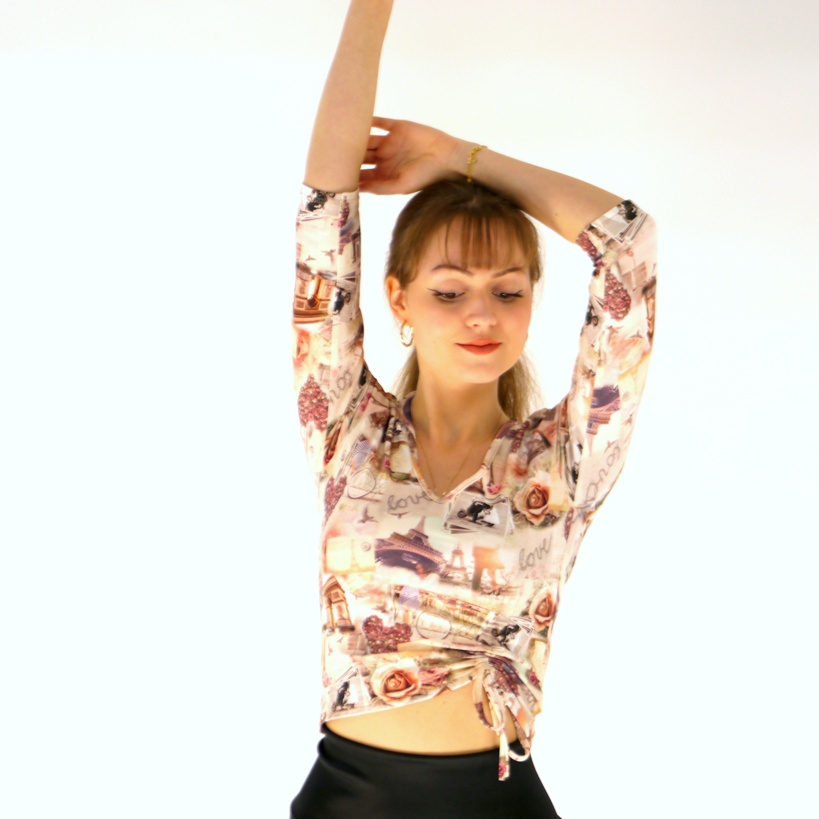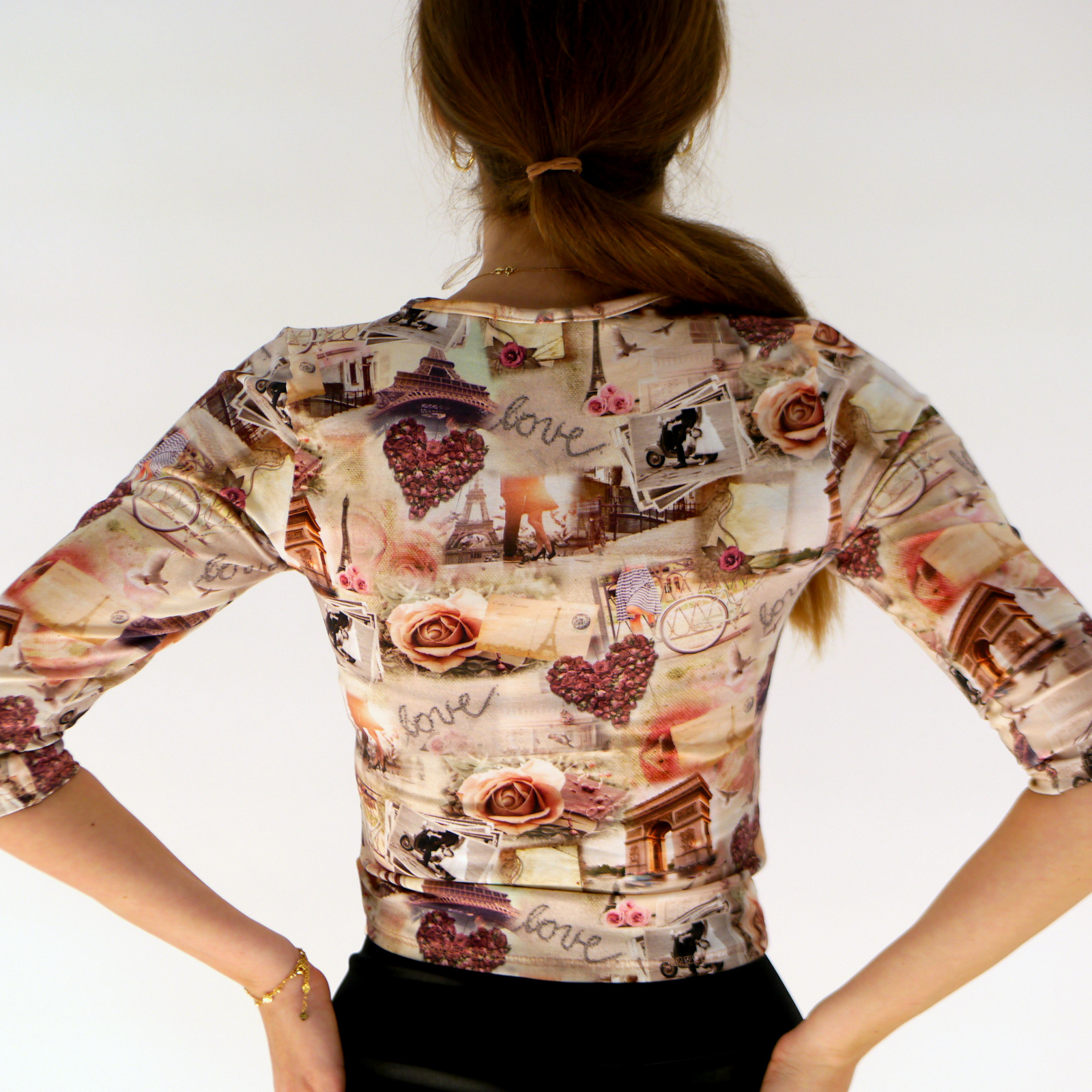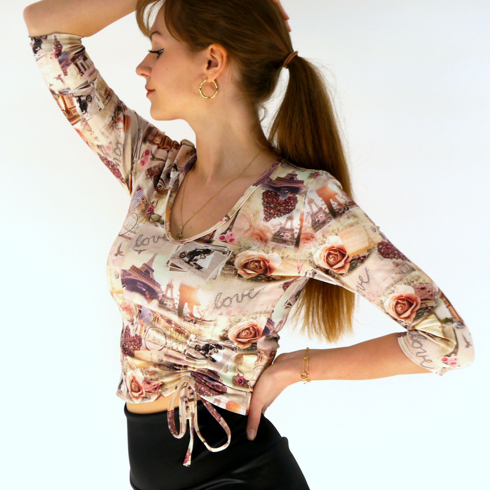 Oberteil aus 95%Baumwolle+5%Elasthan mit 3/4 Ärmeln und eine Raffung mit Kordel auf der Vorderseite. Auf Wunsch kann man die Raffung aufmachen.
