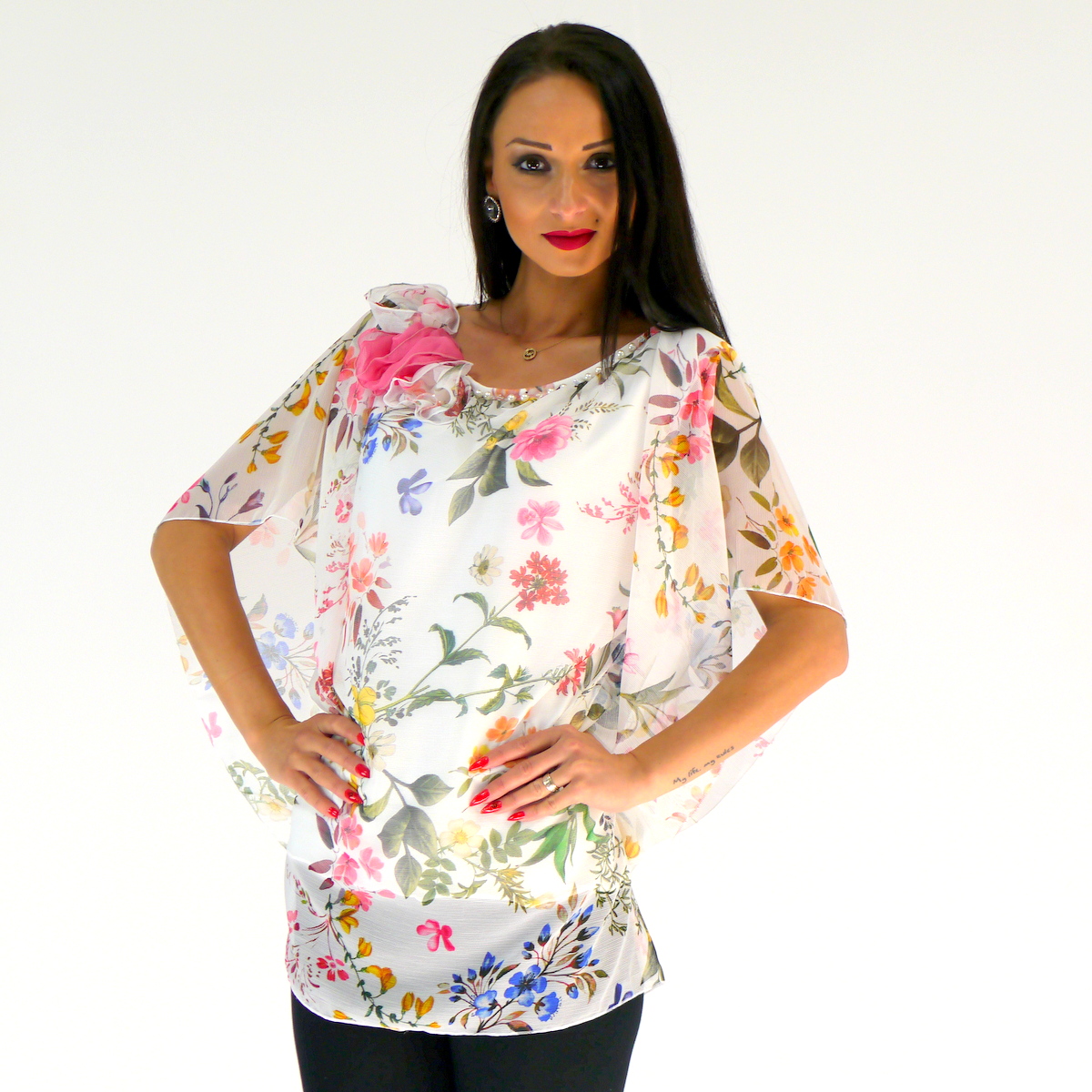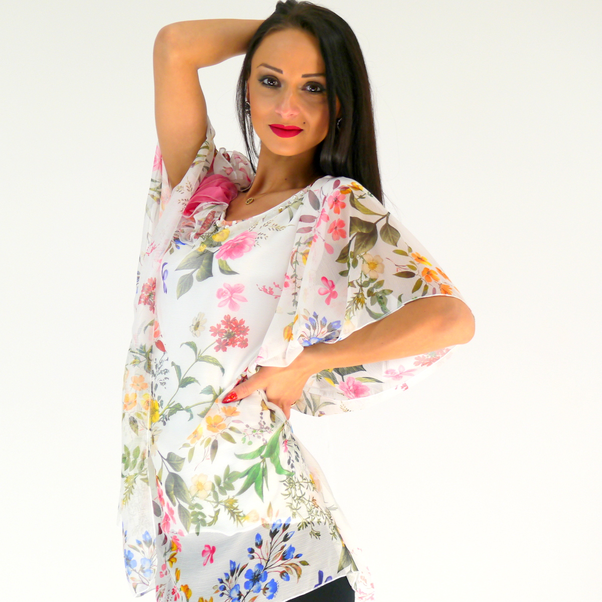 Schöne Tunika aus Chiffon Stoff und drunter Baumwolle Shirt. Oben am Saum hat diese schöne Tunika weiße Perlen und Kristall Perlen