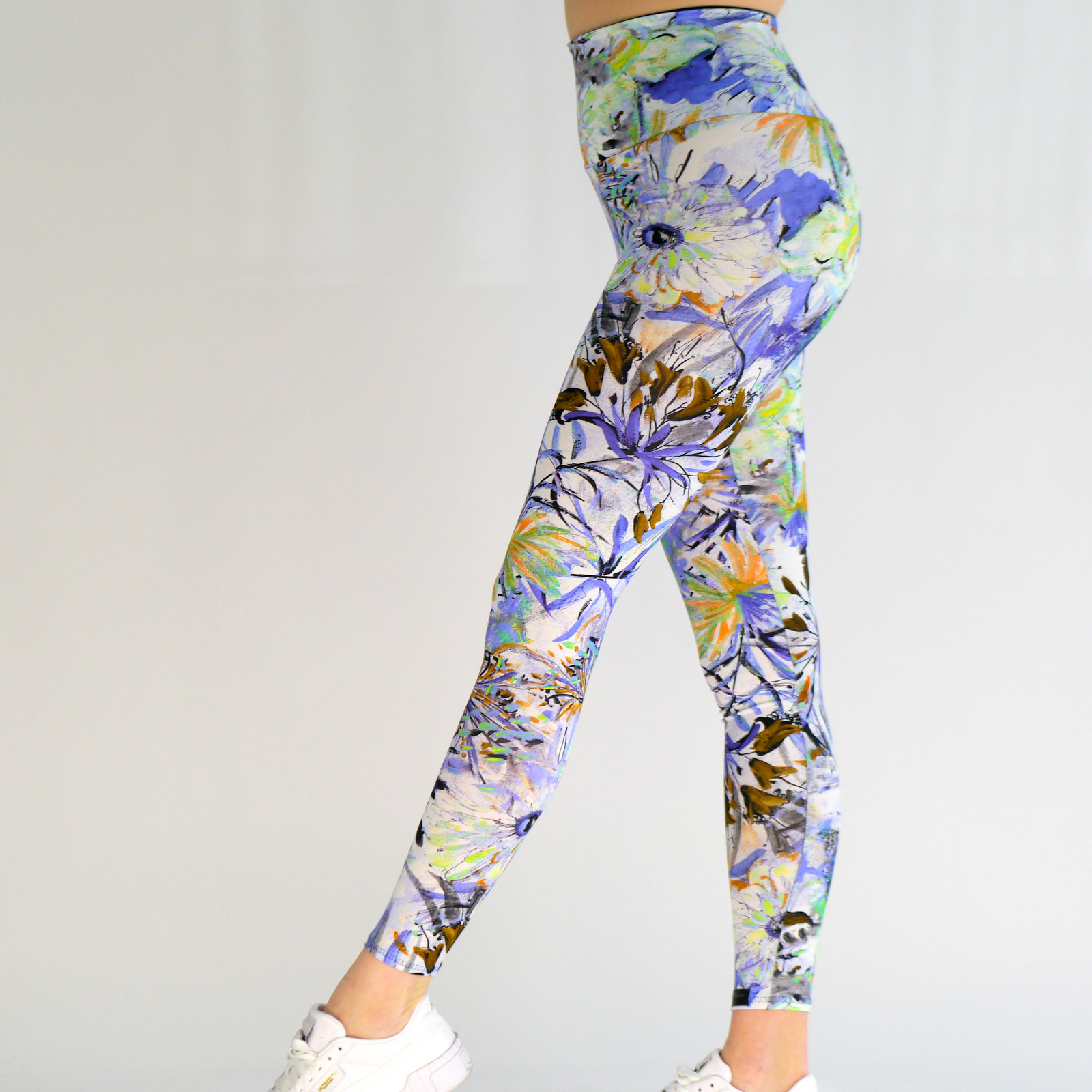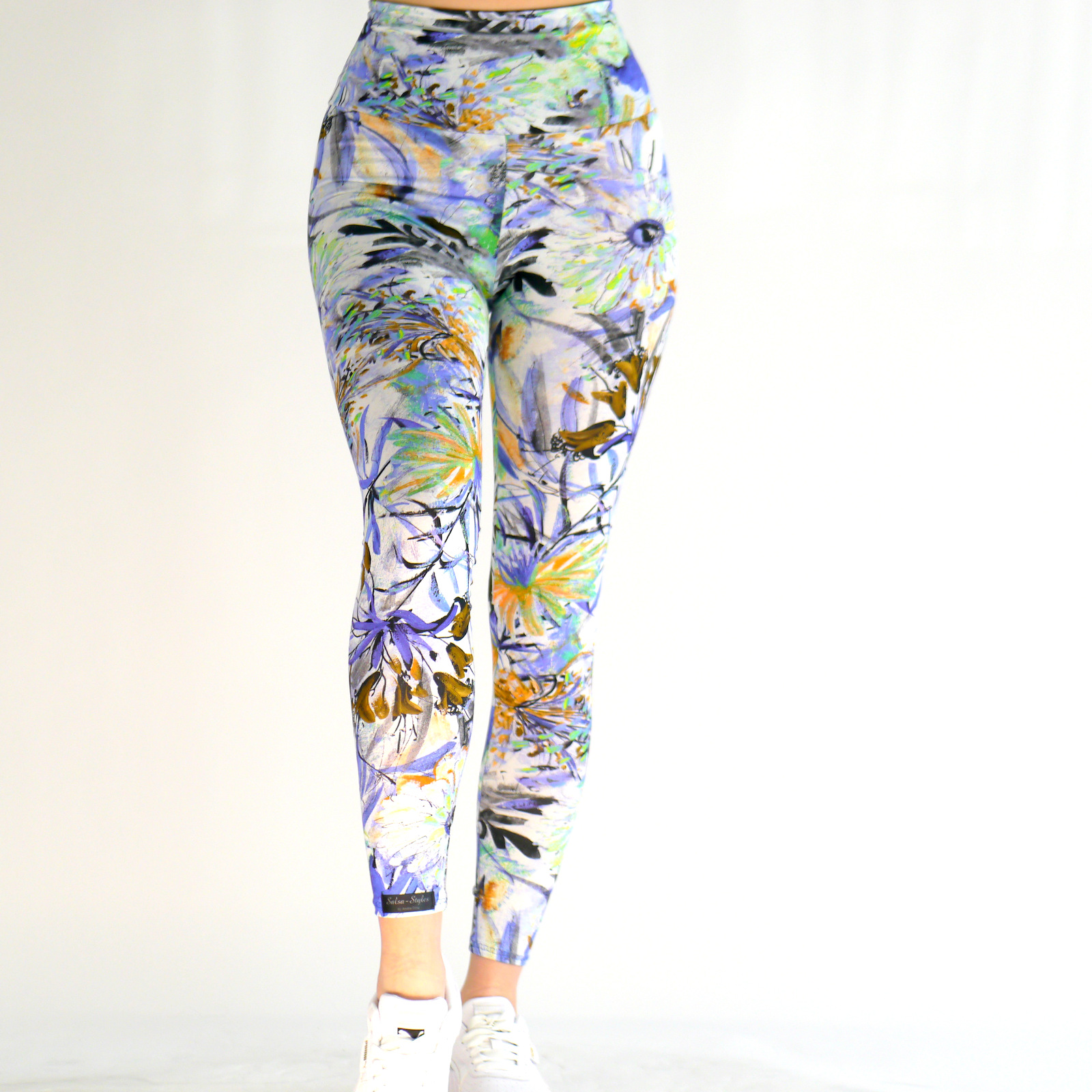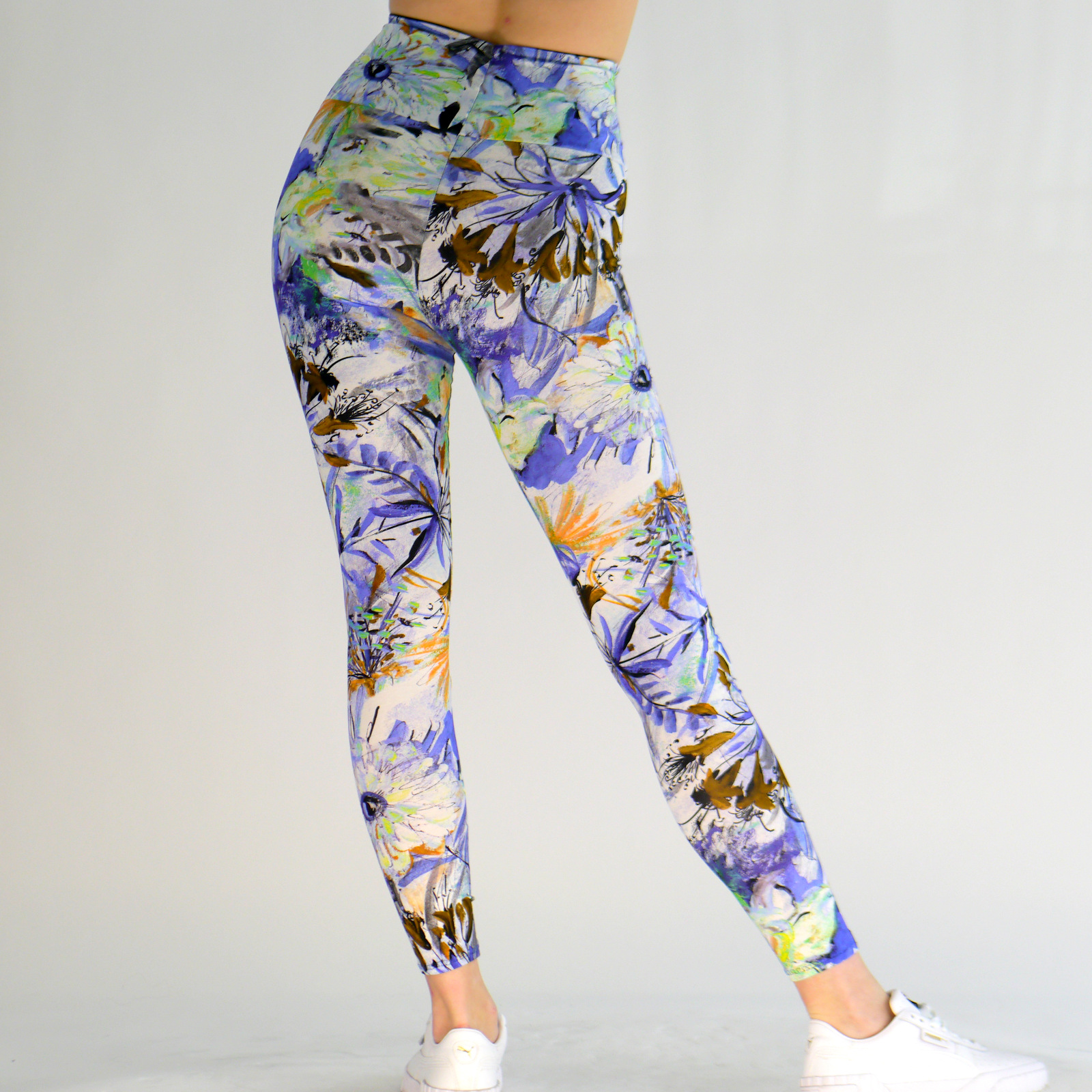 Die Leggings Bratiana ist aus einem hochwertigen Baumwoll-Jersey Stoff gefertigt. Der Stoff besitzt ein hauptsächlich blaues Muster auf weißem Hintergrund. Warme Farbakzente gestelten den Stoff interessanter. Der hohe taillierte Schnitt läst Problemzonen verschwinden und ist durch seine Elastizität super zum Sport geeignet.