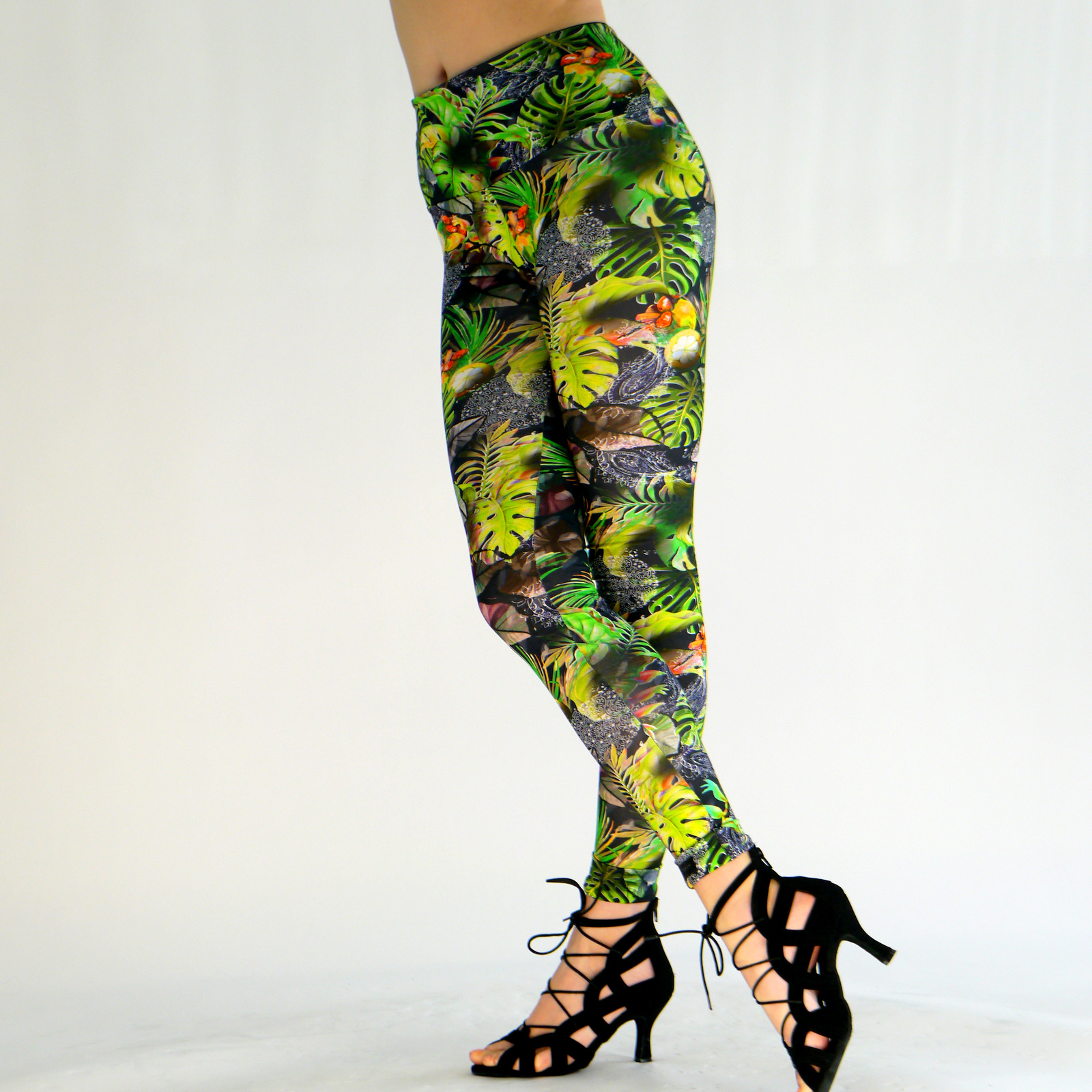 Die Leggings Evamarie ist aus einem hochwertigen Baumwoll-Jersey Stoff gefertigt. Der Stoff besitzt einen grünen Dschungelprint mit weißen,gelben, orangen, roten und braunen Farbakzenten auf schwarzem Hintergrund. Der hohe taillierte Schnitt läst Problemzonen verschwinden und ist durch seine Elastizität super zum Sport geeignet.