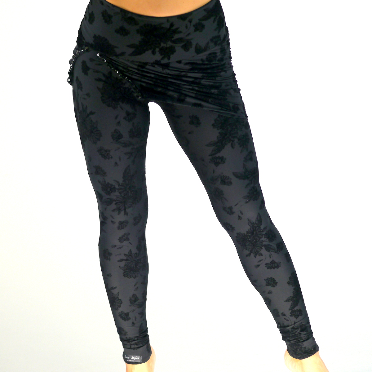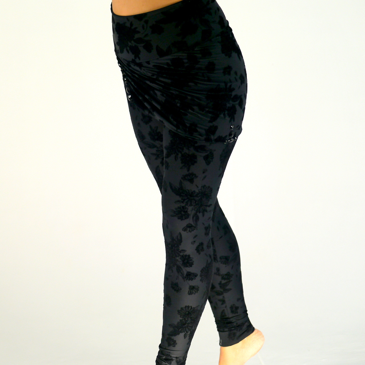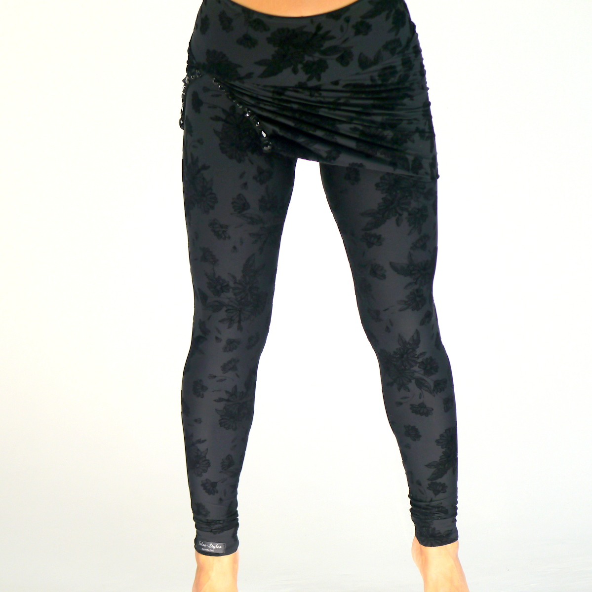 Eine sehr dünne Leggings wie eine Strumpfhose mit integrietem Doppeltrock. Der dünne Lycrastoff ist sehr fein und weich, hat einen leichten glanz und einen schönen Samtmuster drauf. Der Bund ist aus einem festeren Lycrastoff und macht somit auch einen flachen Bauch. Der Rock hat in der Seite handgenähte Strass Steine und Perlen in verschiedenen Formen und Größen.