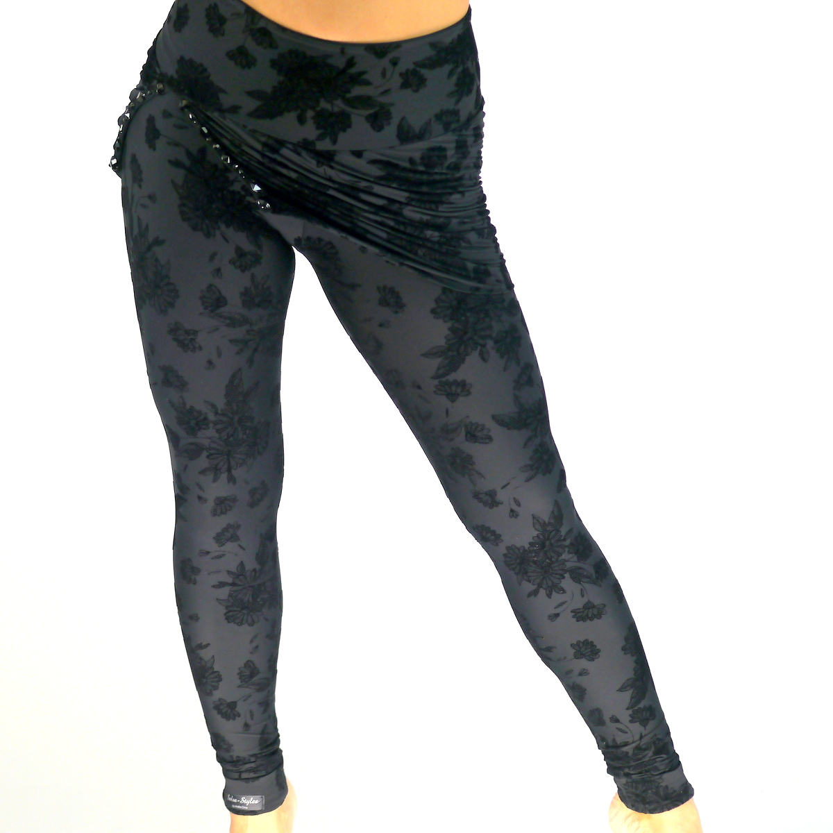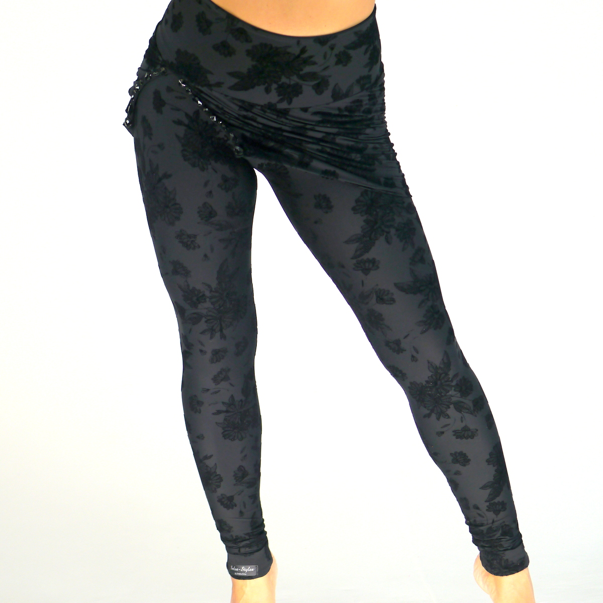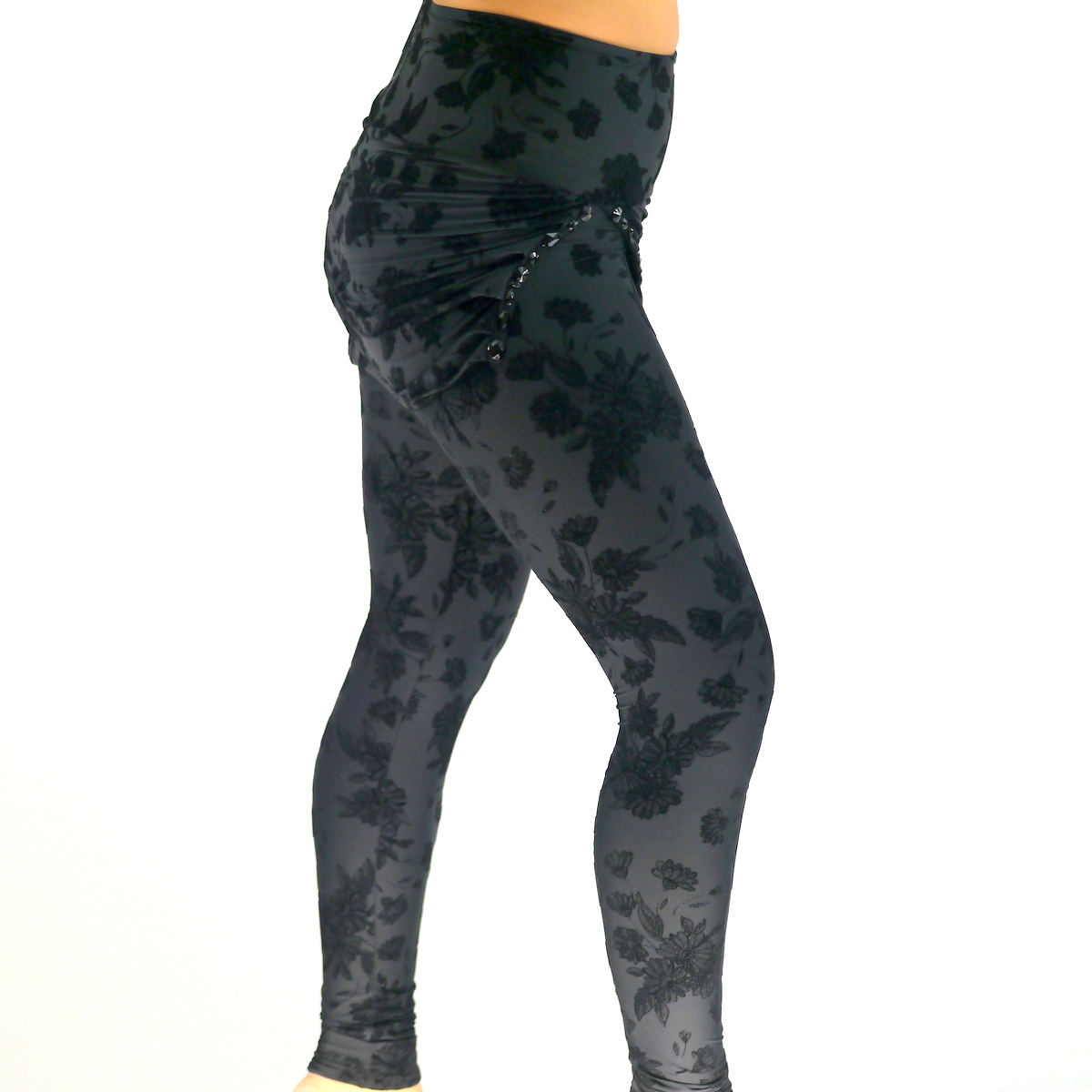 Eine sehr dünne Leggings wie eine Strumpfhose mit integrietem Doppeltrock. Der dünne Lycrastoff ist sehr fein und weich, hat einen leichten glanz und einen schönen Samtmuster drauf. Der Bund ist aus einem festeren Lycrastoff und macht somit auch einen flachen Bauch. Der Rock hat in der Seite handgenähte Strass Steine und Perlen in verschiedenen Formen und Größen.