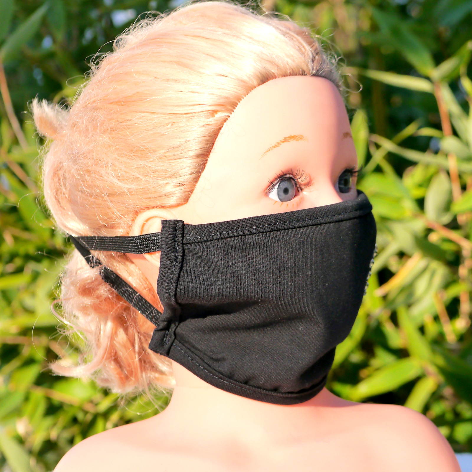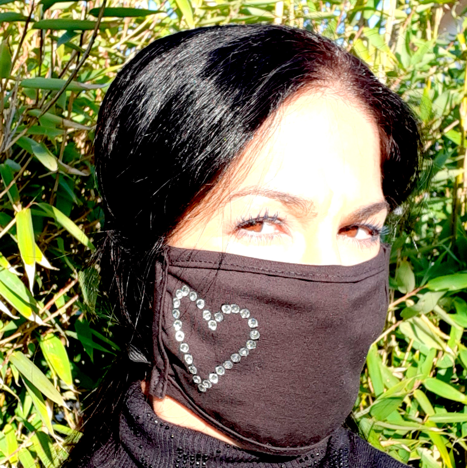 Mund und Nasen Maske aus Baumwolle+Elasthan mit Strass Steine. Die Maske ist dreilagig: vorne Baumwolle, in der Mitte dünnen Einlage aus Viskose und am Mund wieder Baumwolle.