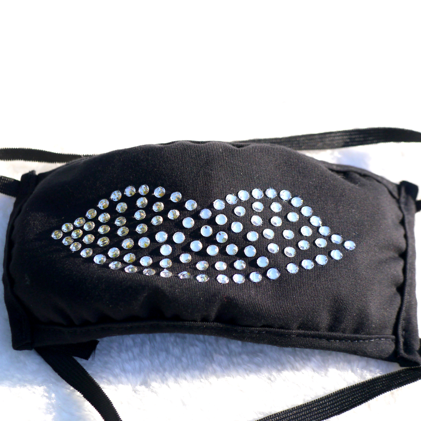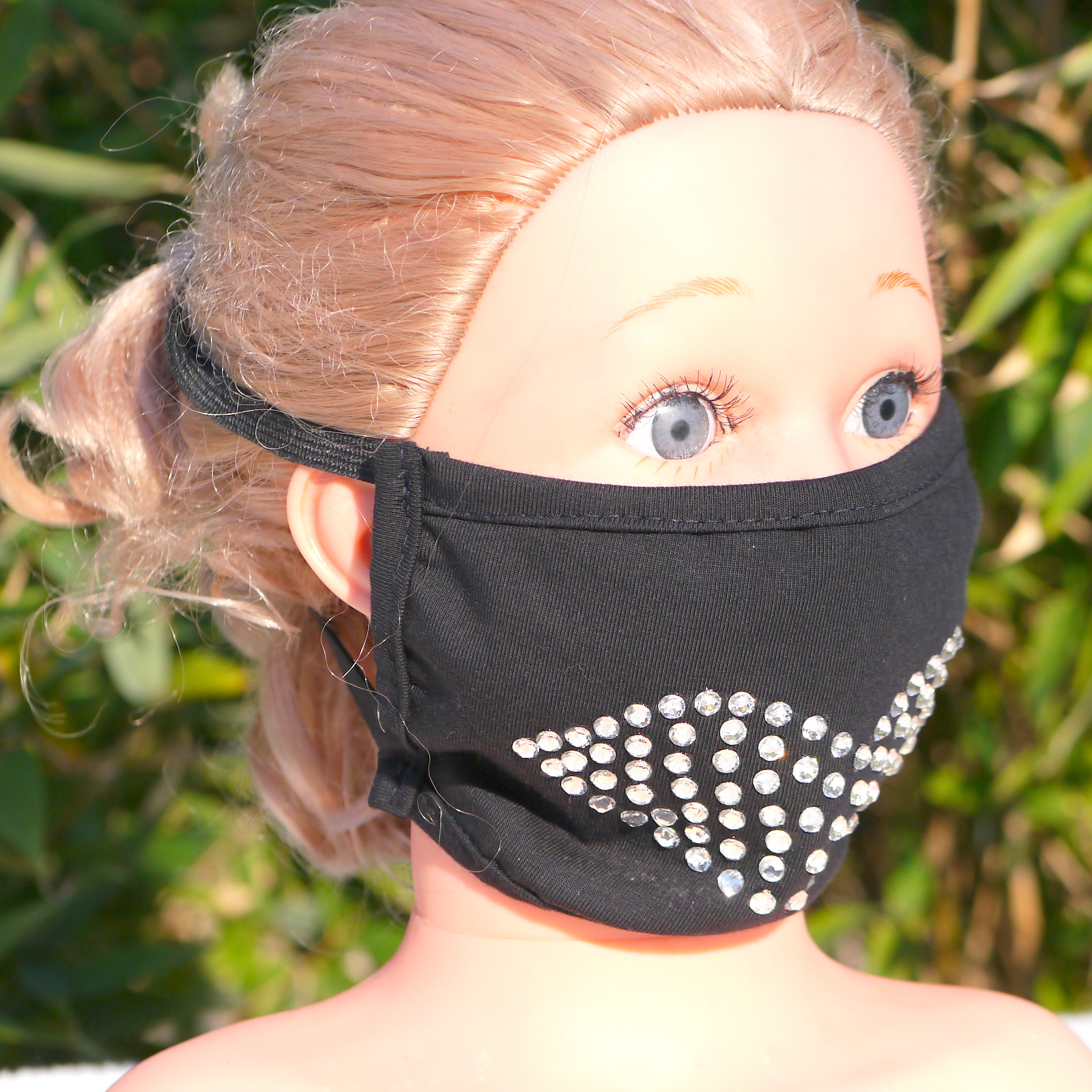 Mund und Nasen Maske aus Baumwolle+Elasthan mit Strass Steine. Die Maske ist dreilagig: vorne Baumwolle, in der Mitte dünnen Einlage aus Viskose und am Mund wieder Baumwolle.