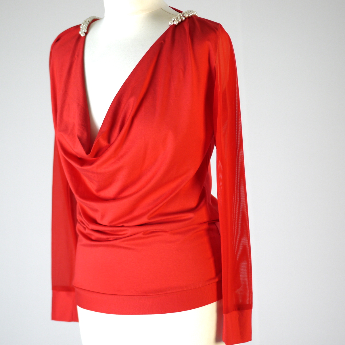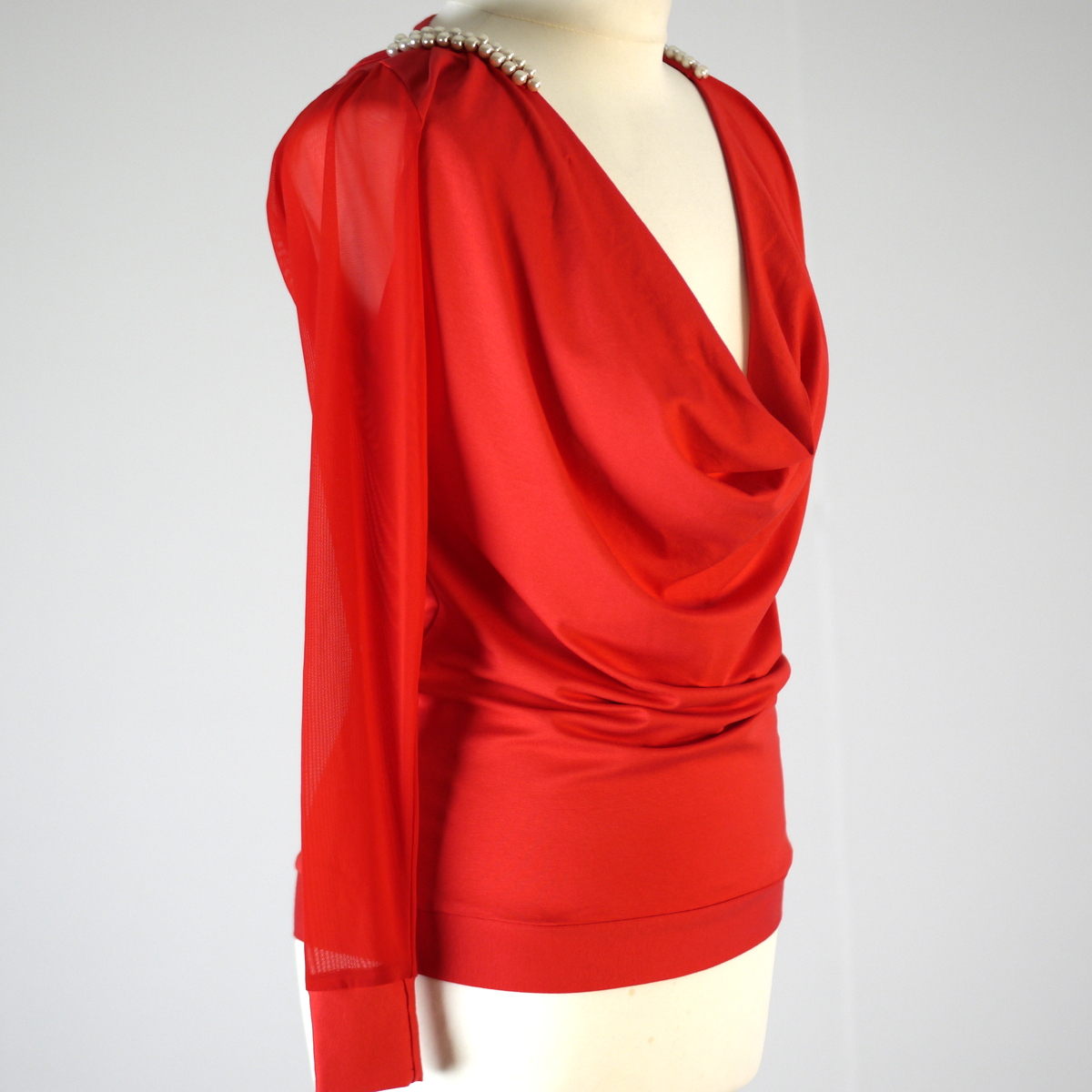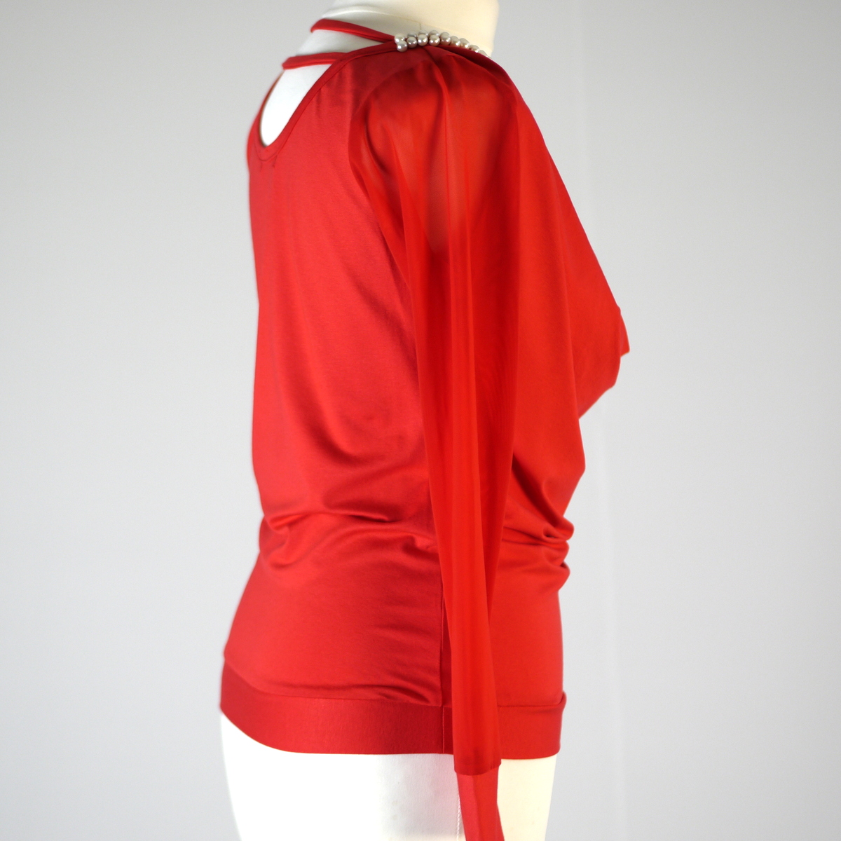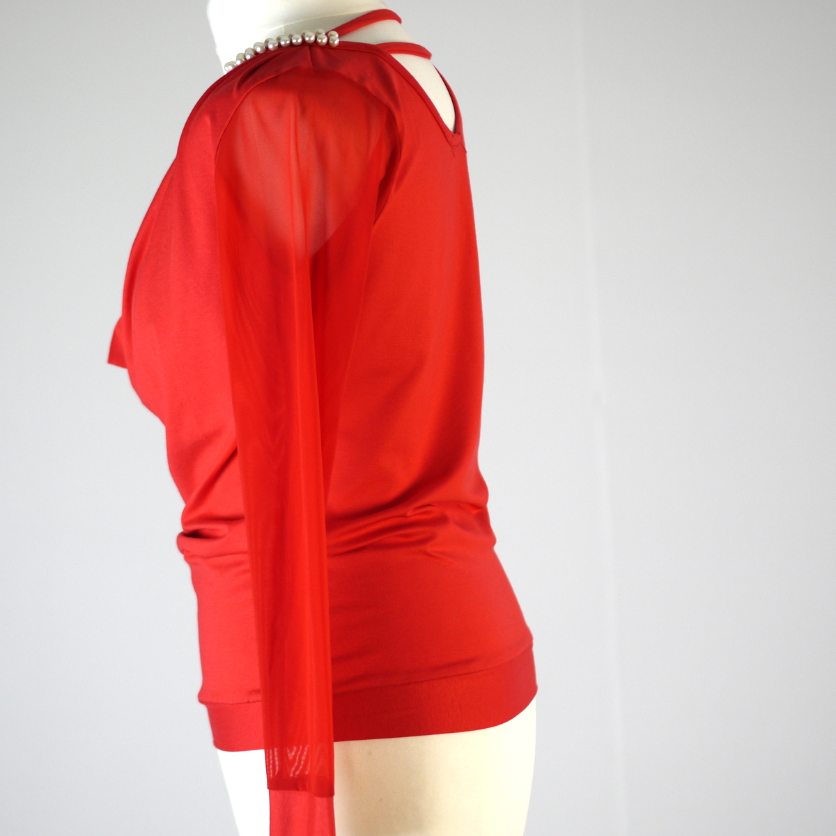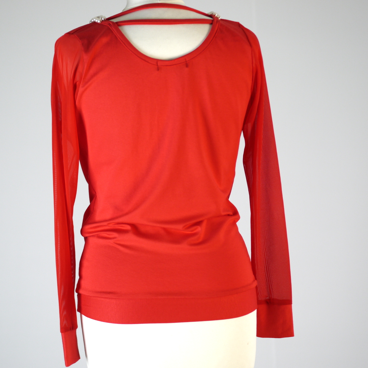 Oberteil aus Viskosejersey Stoff mit Netz Ärmeln. Auf dem Schultern sind weiße Perlen.