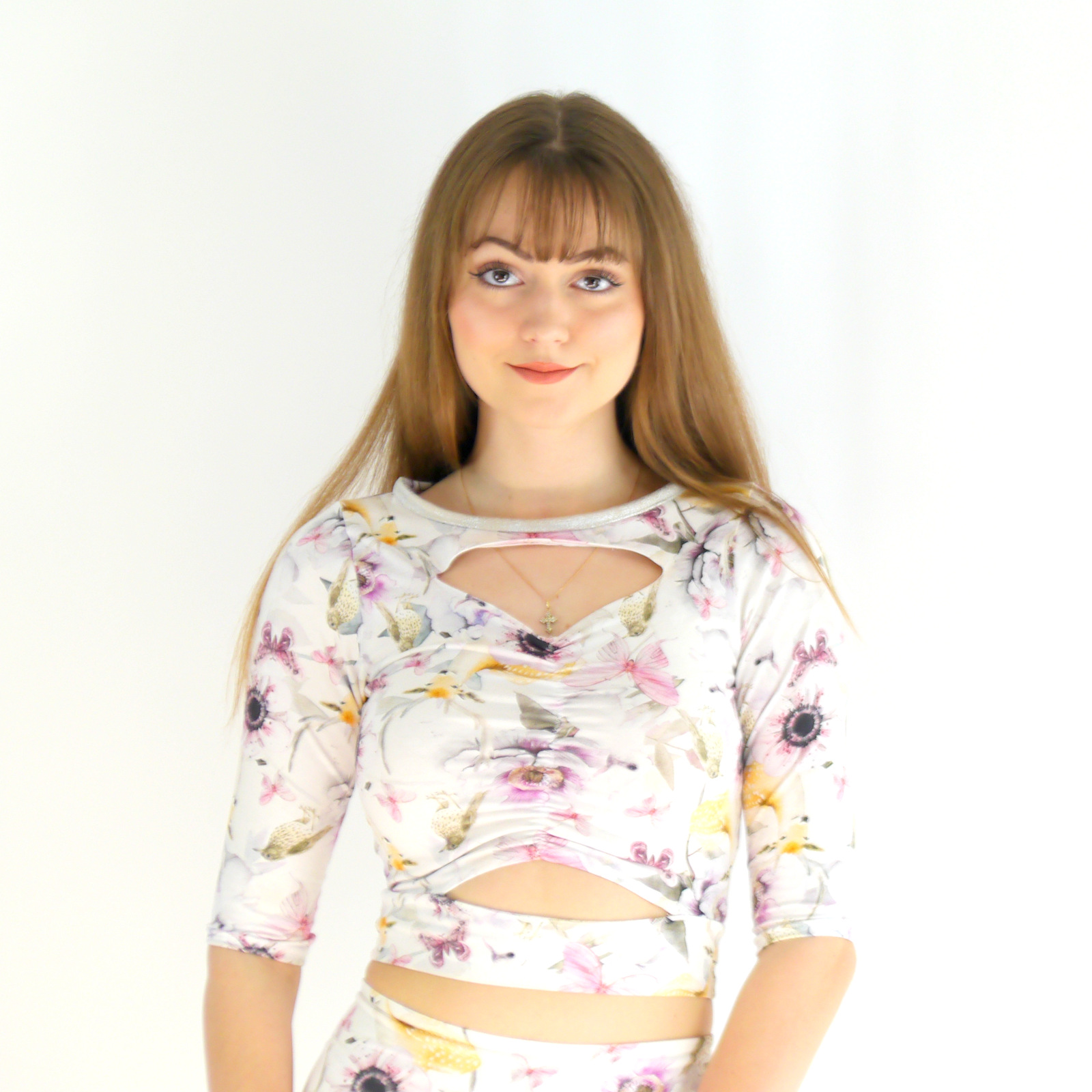 Das Oberteil Gerda ist aus einem hochwertigen Baumwoll-Jersey Stoff mit großem Blumenprint gefertigt. Der Stoff besitzt eine weiße Grundfarbe mit pastelfarbenden Naturmotiven in lila, grün und gelb Tönen bedruckt. Ein Cut Out am Dekoltee und an der Tailie sowie der bauchfreier Schnitt sind besonders figurbetonend. Halblange Ärmel schmeicheln den Armen.