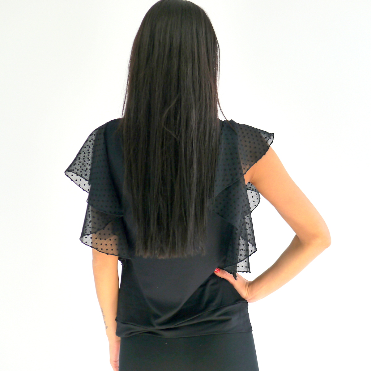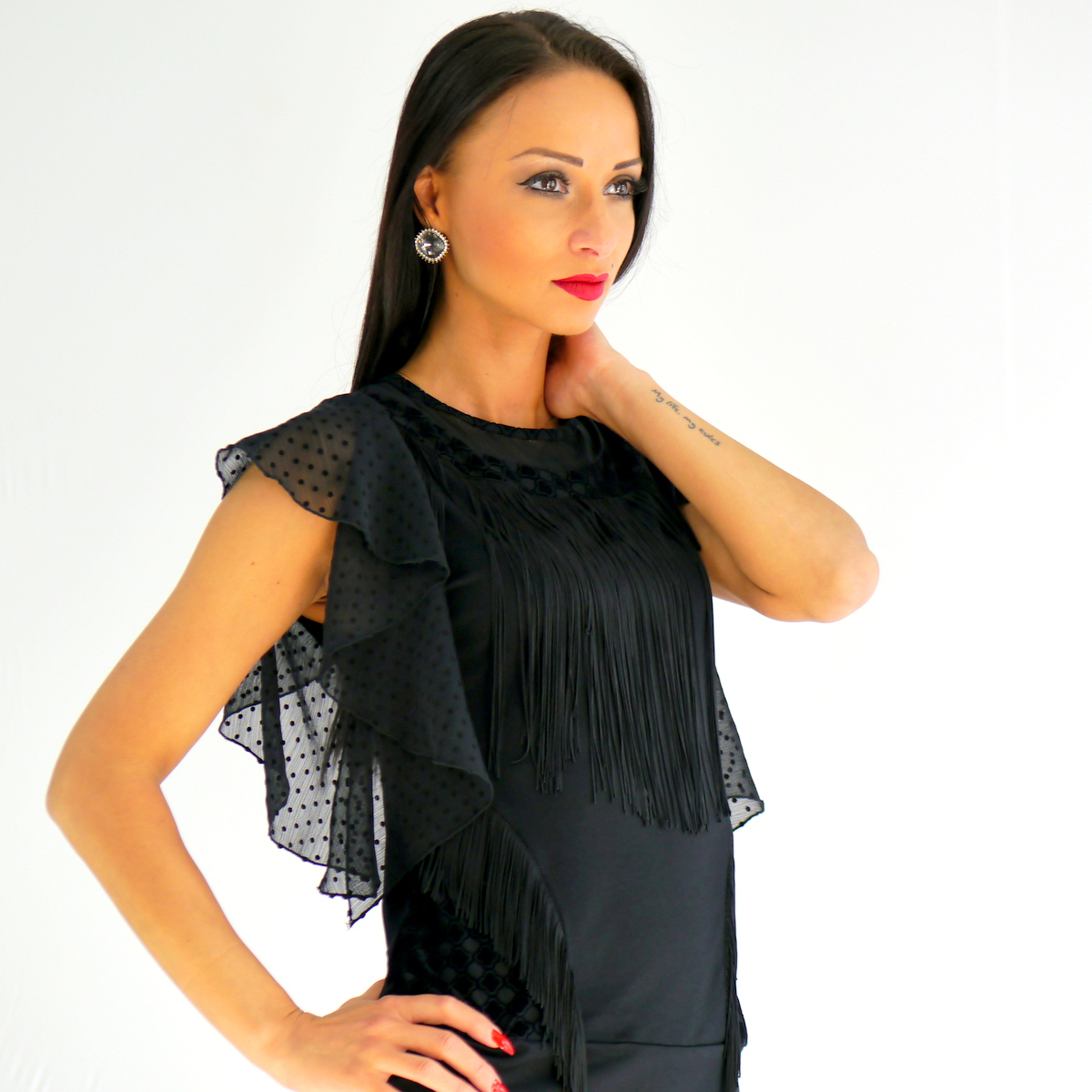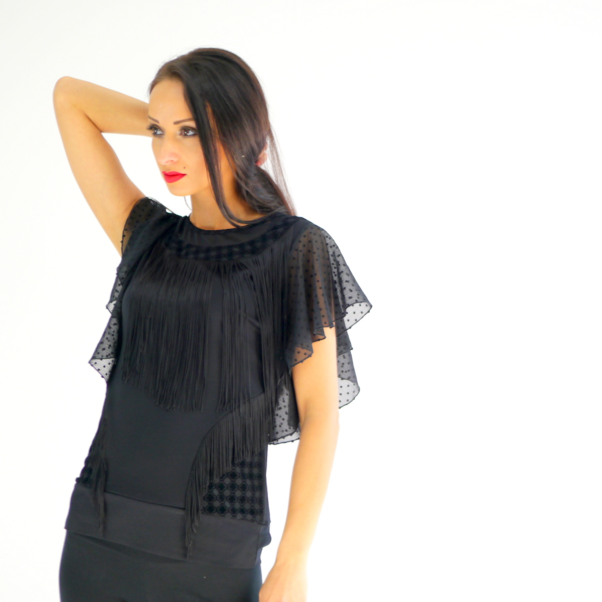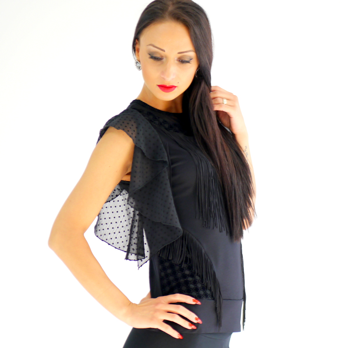 Super schöne Bluse aus Baumwolljersey ( 95% Baumwolle + 5% Elasthan ) ist elastisch und bequem verziert mit Fransen. Die Rüschen auf dem Schultern sind aus Chiffon.