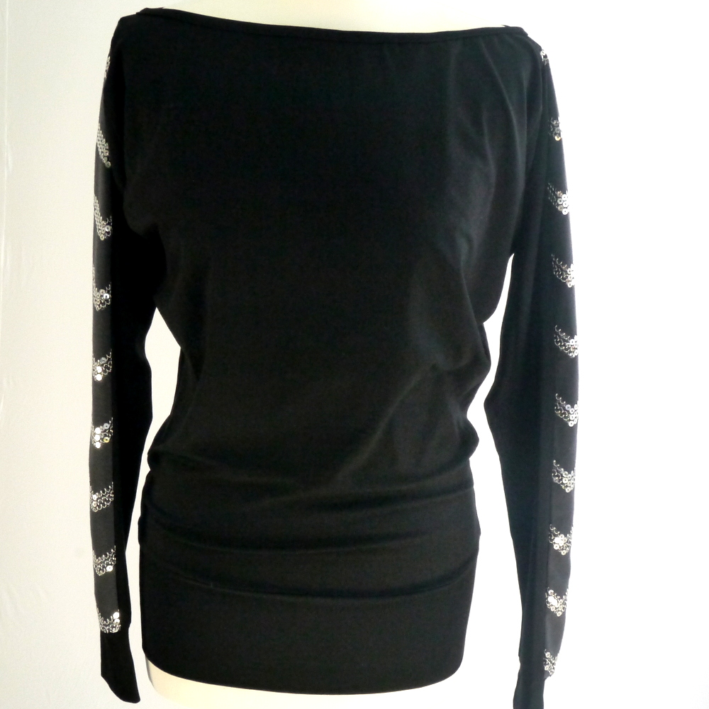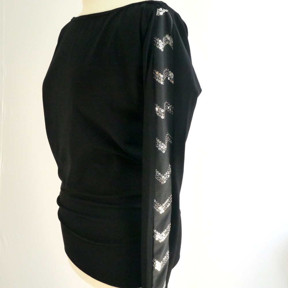 Weiches, schmal geschnittenes Oberteil aus schwarzem Jersey-Material mit grau-silberner Paillettenstoff auf dem Ärmeln.