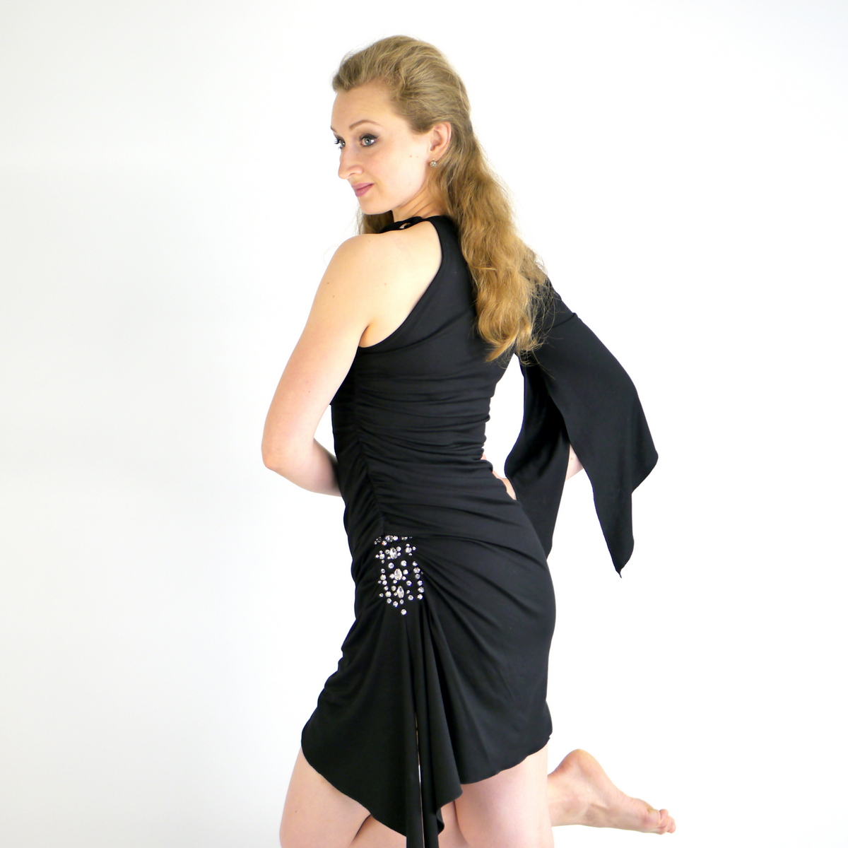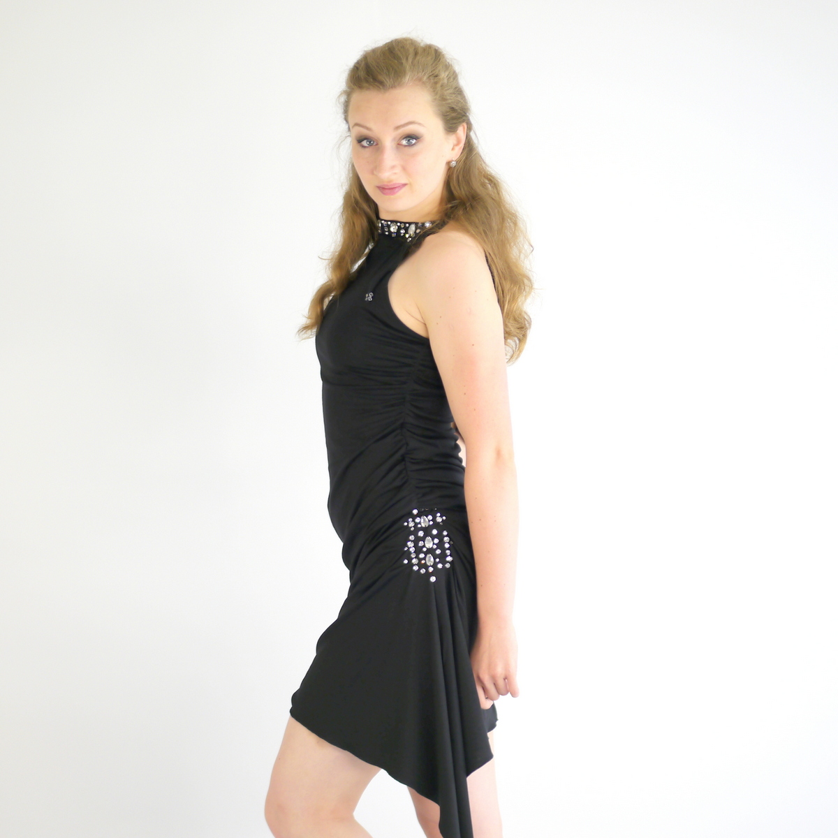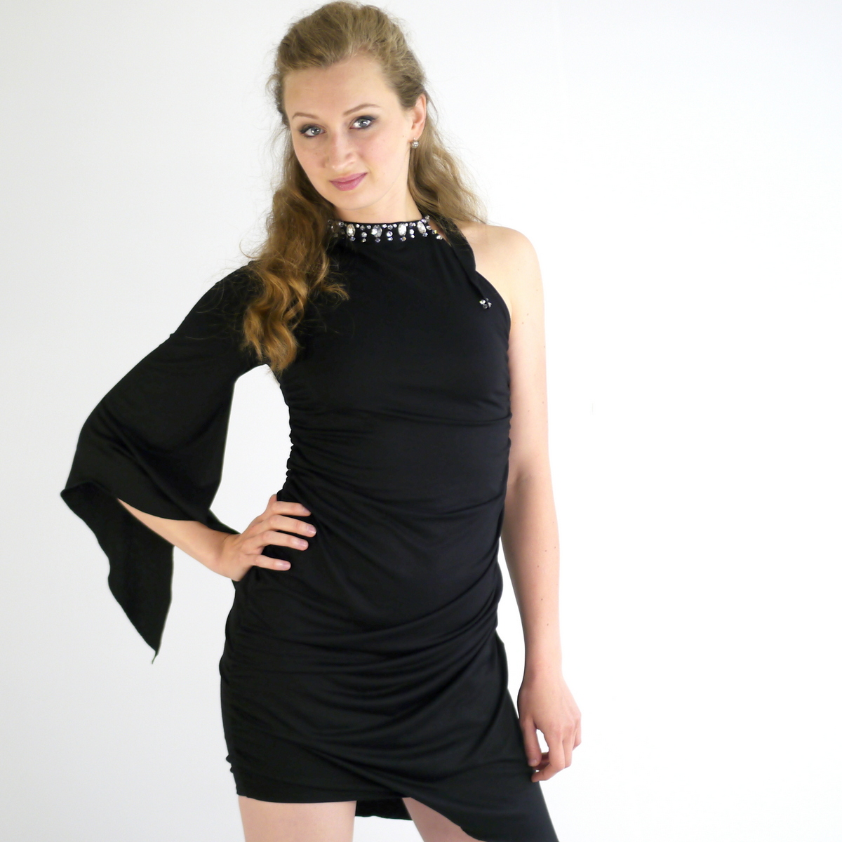 Ein Asymmetrisches Kleid aus Baumwolle mit eingebauten shapewear, strafft Bauch, Taille, Hüften und Oberschenkel und lässt Sie stralend aussehen. Auf der linken Hüfte und am Hals hat das Kleid Handgenähte Swarovski Strass Steine und Swarovski Perlen.
