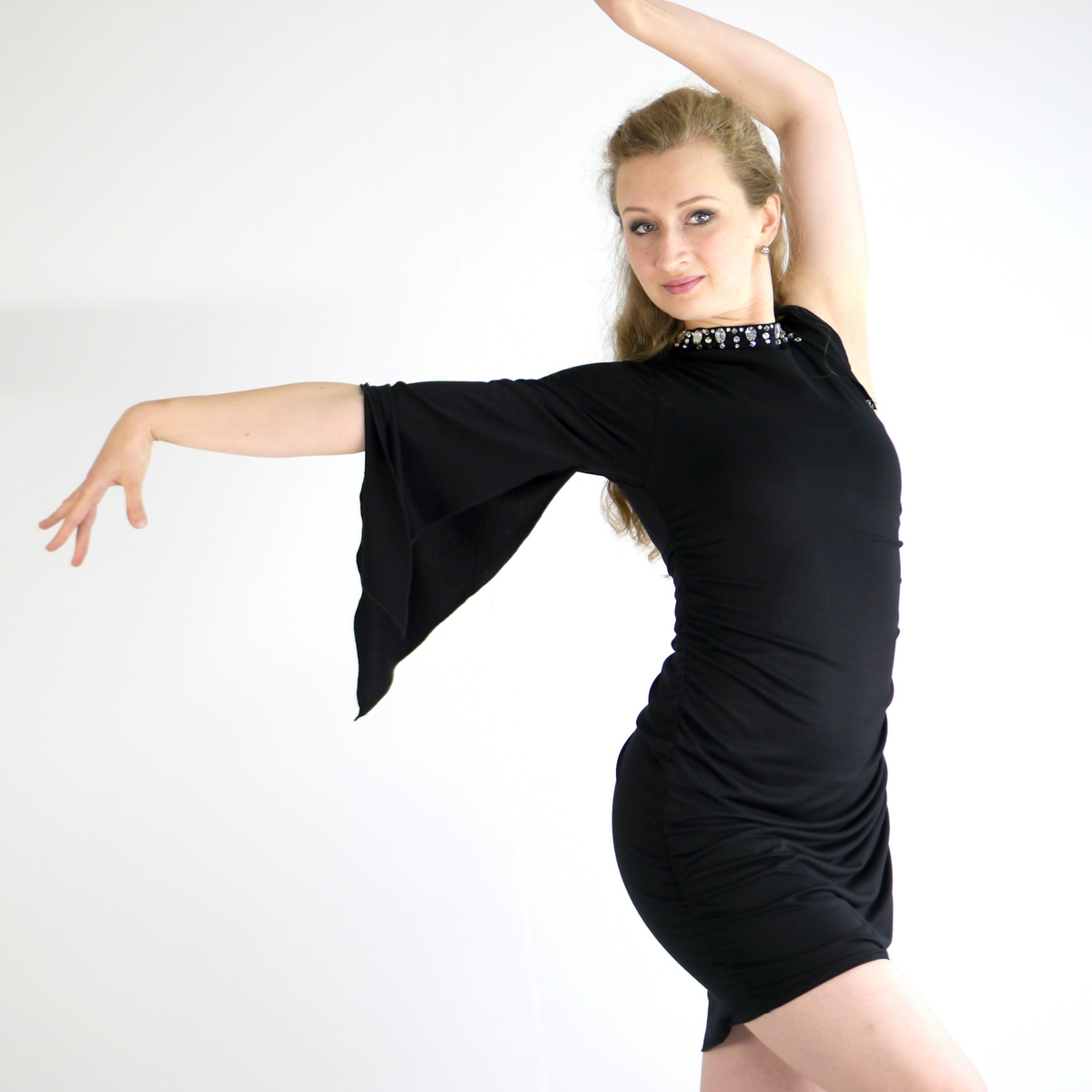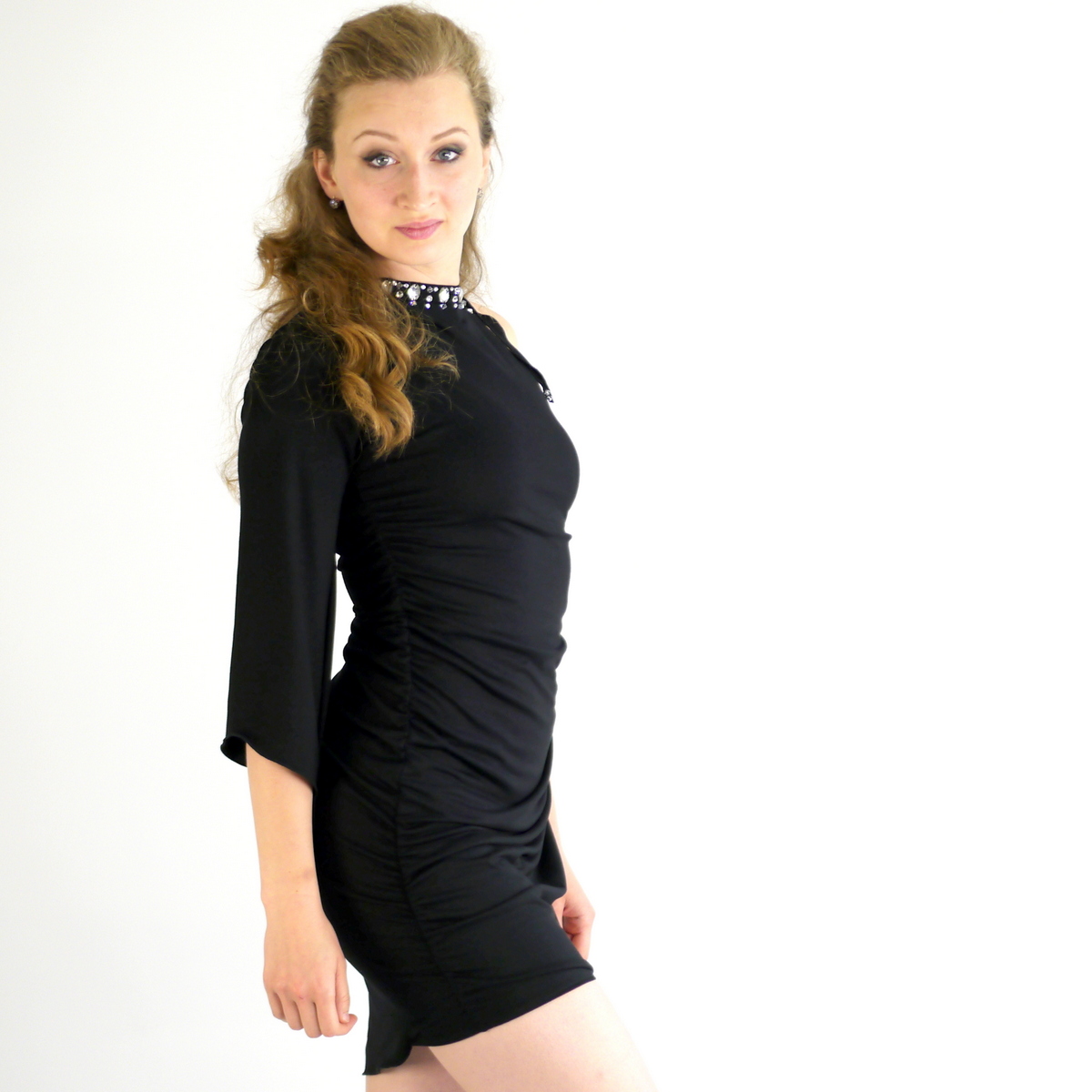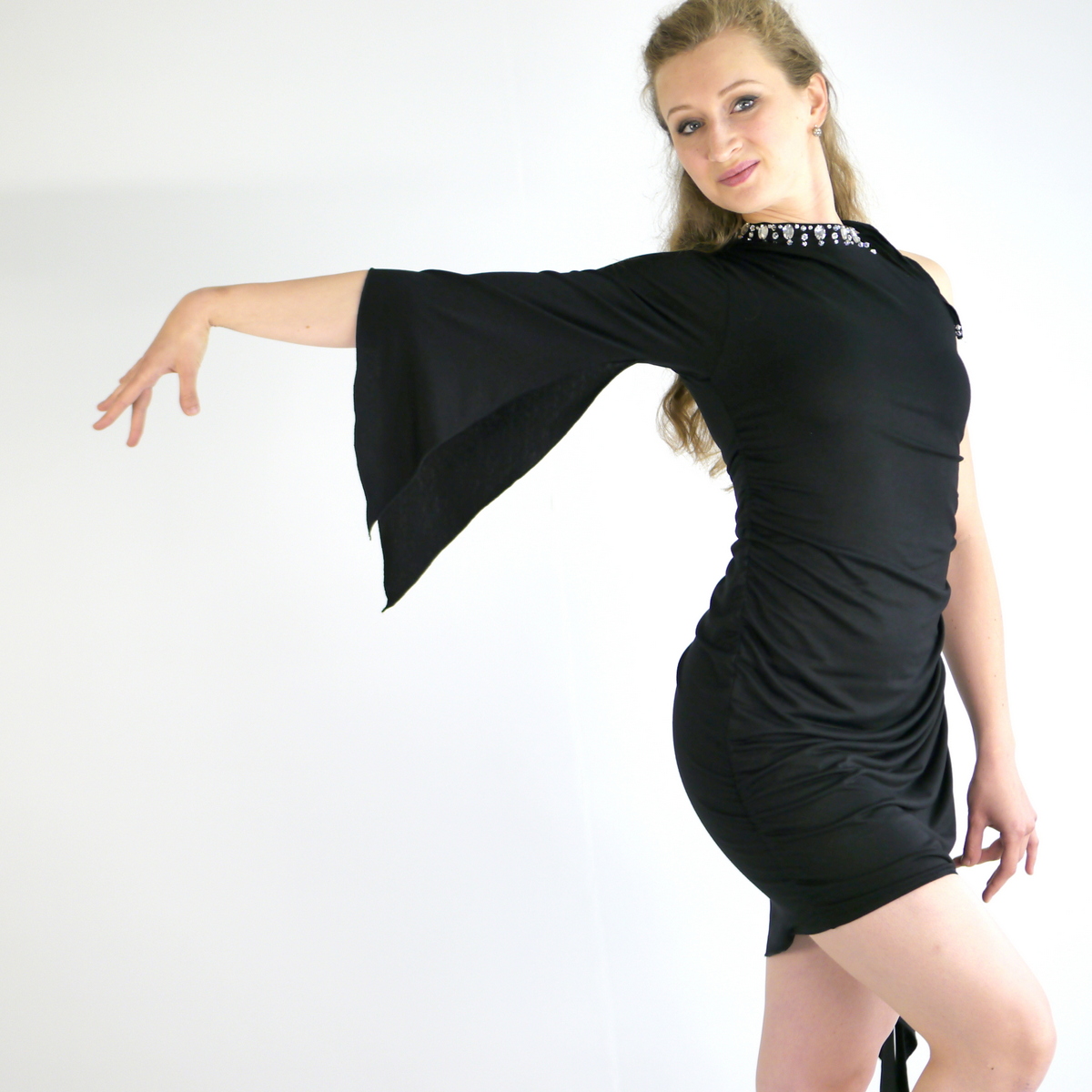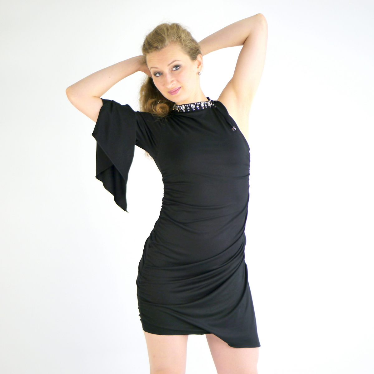 Ein Asymmetrisches Kleid aus Baumwolle mit eingebauten shapewear, strafft Bauch, Taille, Hüften und Oberschenkel und lässt Sie stralend aussehen. Auf der linken Hüfte und am Hals hat das Kleid Handgenähte Swarovski Strass Steine und Swarovski Perlen.