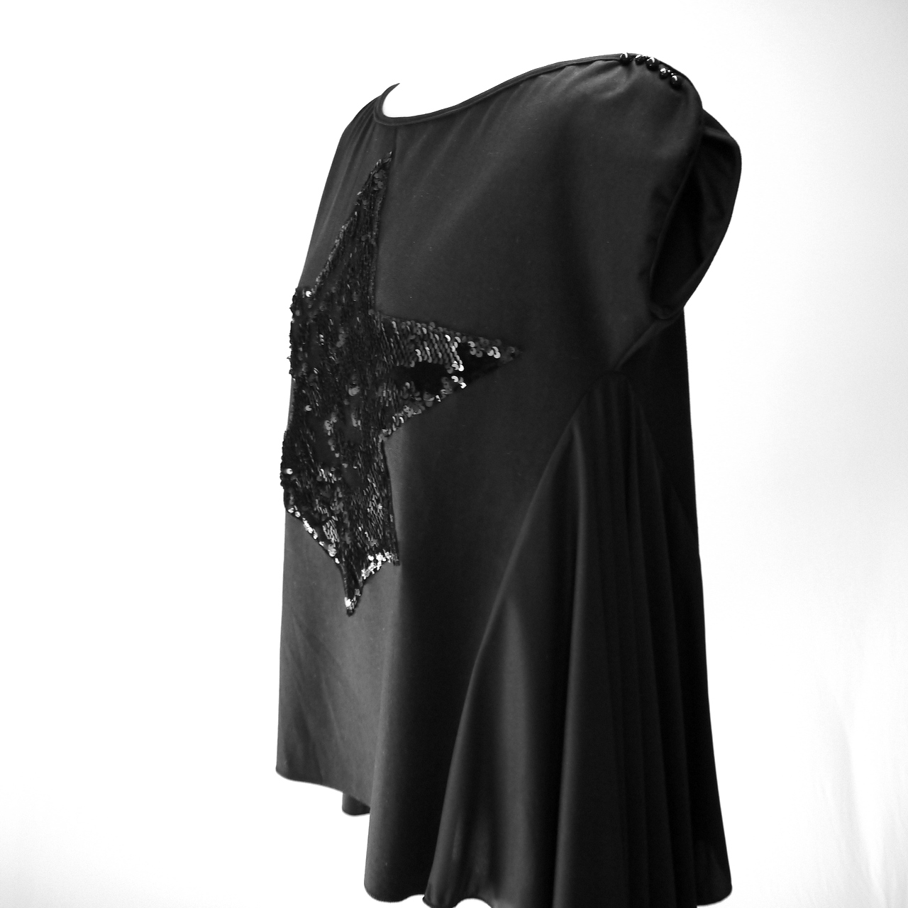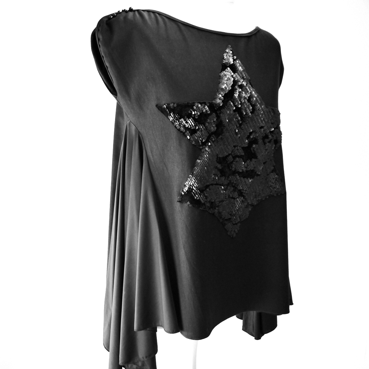 Baumwoll Oberteil mit einen schwarzen Pailletten Stern. Das Oberteil hat in beiden Seiten einen dünnen Lycrastoff der etwas länger und sorgt für Bewegungsfreiheit.