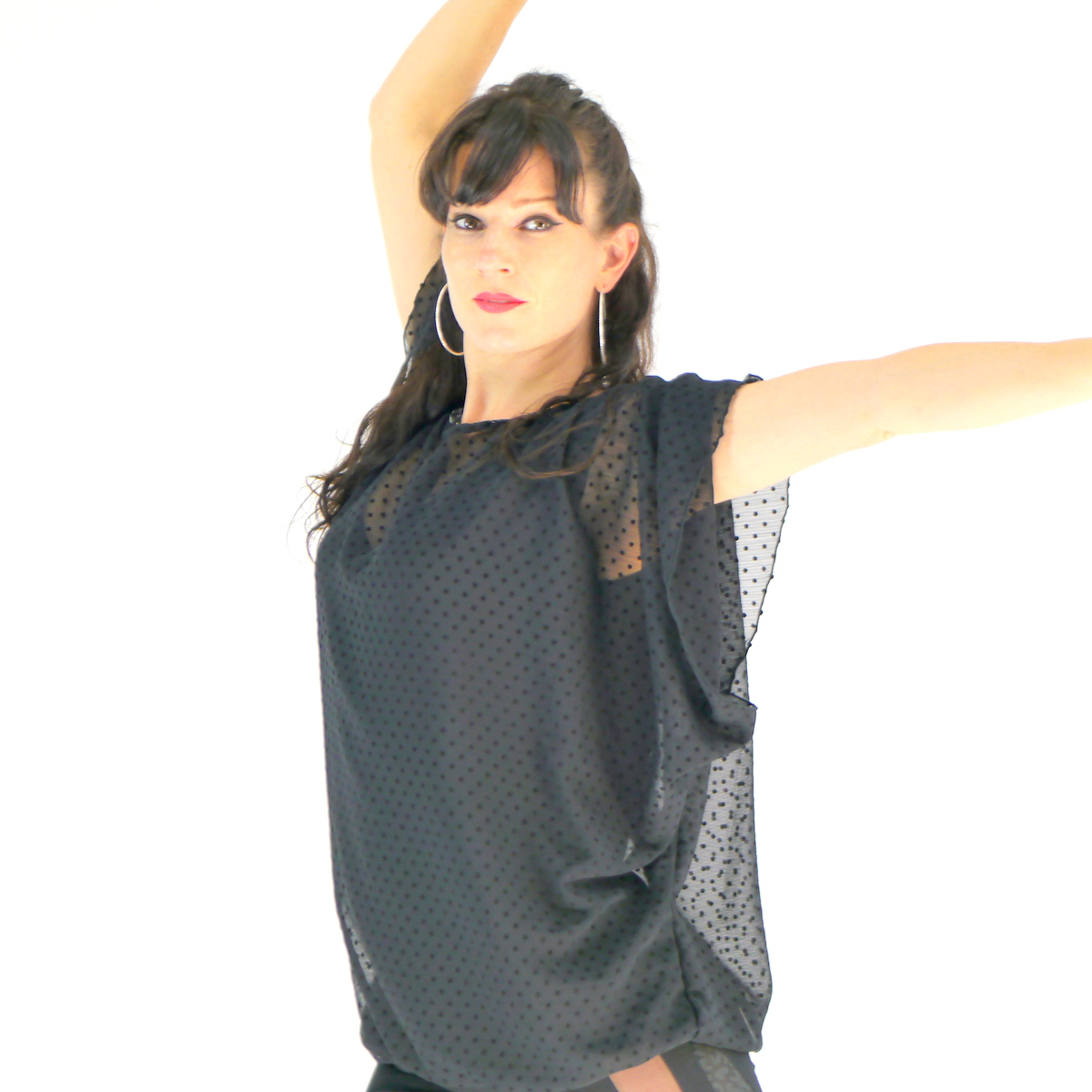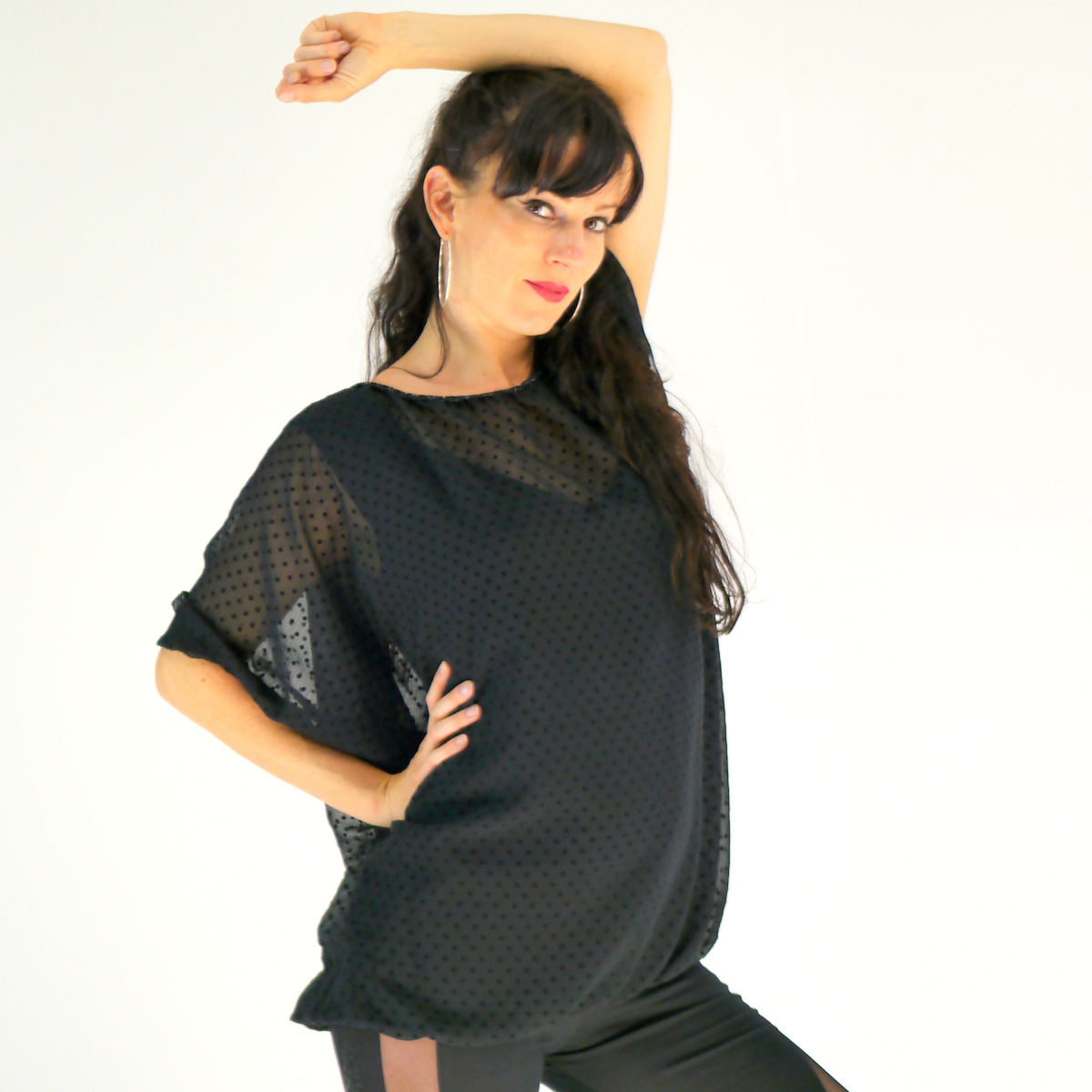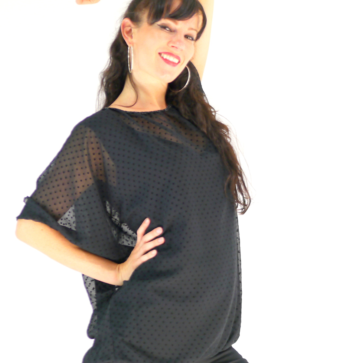 Schwarzes Oberteil aus Chiffon beflockt mit Punkte