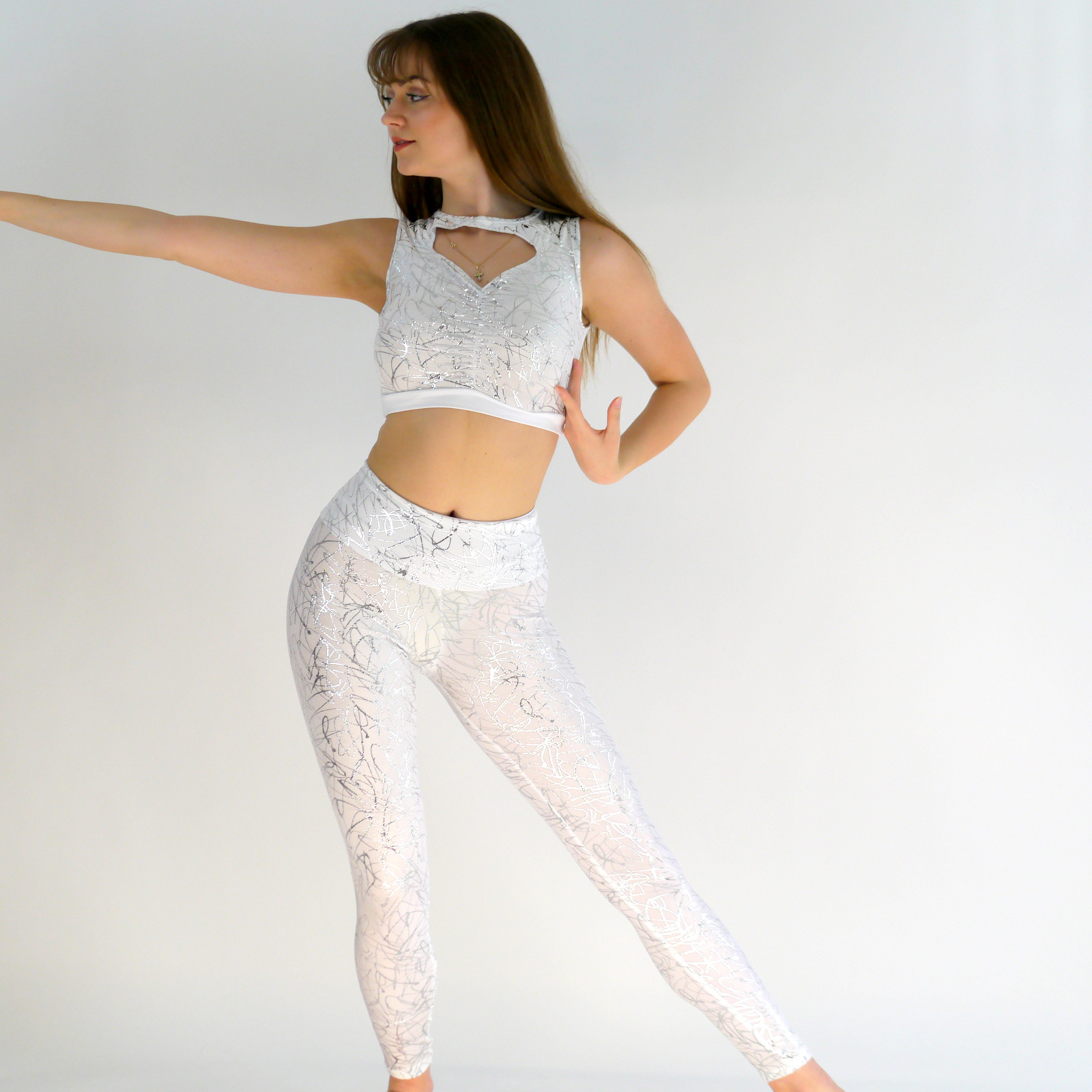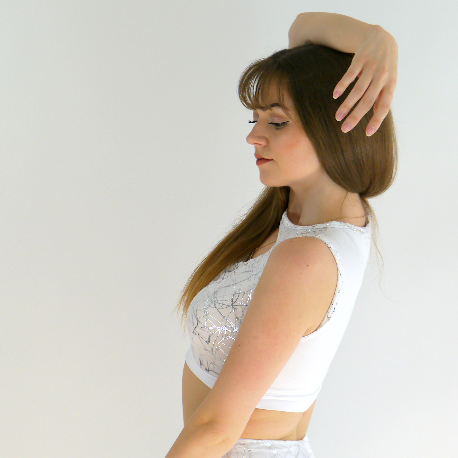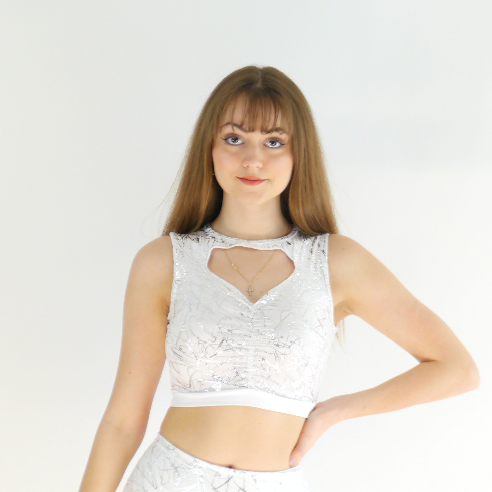 Das Top Samt Silber ist aus einem weißen Samtstoff mit silbernen Wirbeln gefertigt. Auf der Außenseite samtweich ist er innen glatt und auch an warmen Tagen super zu tragen. Ein Cut Out im Dekoltee und bauchfreier Schnitt sind besonders figurbetonend.
