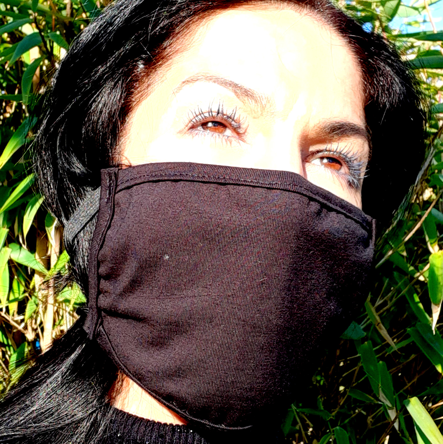 Mund und Nasen Maske aus Baumwolle+Elasthan. Die Maske ist waschbar und mehrfach verwendbar, ist dreilagig: vorne Baumwolle, in der Mitte dünnen Einlage aus Viskose und am Mund wieder Baumwolle.