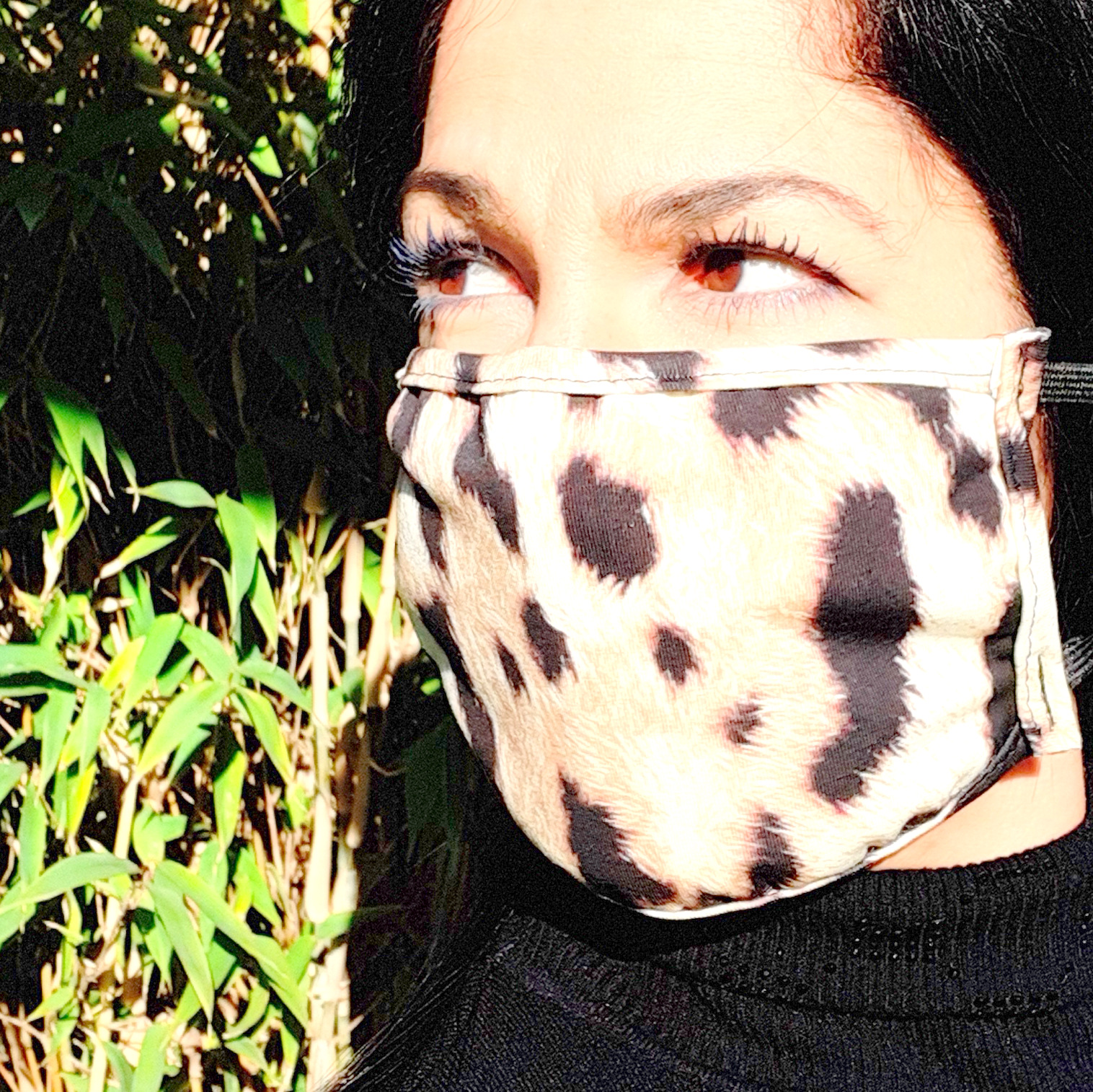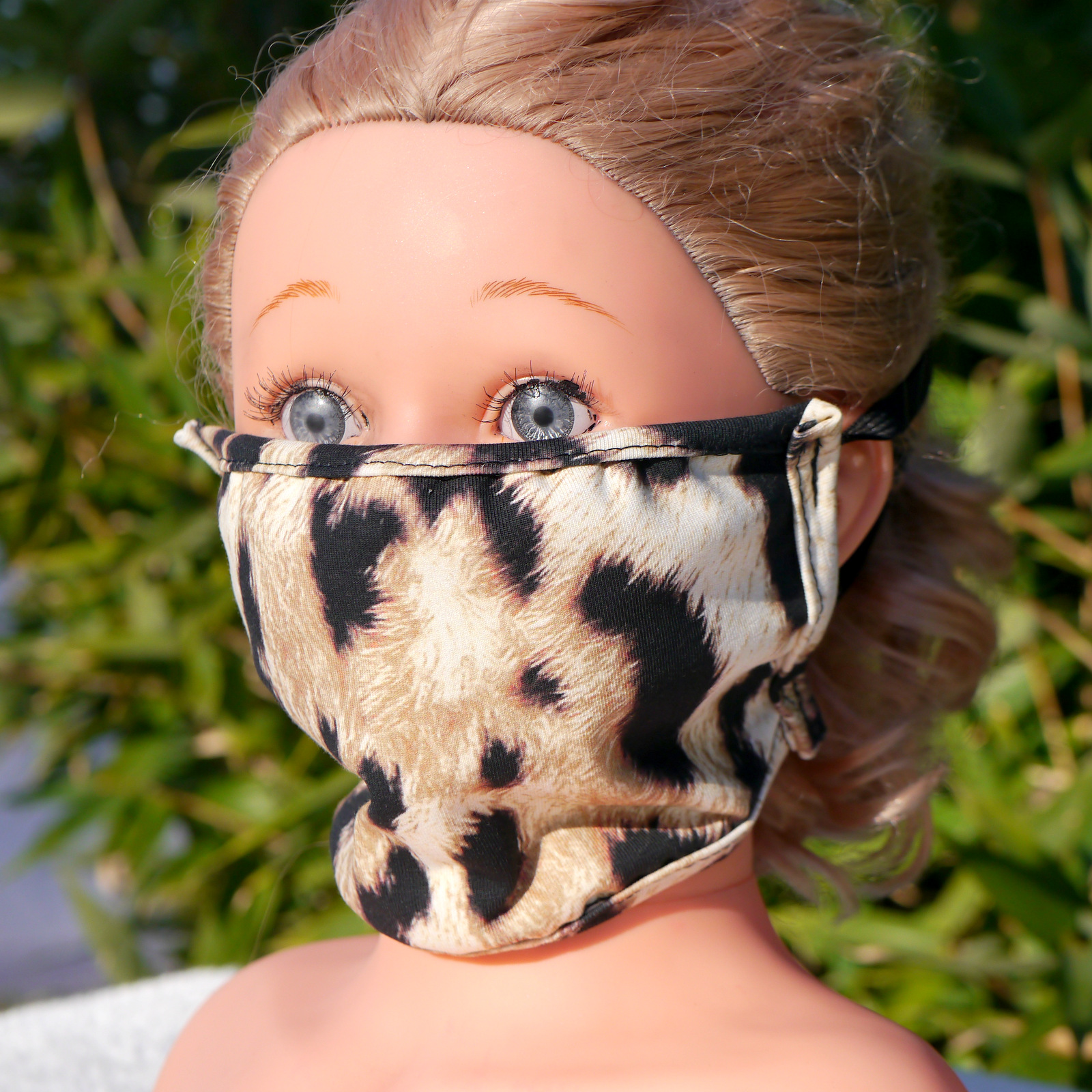 Mund und Nasen Maske aus Baumwolle+Elasthan. Die Maske ist waschbar und mehrfach verwendbar, die ist dreilagig: vorne Baumwolle, in der Mitte dünnen Einlage aus Viskose und am Mund wieder Baumwolle.