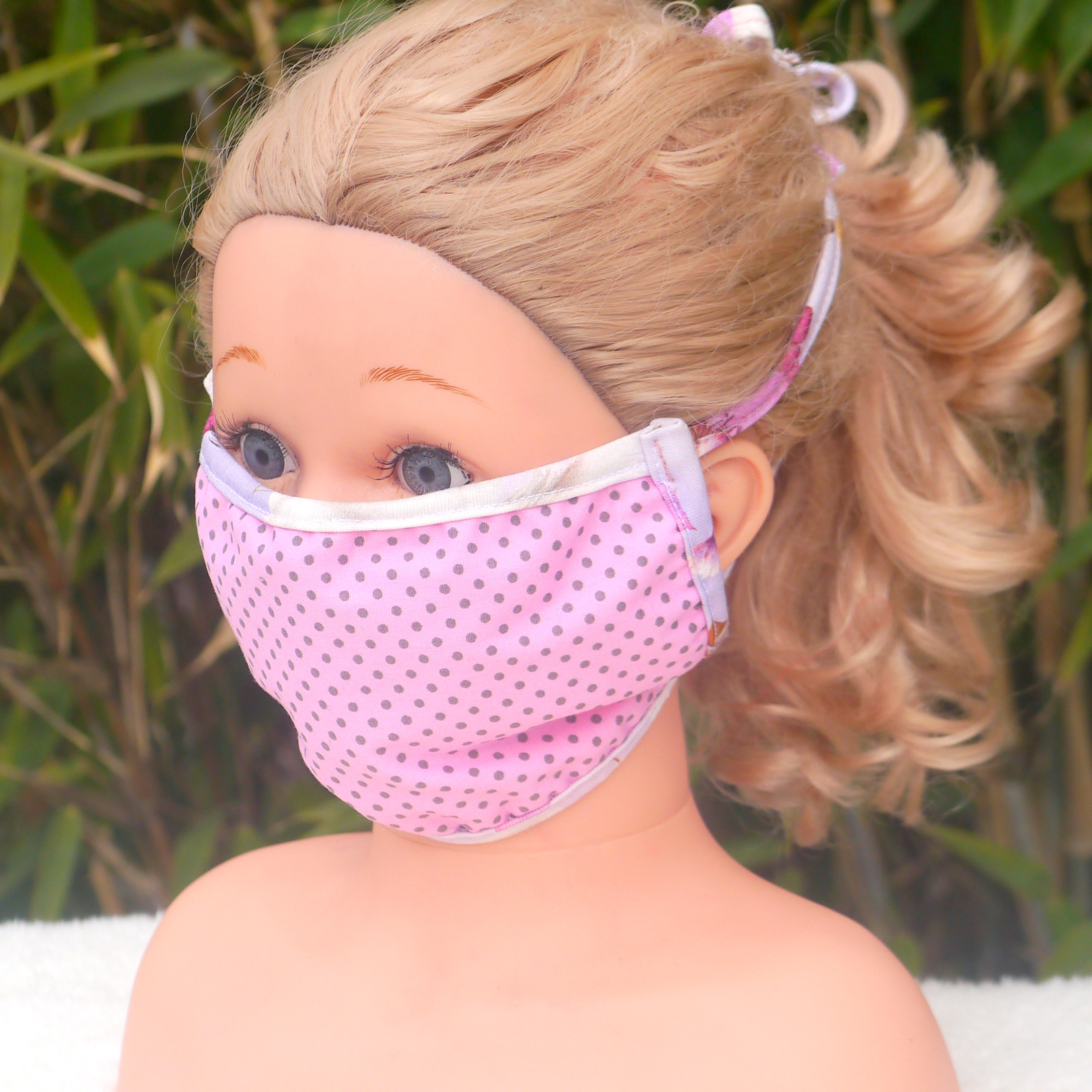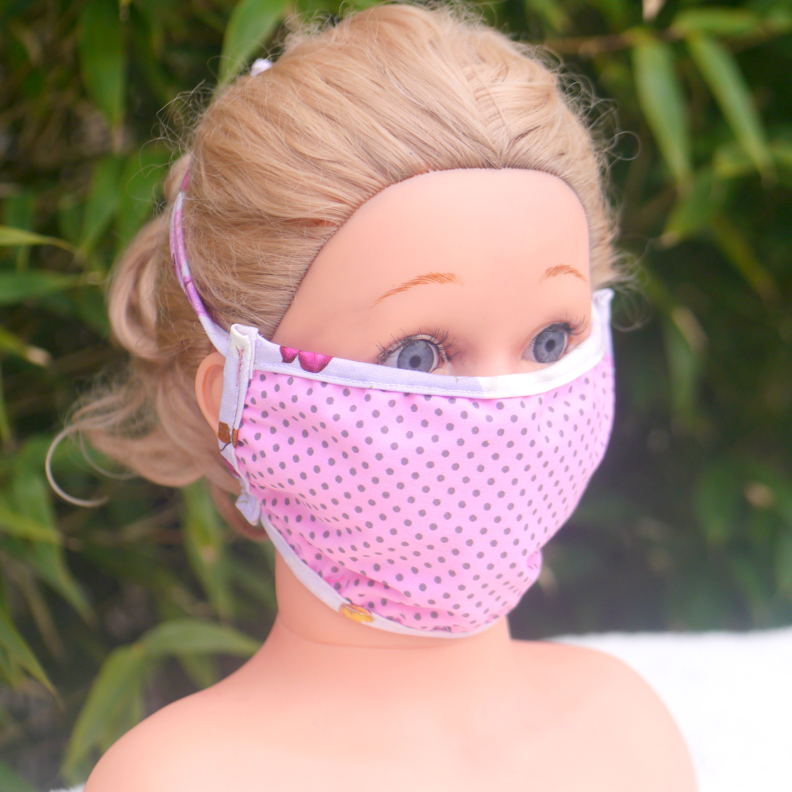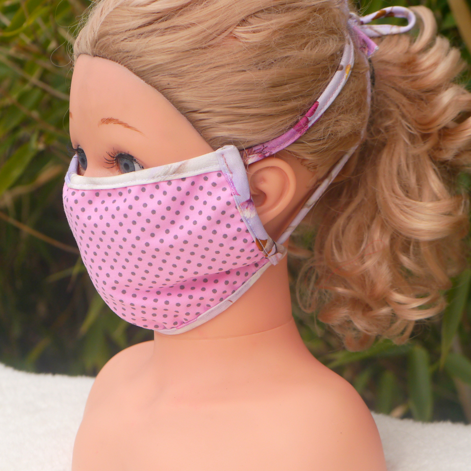 Mund und Nasen Maske aus Baumwolle für Kinder und Erwachsene. Die Maske ist waschbar und mehrfach verwendbar, ist dreilagig: vorne Baumwolle, in der Mitte dünnen Einlage aus Viskose und am Mund wieder Baumwolle.