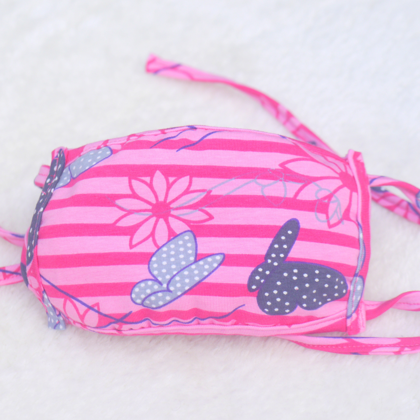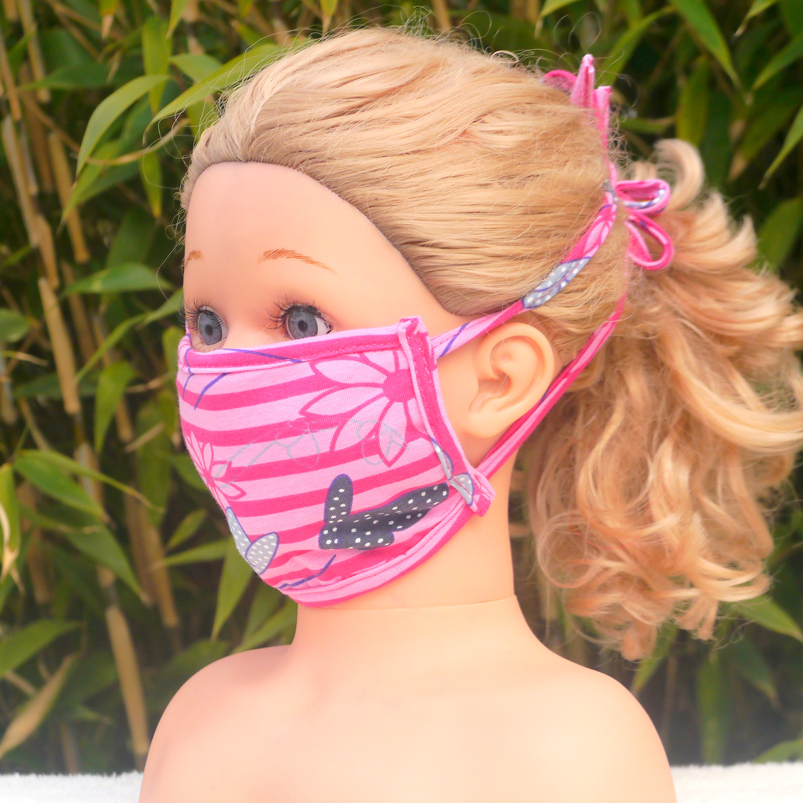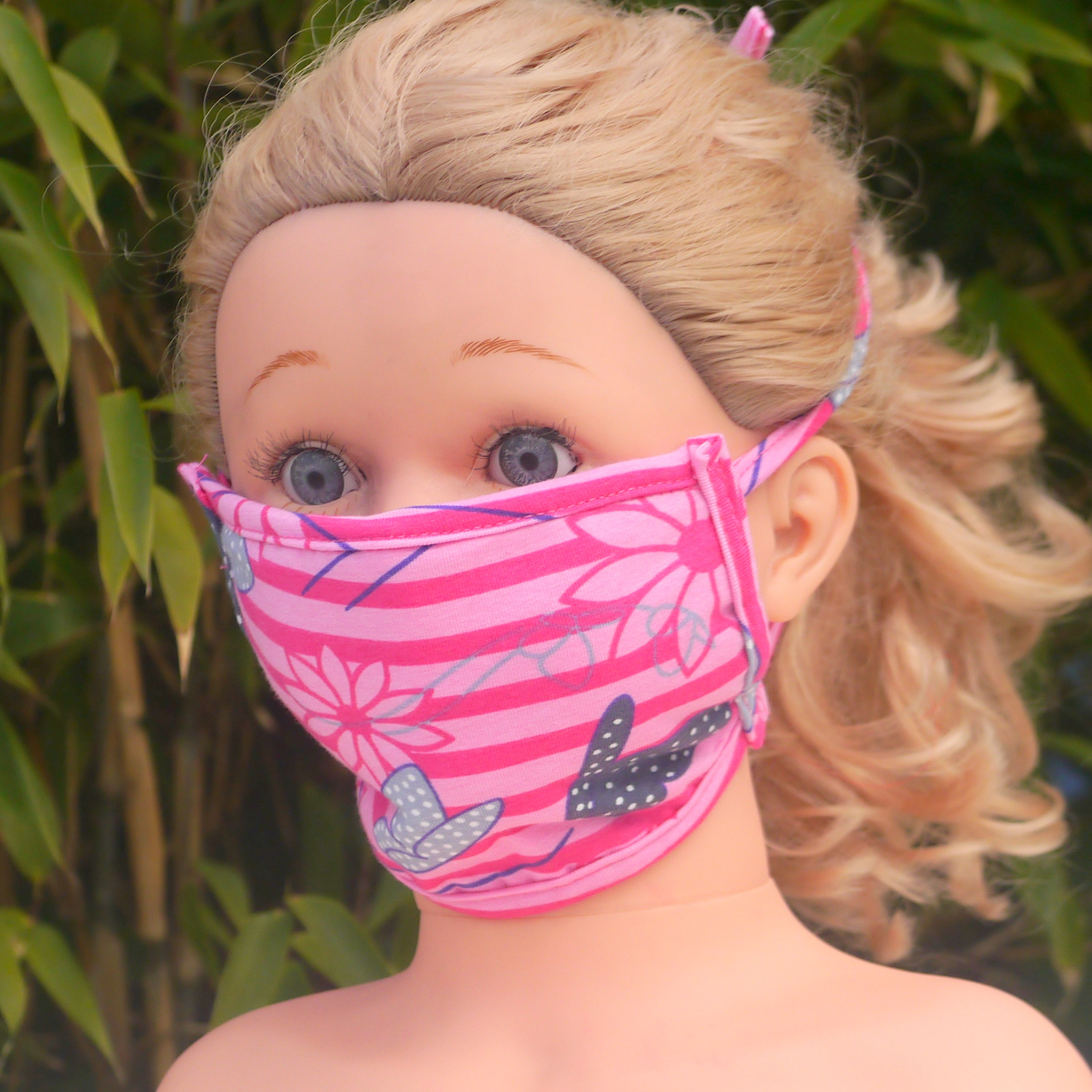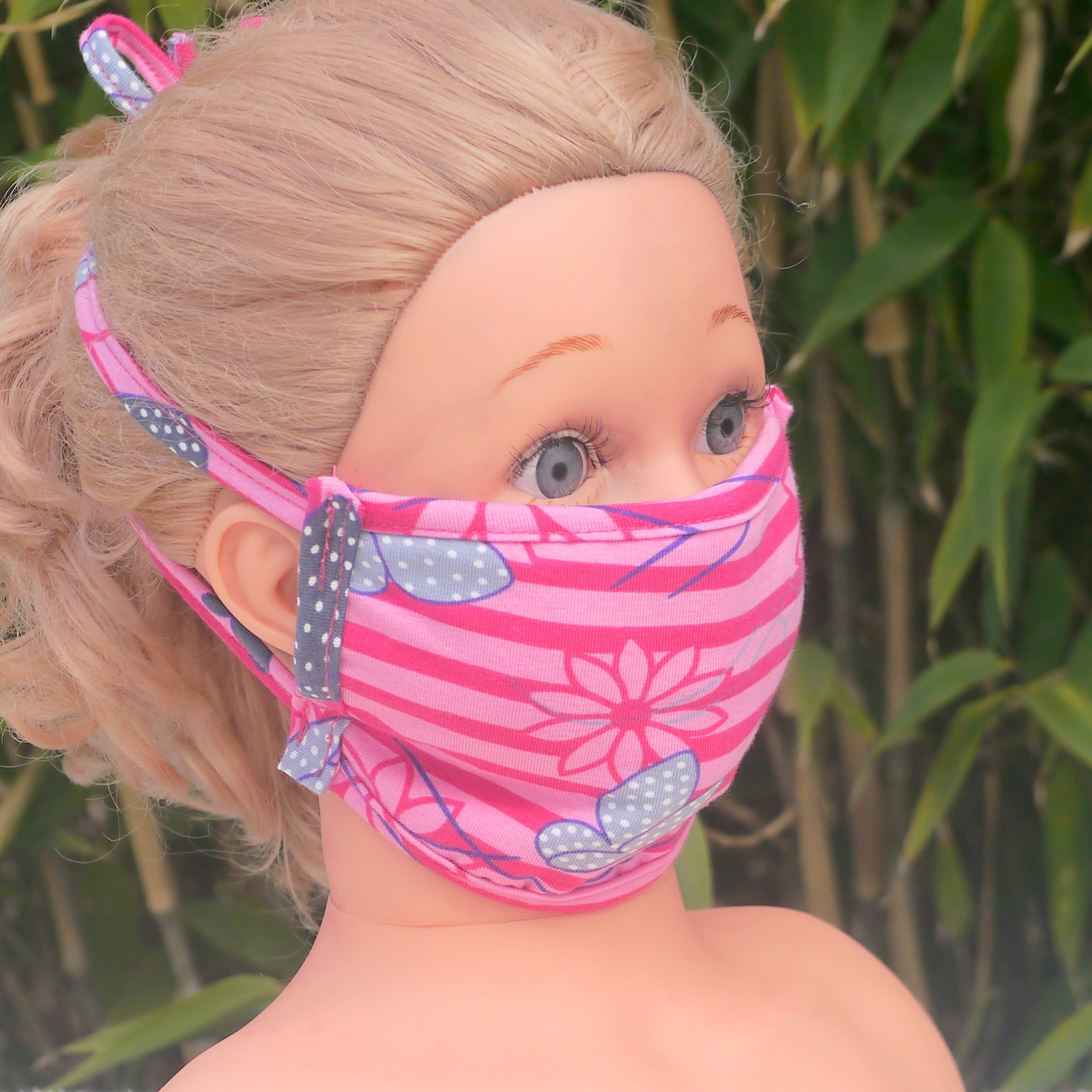 Mund und Nasen Maske aus 95%Baumwolle+5%Elasthan für Kinder und Erwachsene. Die Maske ist waschbar und mehrfach verwendbar, ist dreilagig: vorne Baumwolle, in der Mitte dünnen Einlage aus Viskose und am Mund wieder Baumwolle.