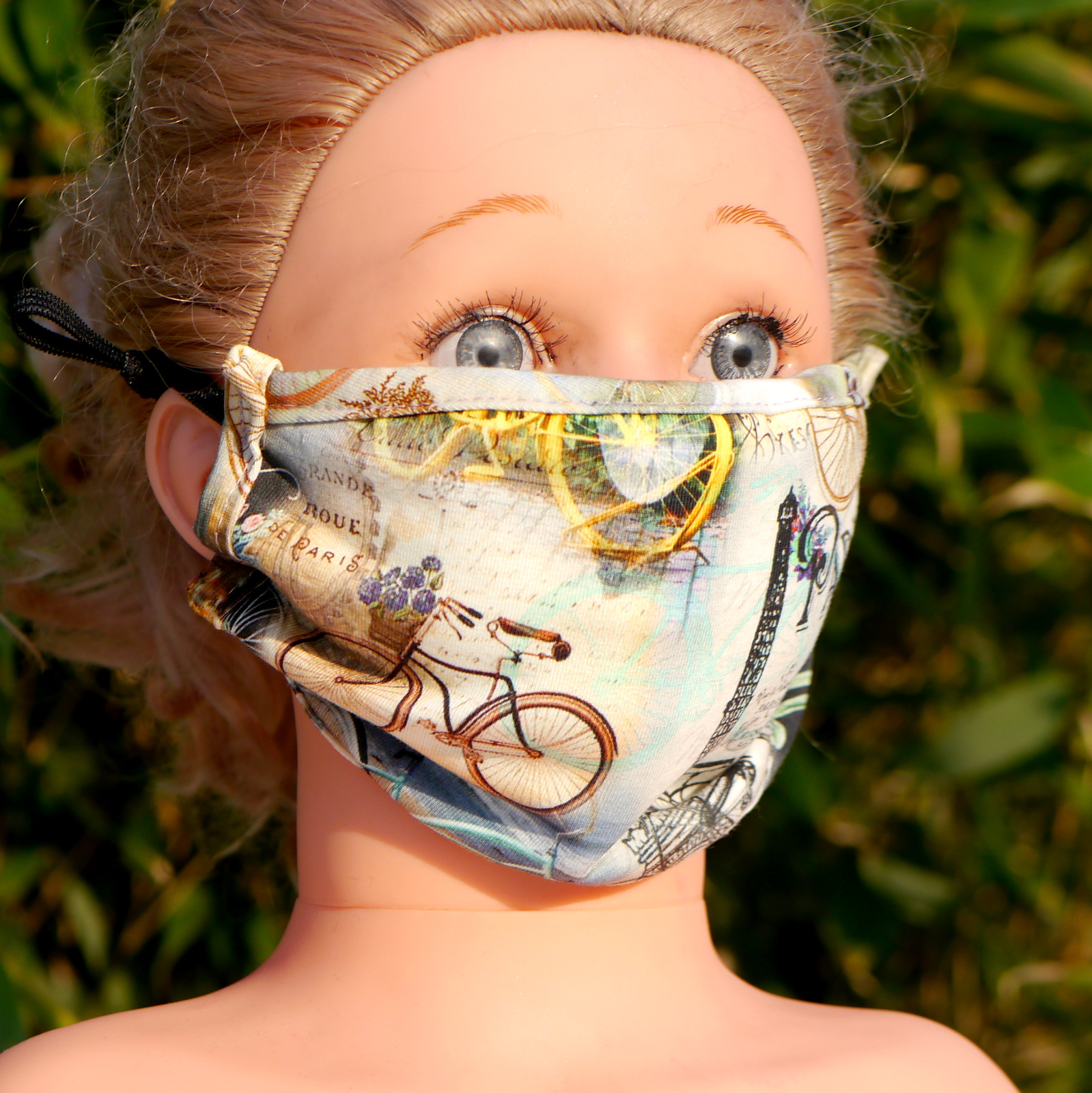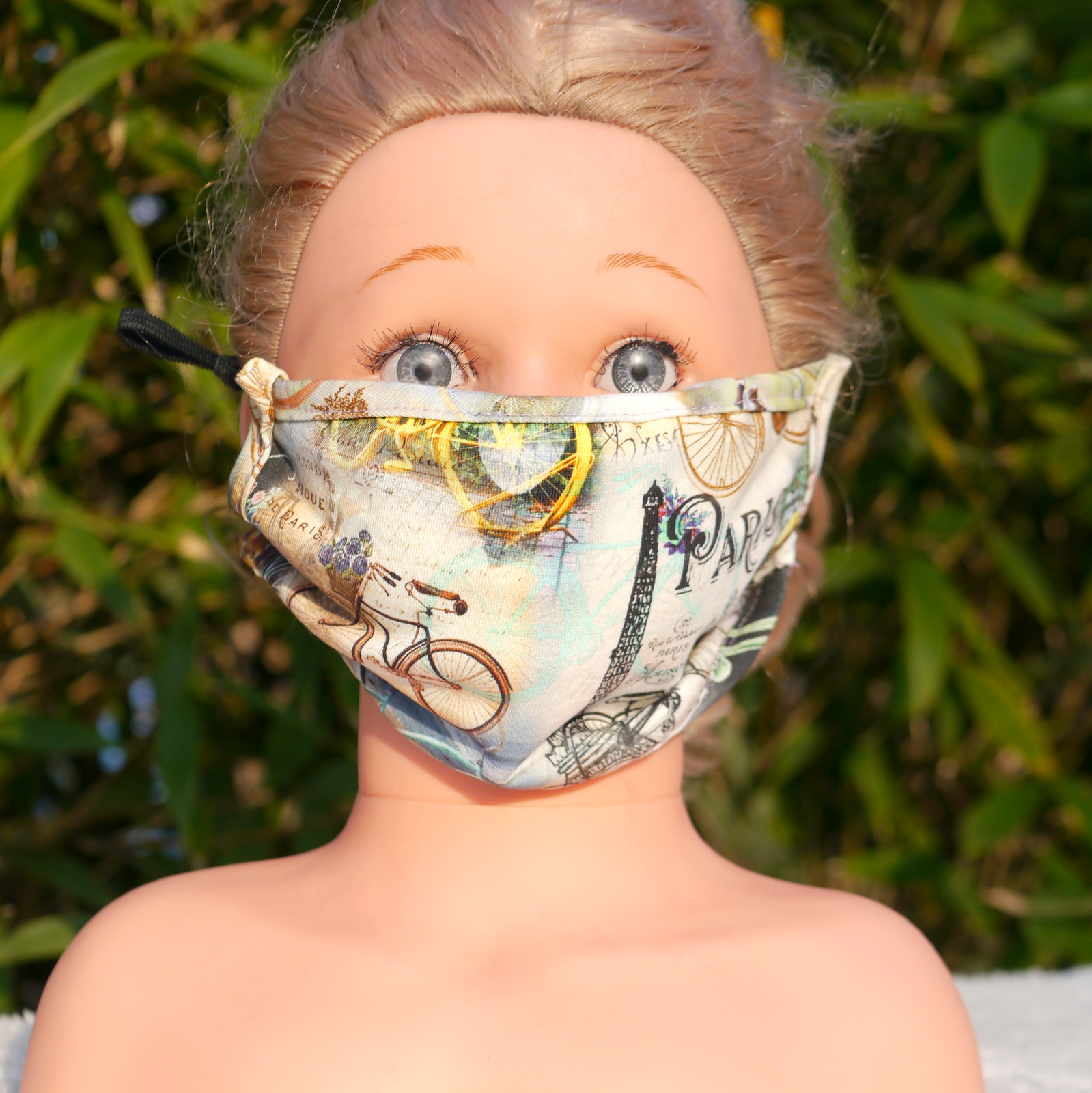 Mund und Nasen Maske aus 95%Baumwolle+5%Elasthan. Die Maske ist waschbar und mehrfach verwendbar, ist dreilagig: vorne Baumwolle, in der Mitte dünnen Einlage aus Viskose und am Mund wieder Baumwolle.