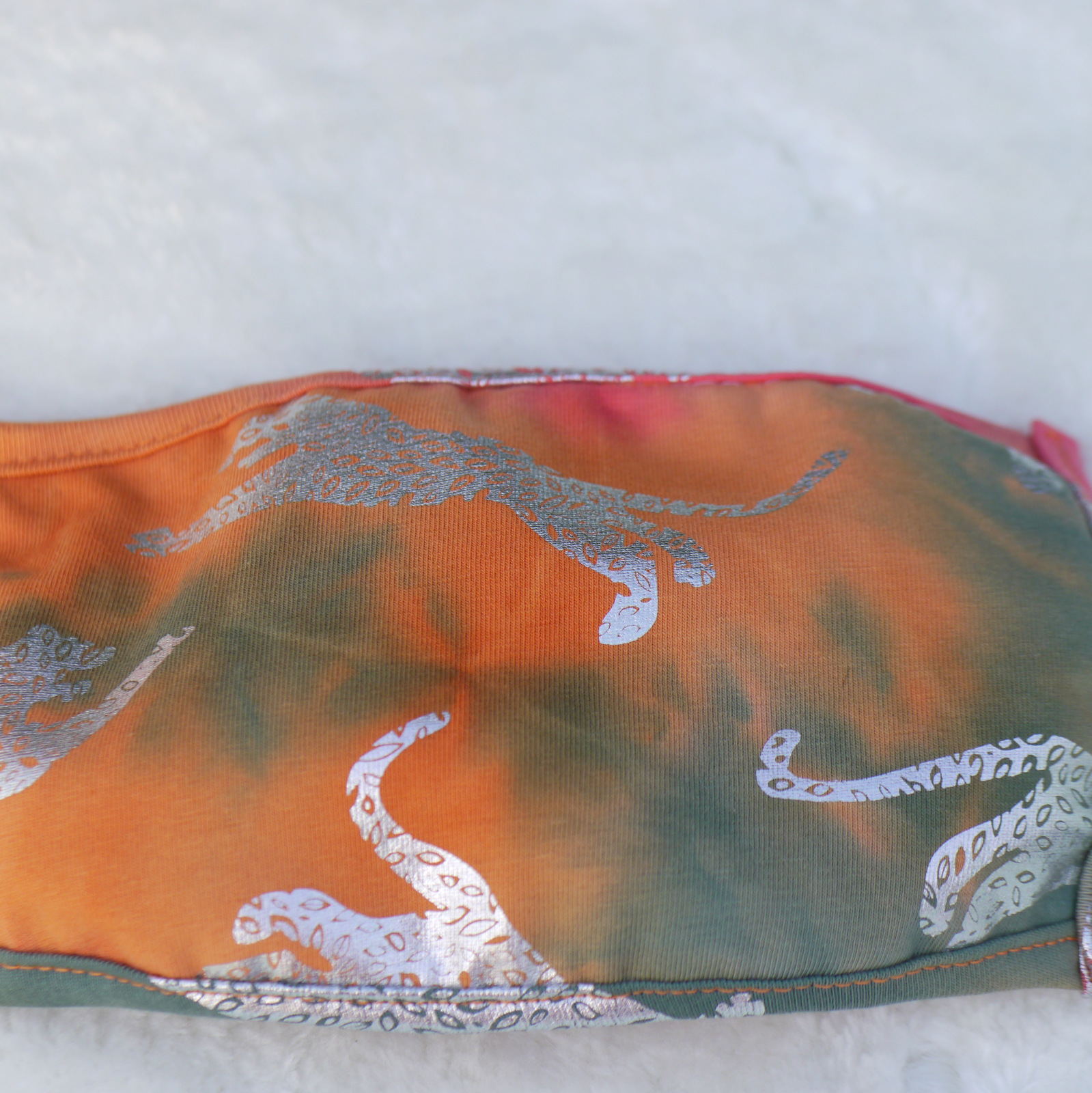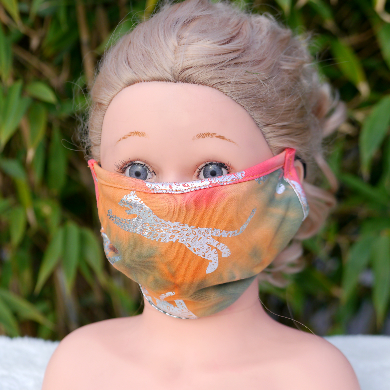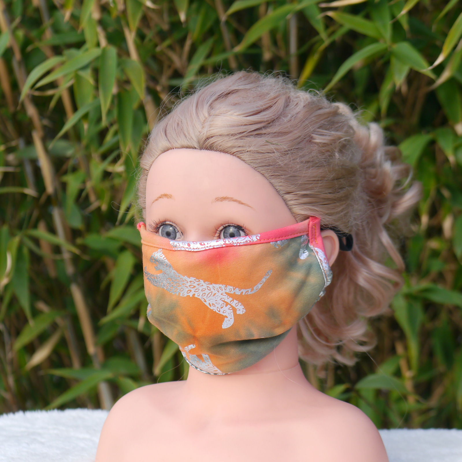 Mund und Nasen Maske aus 95%Baumwolle+5%Elasthan. Die Maske ist waschbar und mehrfach verwendbar,  ist dreilagig: vorne Baumwolle, in der Mitte dünnen Einlage aus Viskose und am Mund wieder Baumwolle.