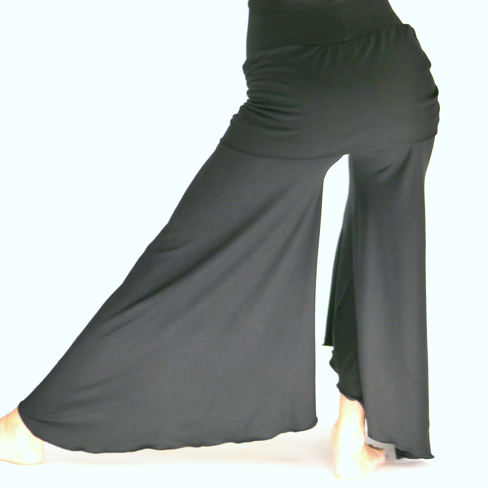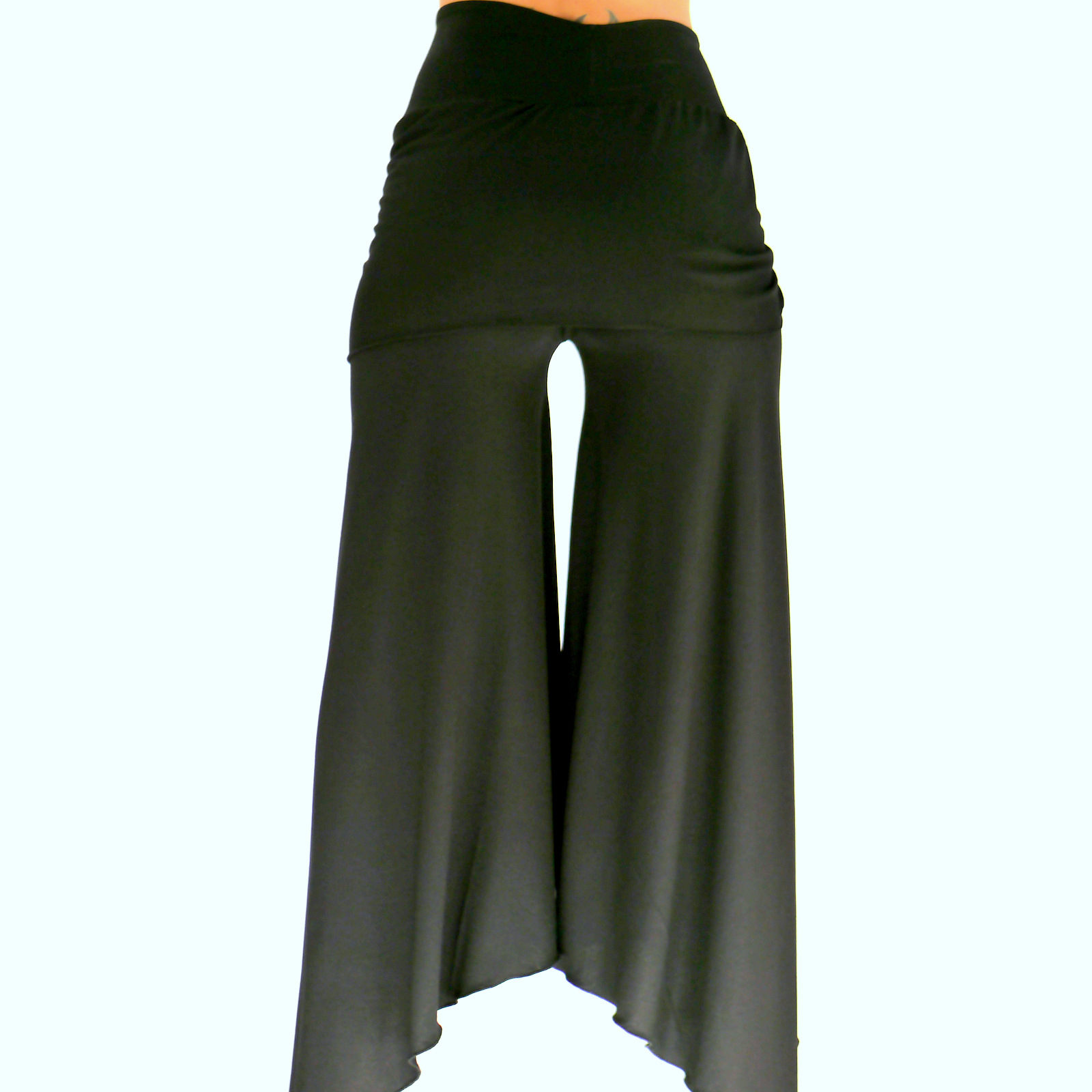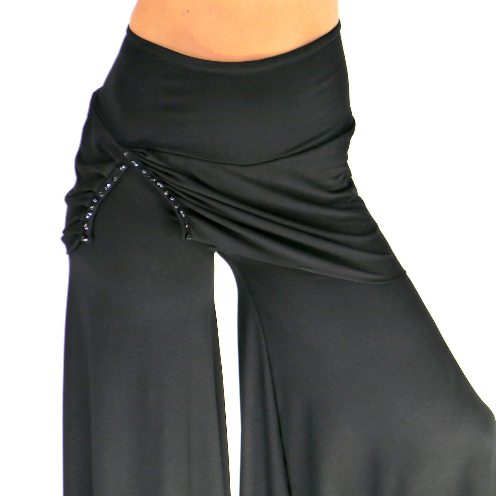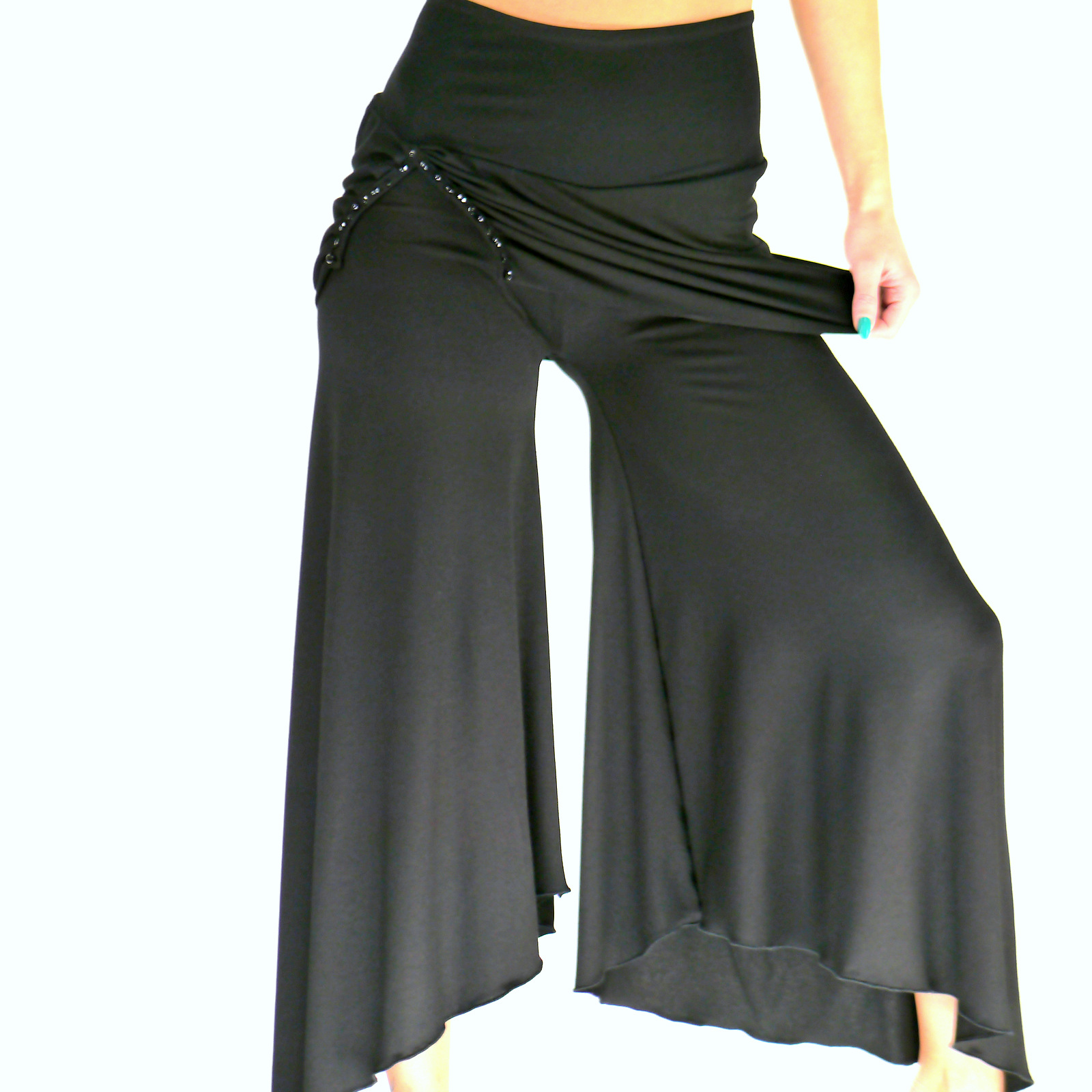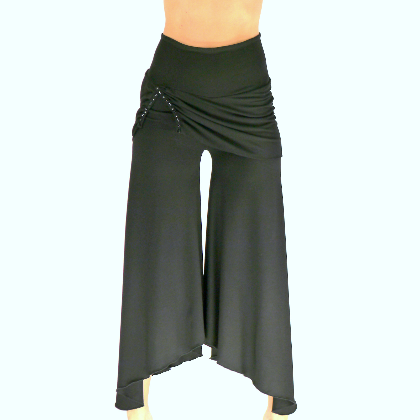 Die Schlaghose mit Rock und Strasssteine ist hergestellt aus schwarzem Viskosejersey. Der Stoff ist weich und hoch elastisch. Der Rock ist angenäht an der Hose so kaschiert kleine Problemzonen. Sehr praktisch und elegant lässt sich zu vielen Anlässen kombinieren. Sie hat einen hohen, breiten Bunt der über den Bauchnabel geht, schneidet nicht ein, weil sie keinen Gummiband hat, verrutscht nicht und macht einfach einen perfekten, flachen Bauch. Ihr werdet diese Hose einfach lieben.