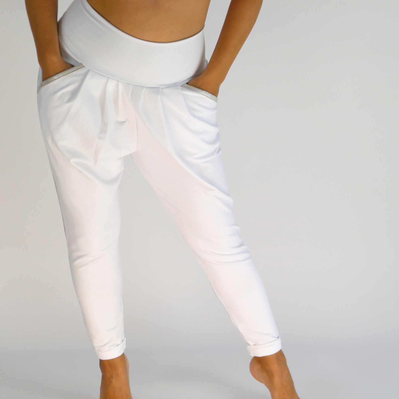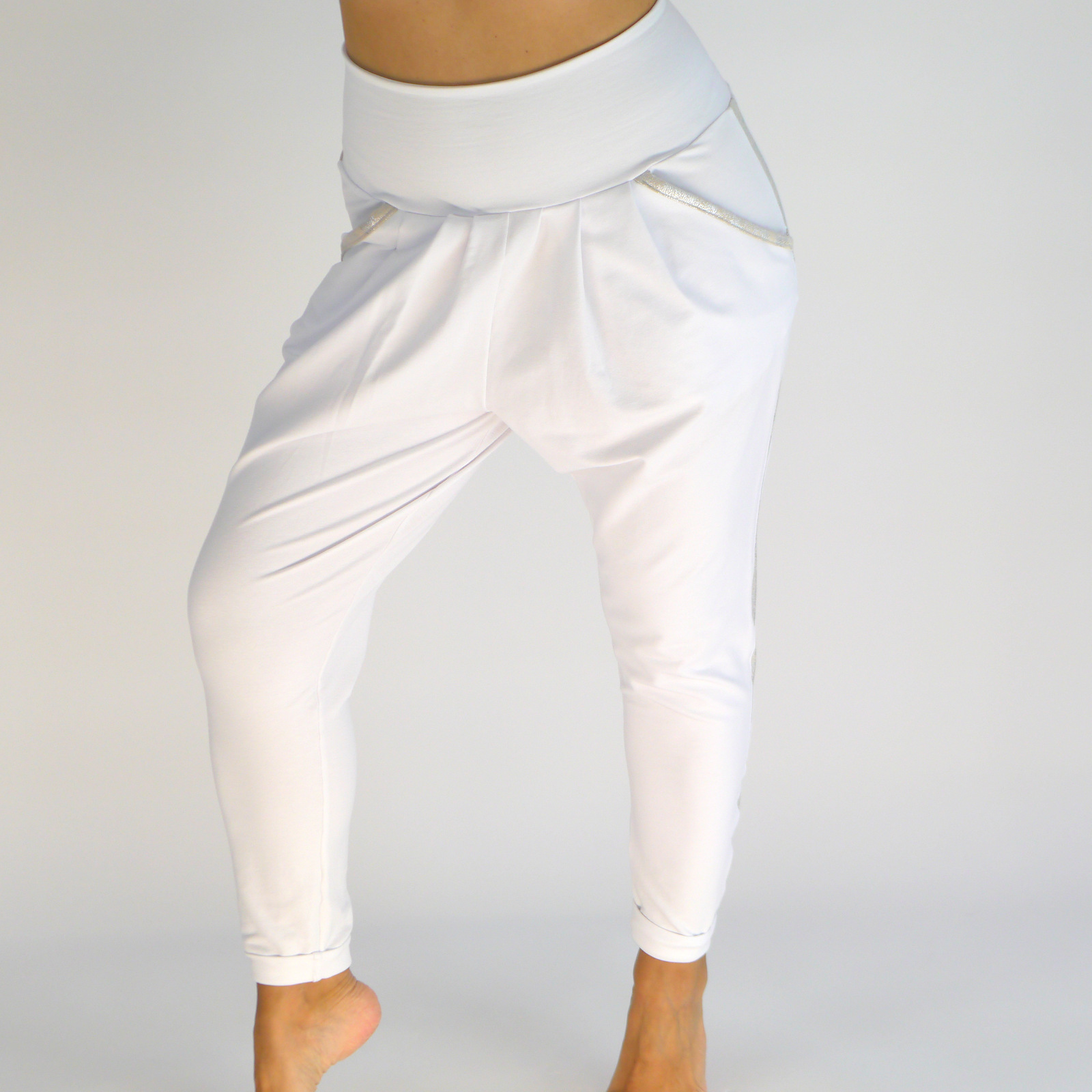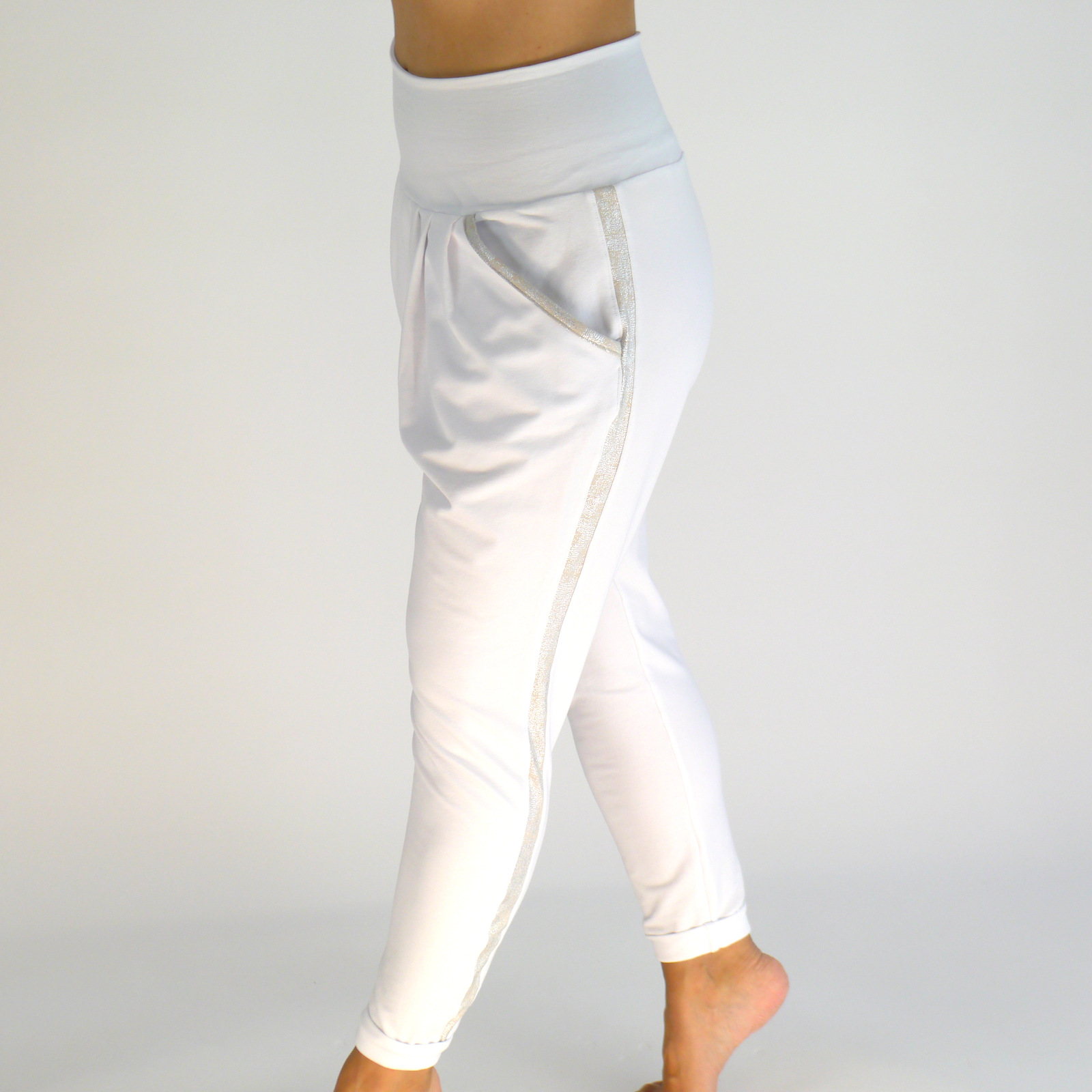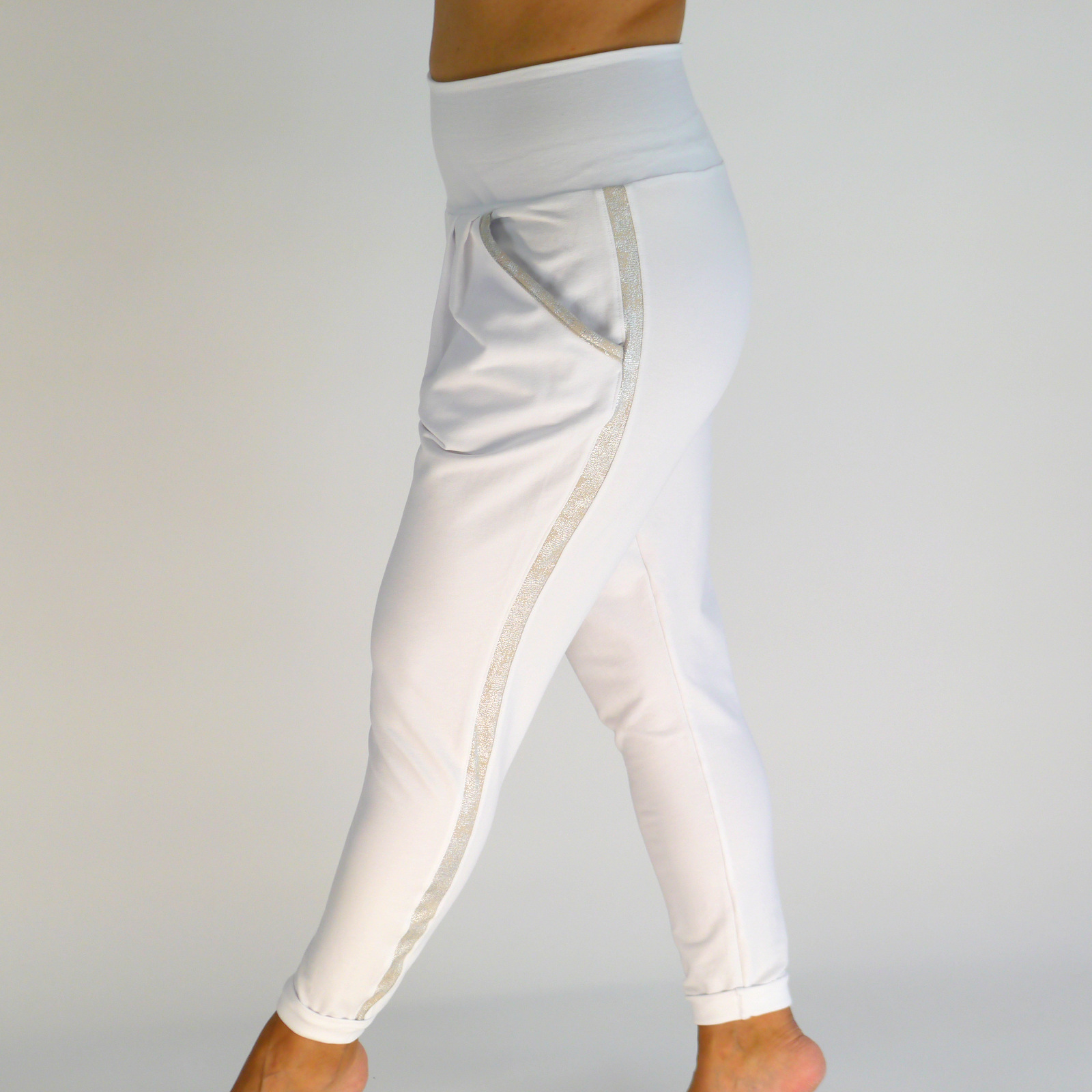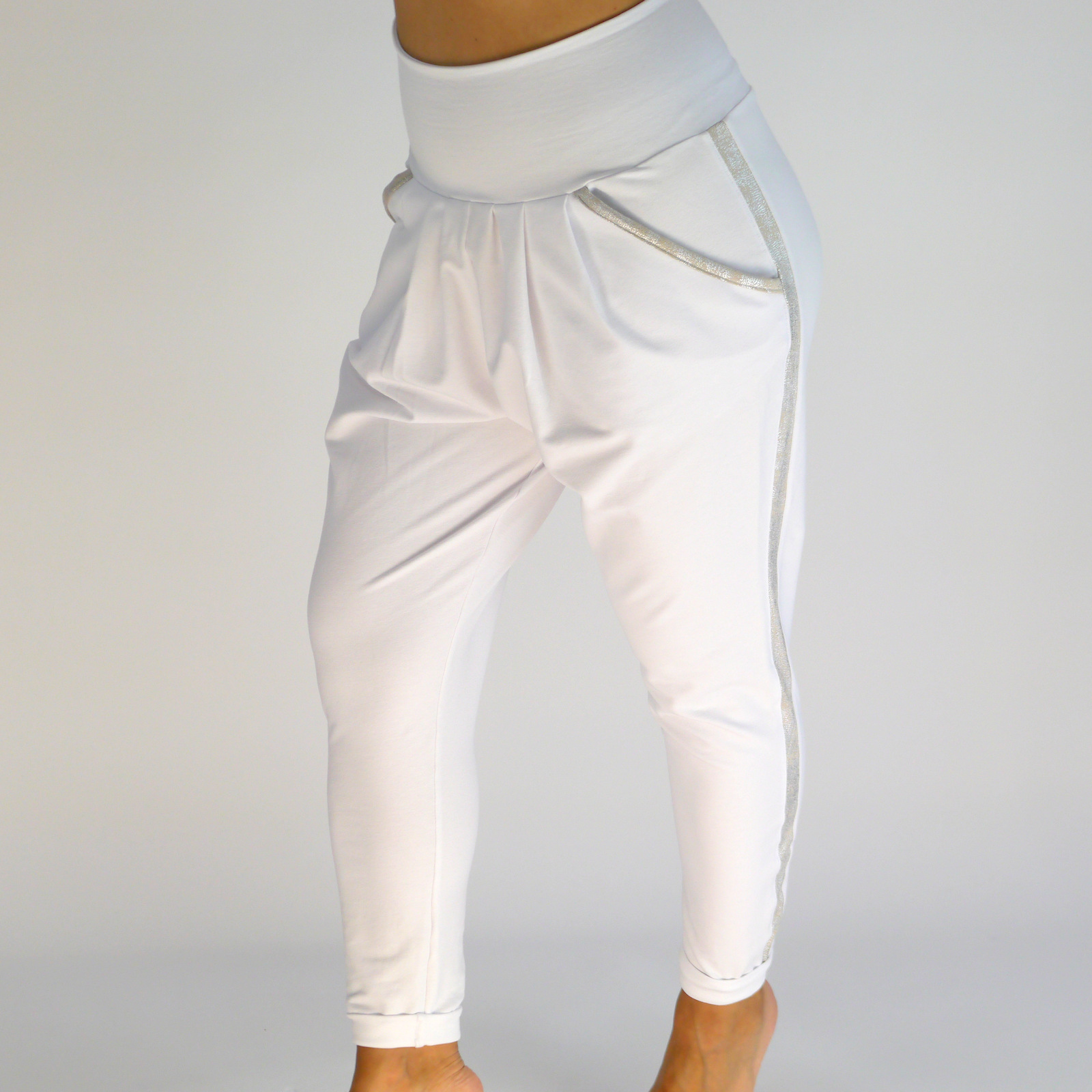 Lockere Hose aus Baumwolle+Elasthan mit Taschen. Die Hose hat an den Seiten einen silbenen Streifen aus veganem Leder. Der Stoff ist weich und angenehm auf der Haut. Sie hat einen hohen, breiten Bund der über den Bauchnabel geht, schneidet nicht ein, weil sie kein Gummiband hat, verrutscht nicht und macht einfach einen perfekten, flachen Bauch.