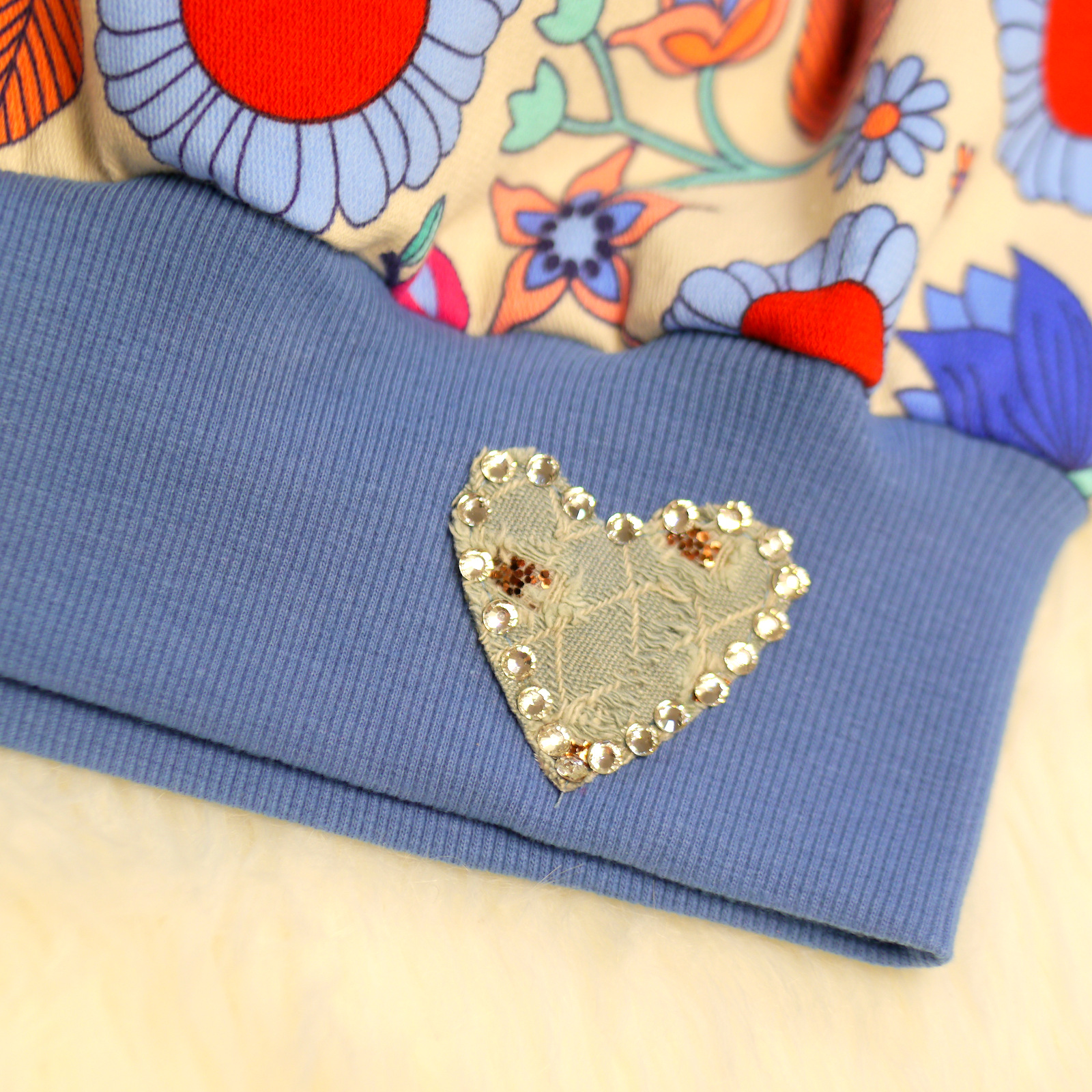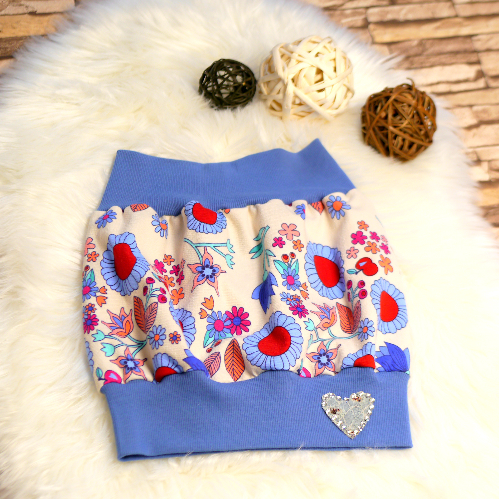 Mädchen lieben Glitzer deswegen habe ich ein kleines Herzchen genäht unten am Saum aus Jeans Stoff mit Glitzer Muster und am Rande habe ich Strass Steine geklebt. Der Rock kann bei 40 Grad gewaschen werden.