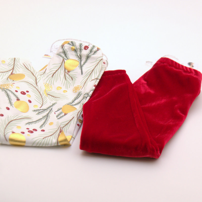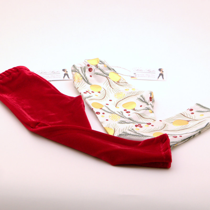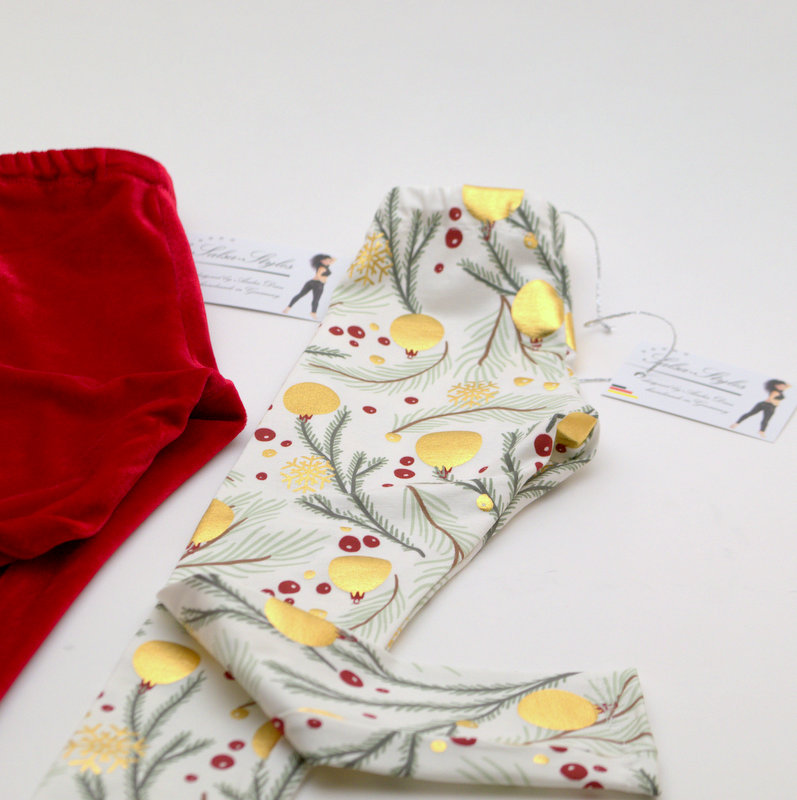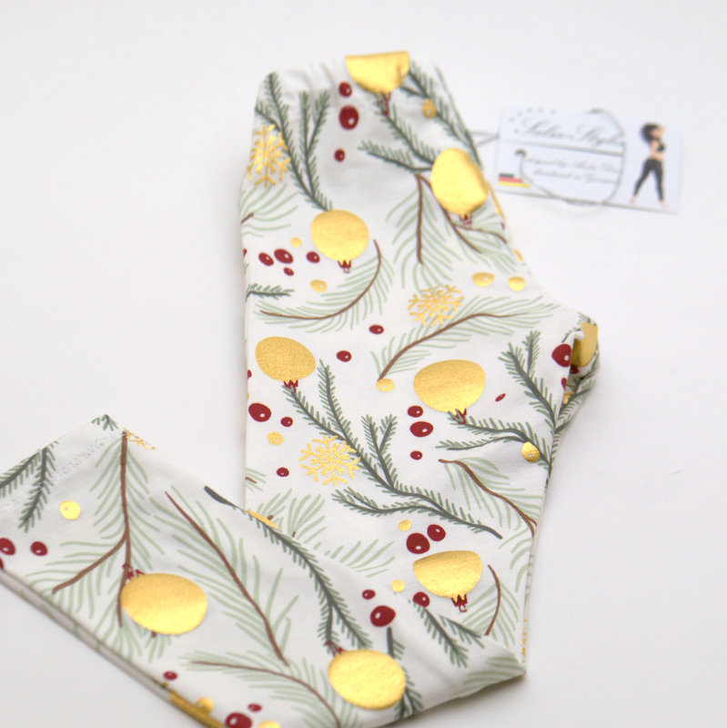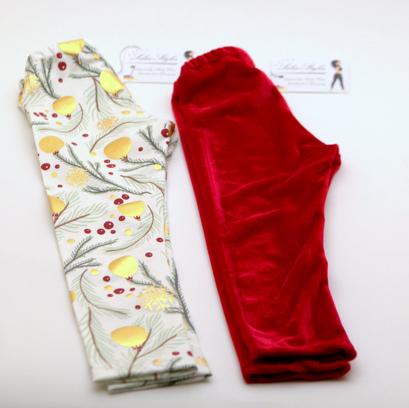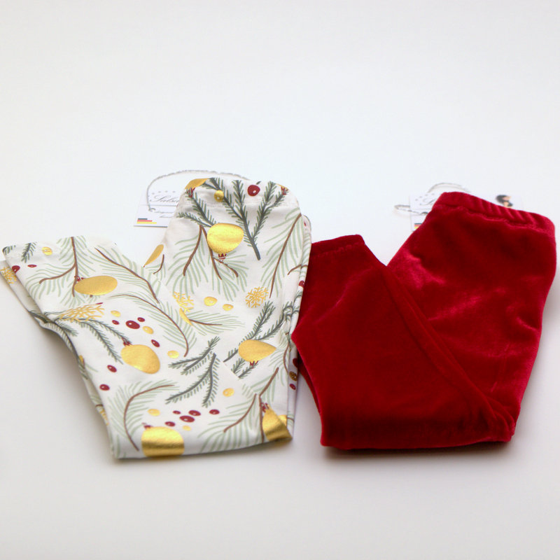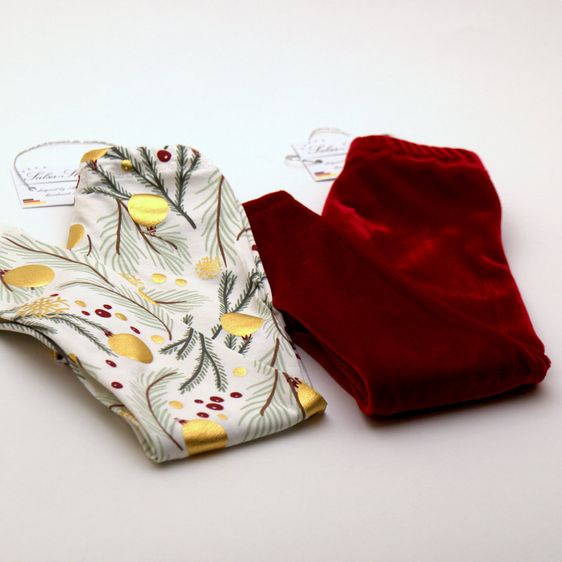 Kinder Leggings 2er-Pack WeihnachtsEdition.  Eine Leggings ist aus Samt und die weiß-goldene Leggings ist aus Baumwolle, beide sind sehr elastisch und dadurch sehr bequem.