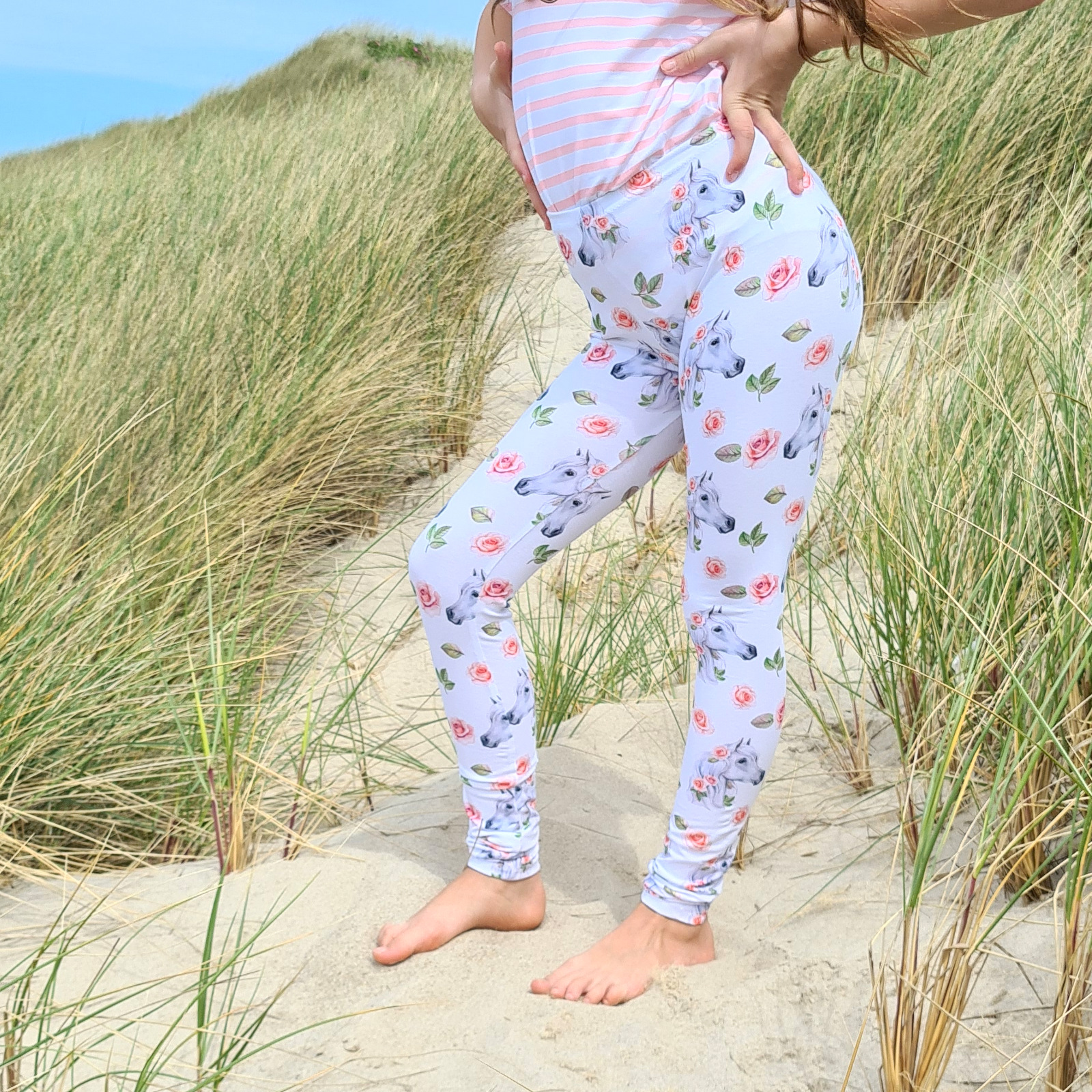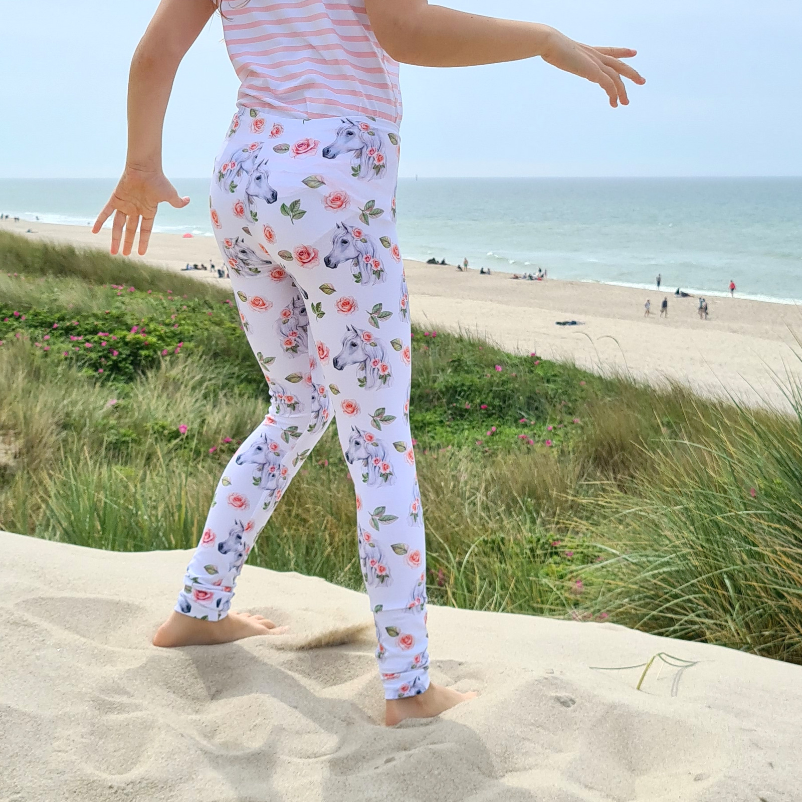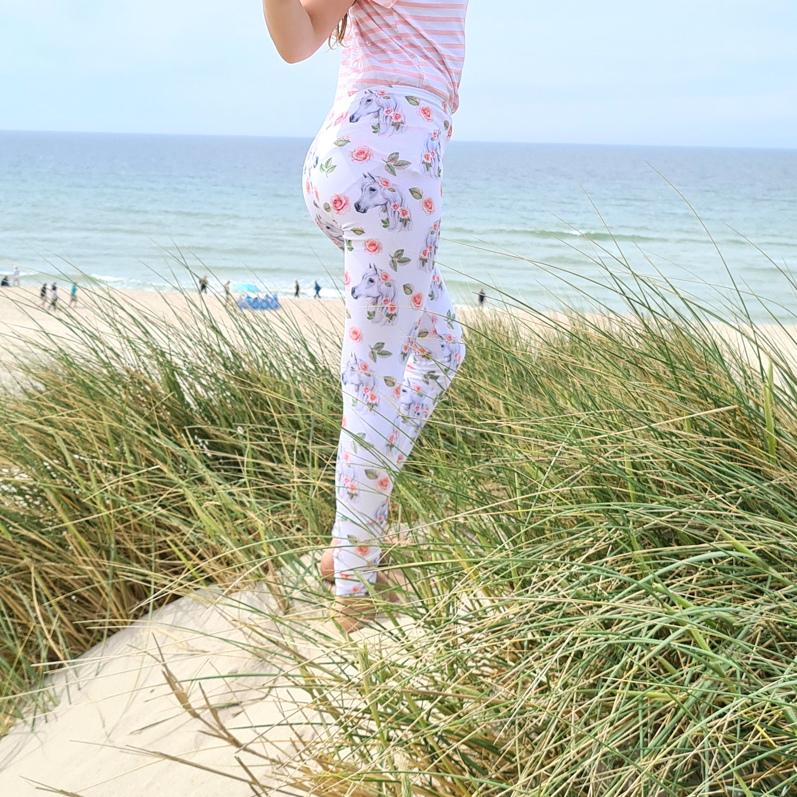 Sehr schöne Leggings für Mädchen mit Pferdemuster und Rosen. Der Stoff ist aus 95%Baumwolle und 5% Elasthan der ist sehr weich und für jede Jahreszeit perfekt.