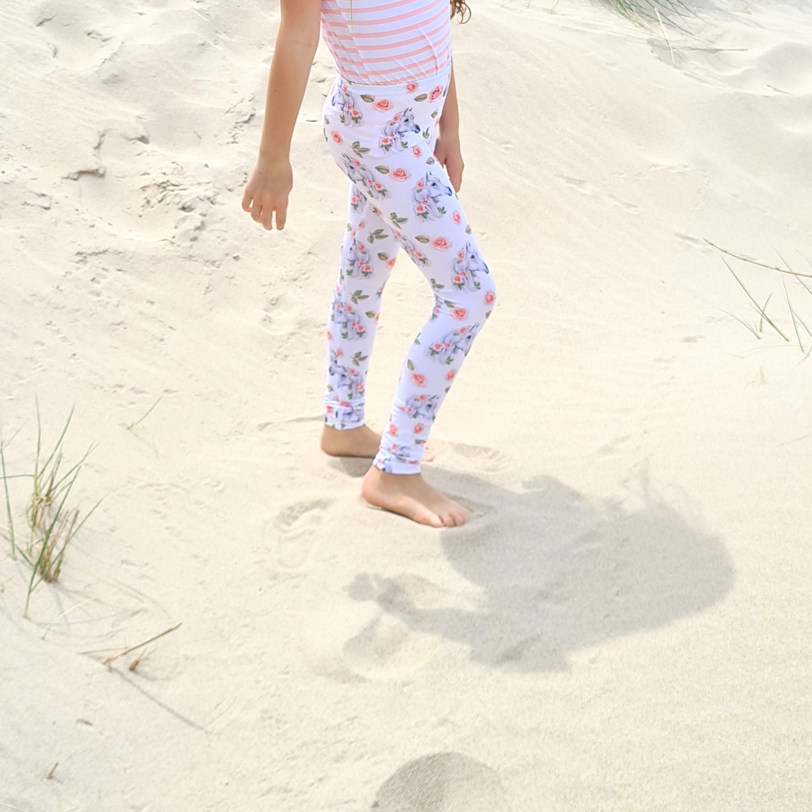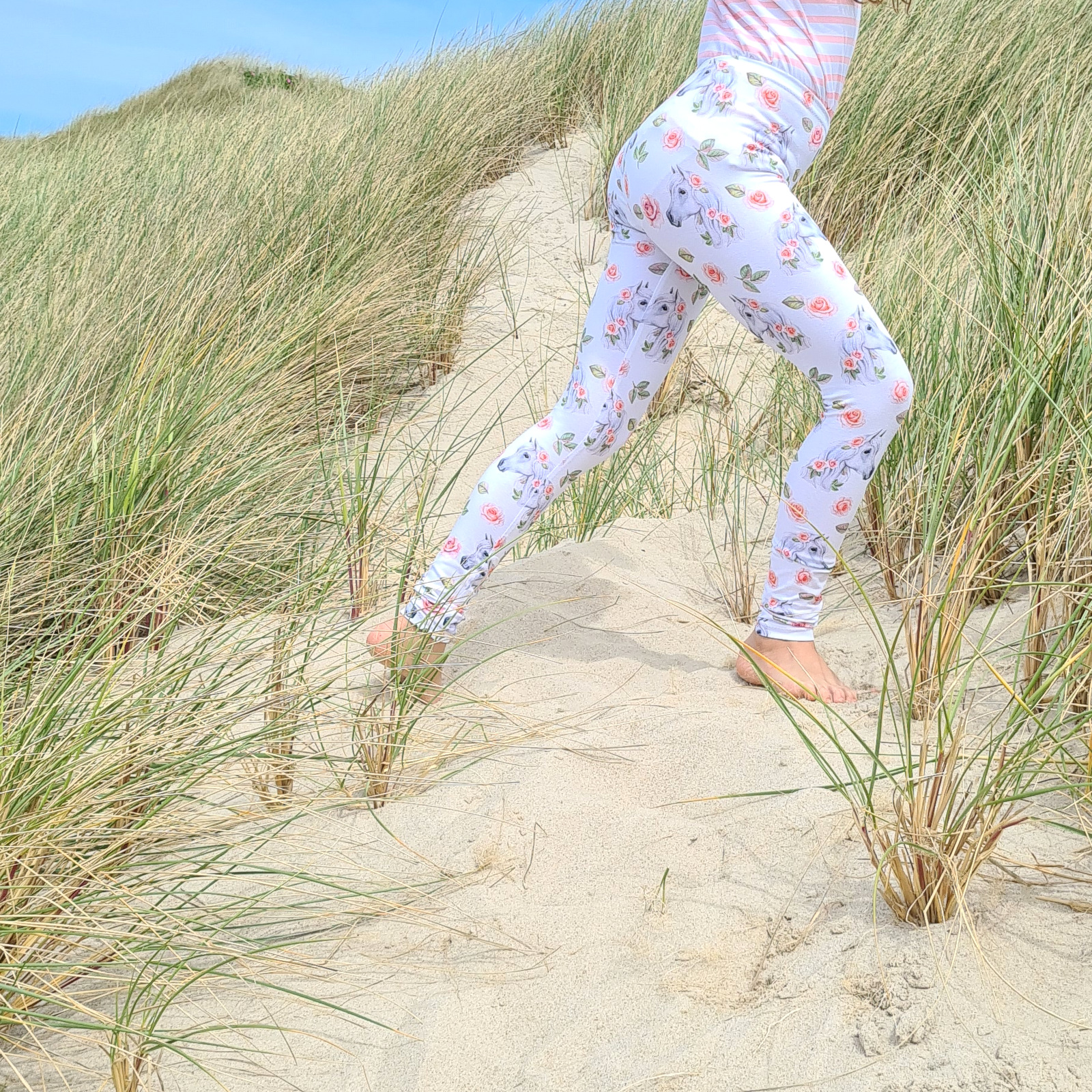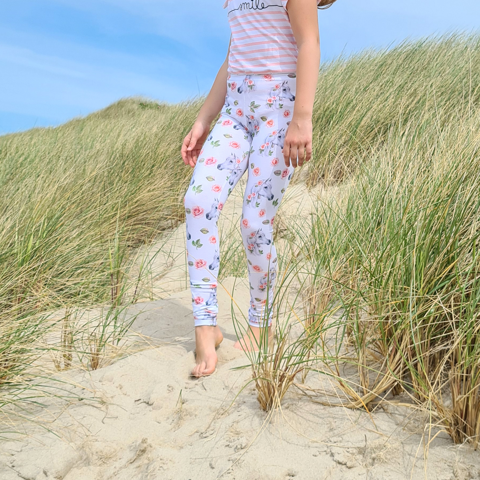 Sehr schöne Leggings für Mädchen mit Pferdemuster und Rosen. Der Stoff ist aus 95%Baumwolle und 5% Elasthan der ist sehr weich und für jede Jahreszeit perfekt.