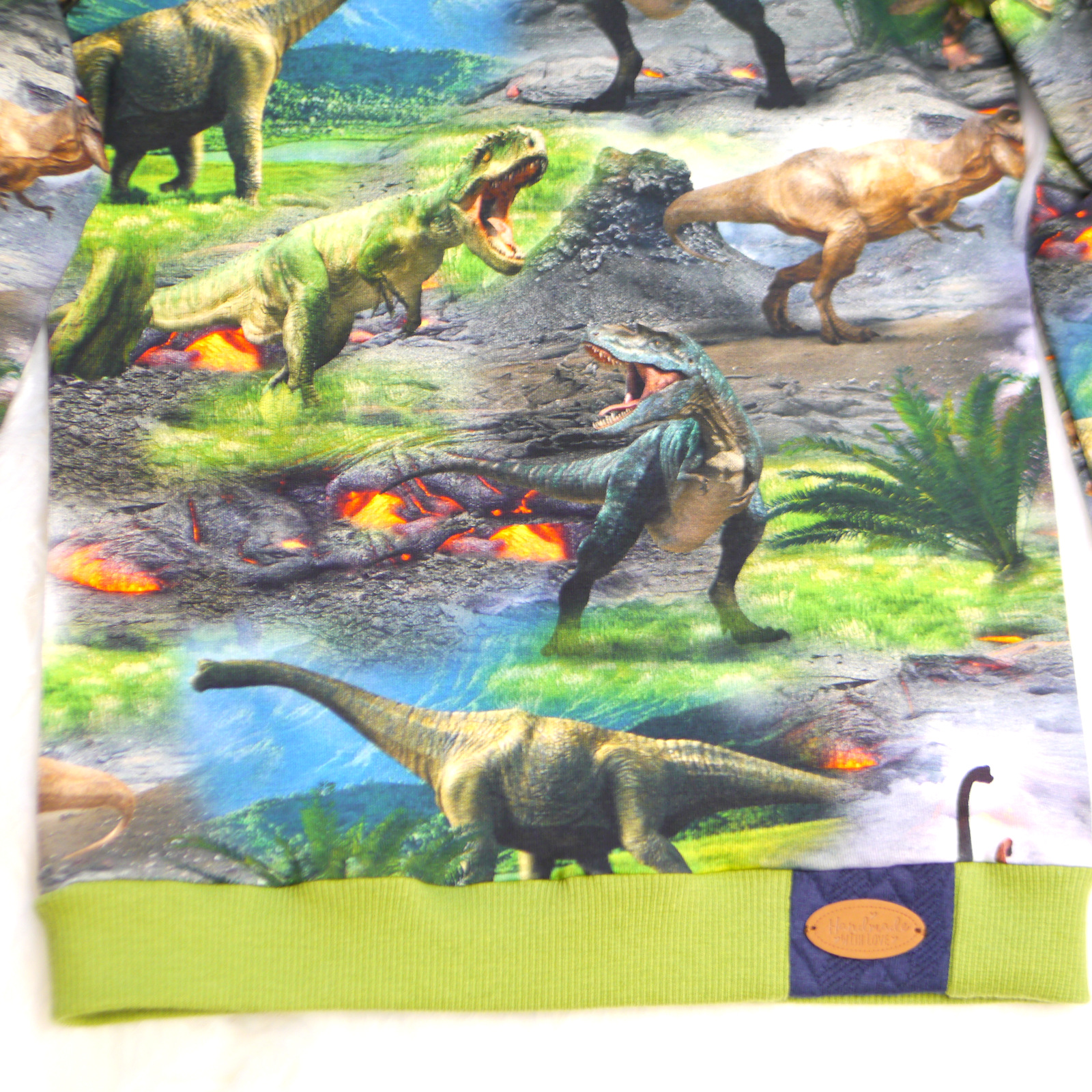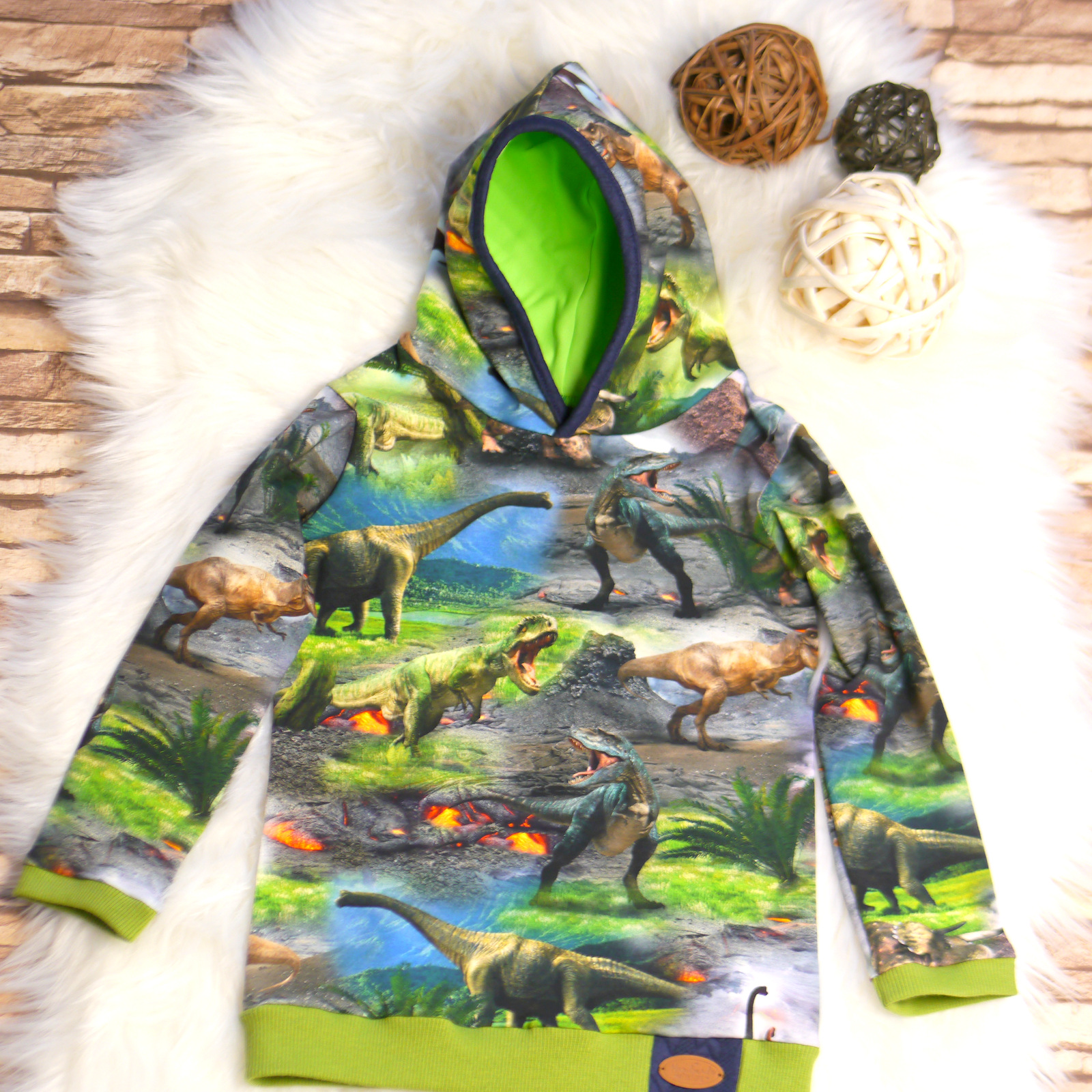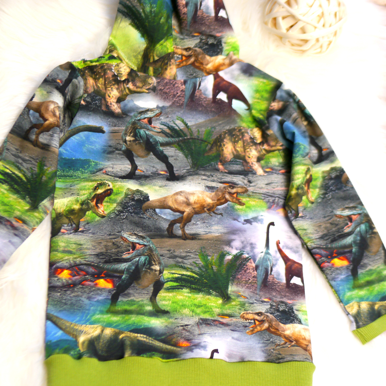 Pullover mit Kapuze mit Dinosaurier Motiv. Angefertigt ist das schöne Oberteil aus Baumwolle ( 95% Baumwolle + 5% Elasthan ). Die Kapuze von Ihnen ist aus einen super weichen Microfaser Stoff in der Farbe Neon grün.
