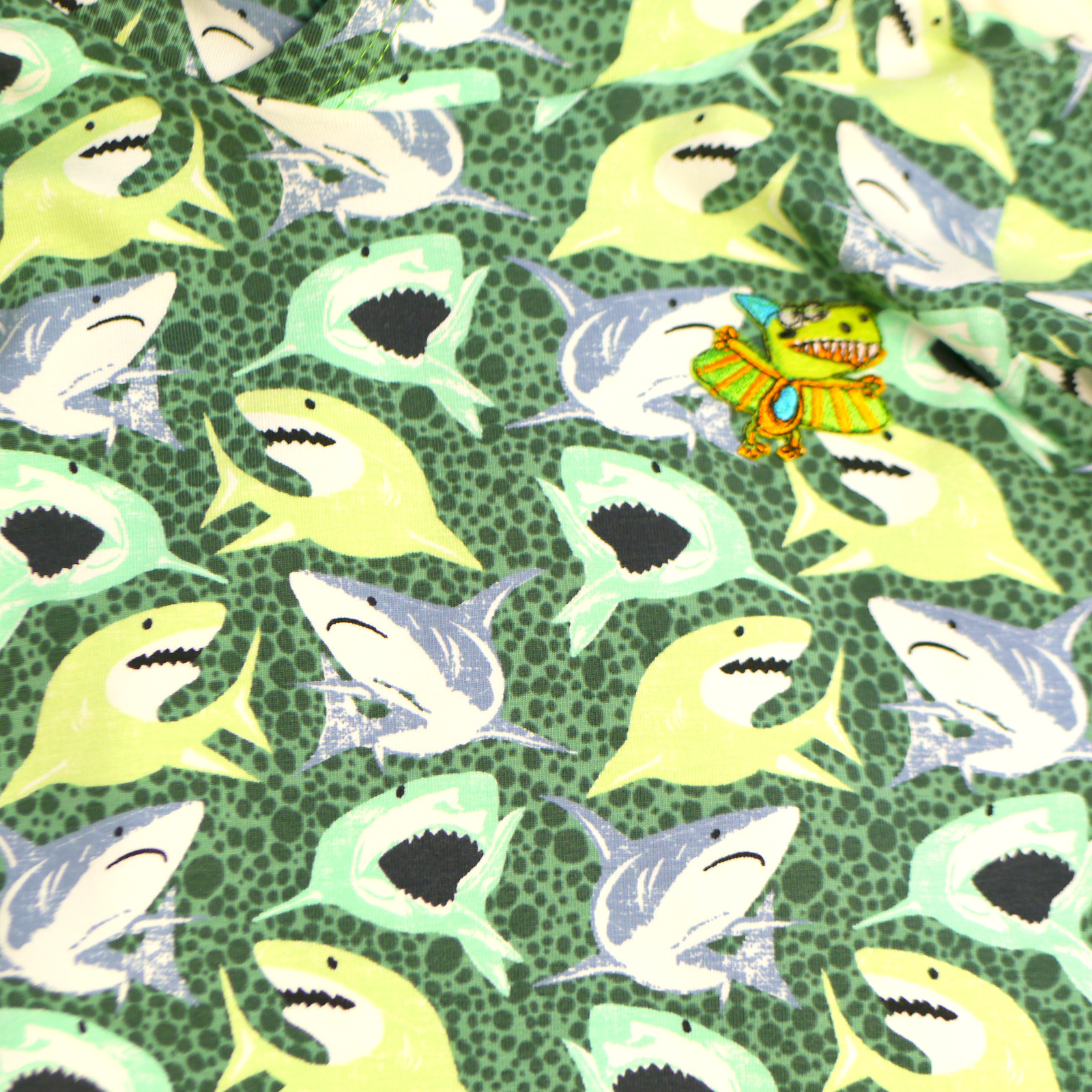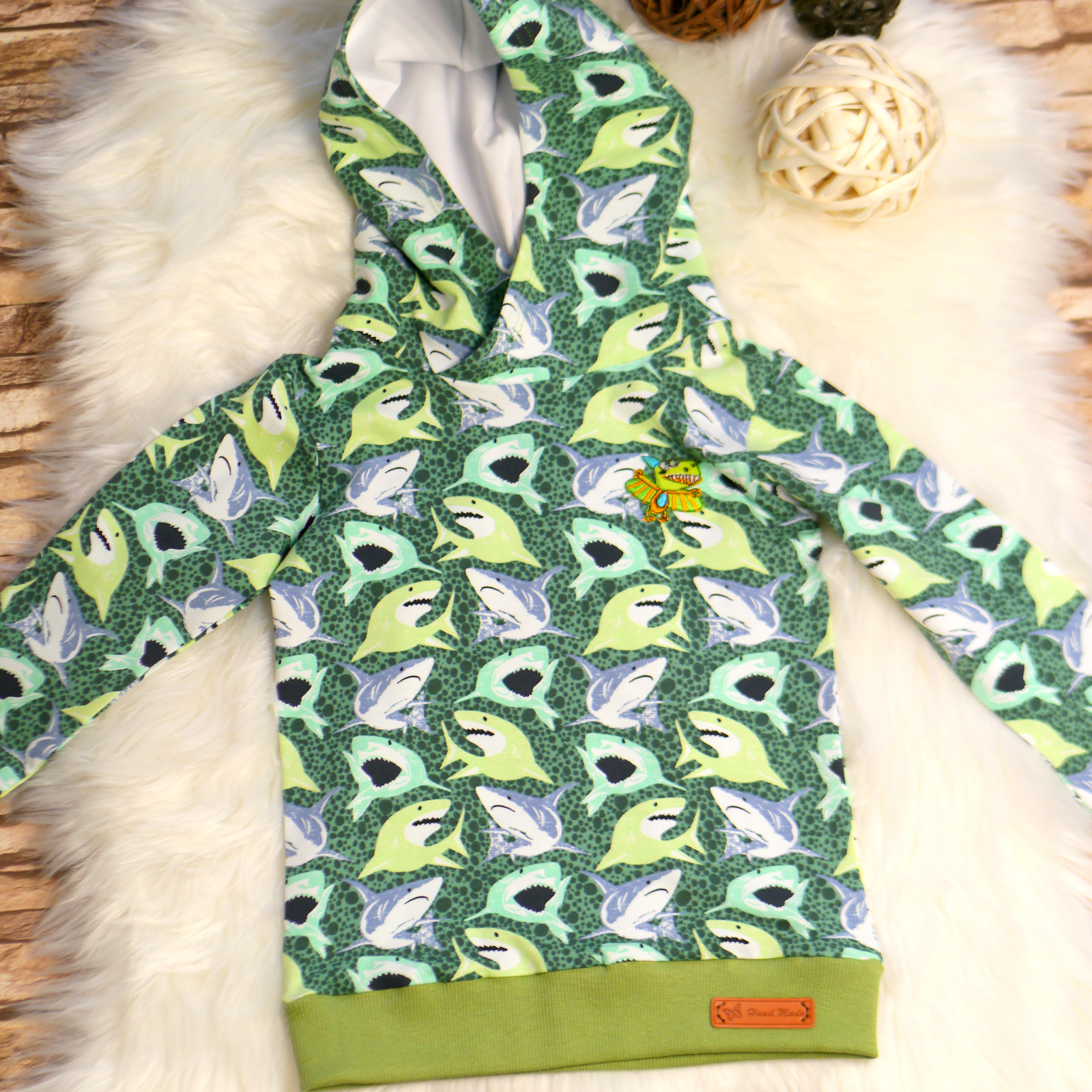 Pullover mit Kapuze mit Haifische Motiv. Angefertigt ist das schöne Oberteil aus Baumwolle ( 95% Baumwolle + 5% Elasthan ).