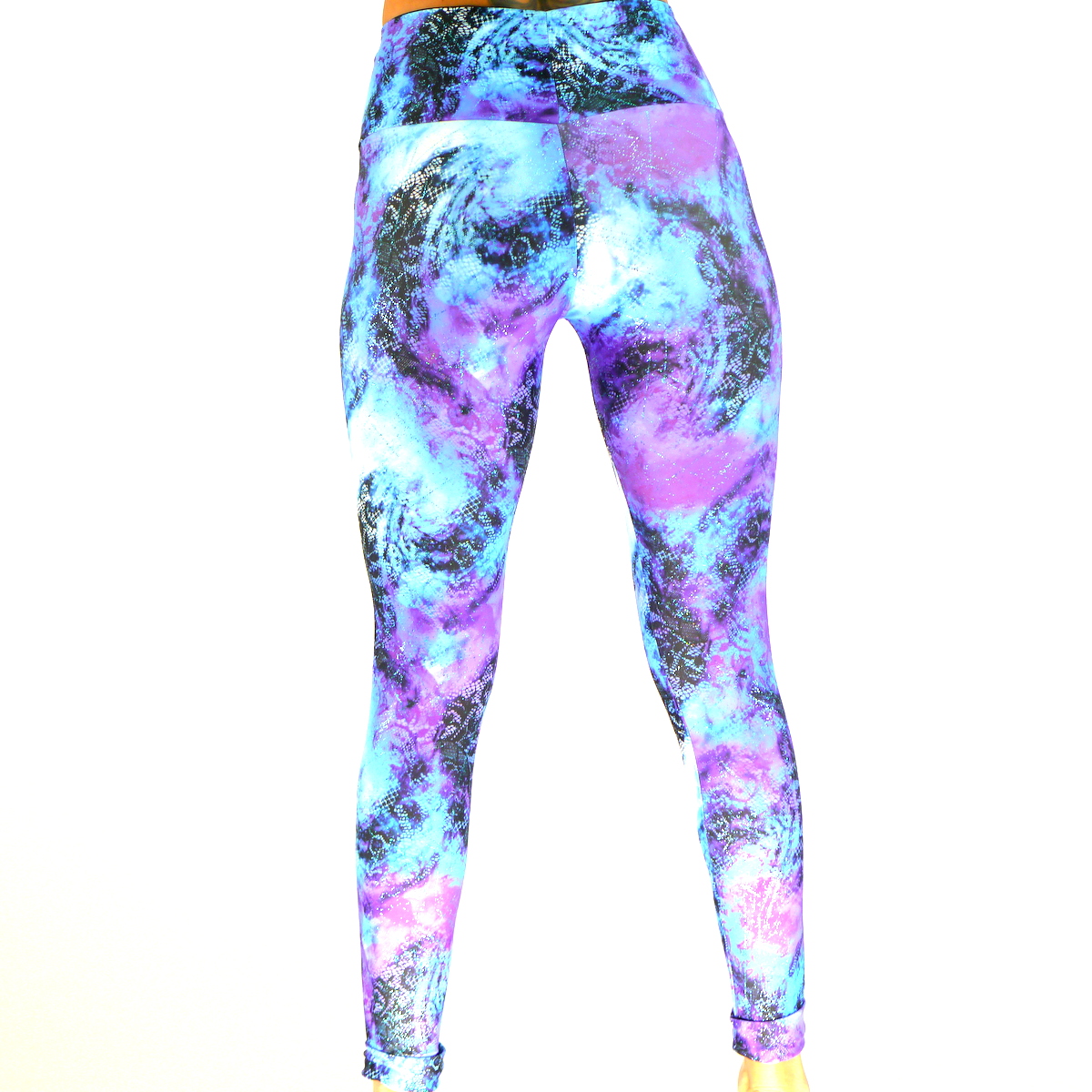 Eine wunderschöne bunte Spot - Tanzleggings. Sie sitzt dank des extrahohen Stretch - Anteils wie eine zweite Haut und macht auch große Bewegungen lässig mit. Der Stoff ist ein Traum hat super schöne blau Töne mit Glitzer, der ist weich aber dick genug um den Bein gut zu Formen.