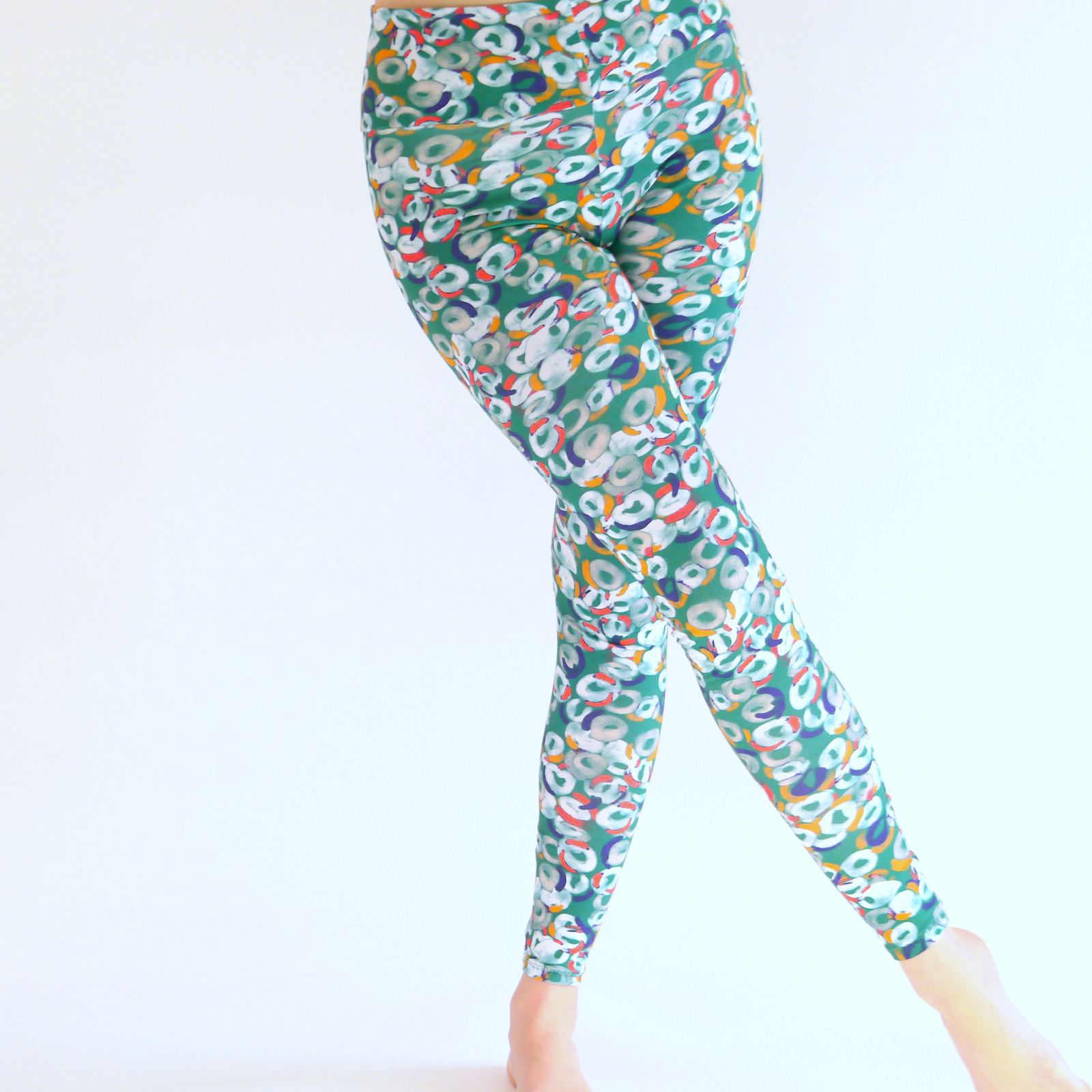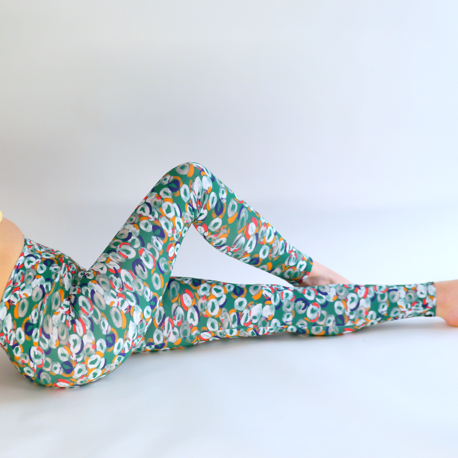 Die Leggings ist angefertigt aus grün-weißen Baumwoll-Jersey Stoff. Damit diese schöne Yoga Leggings einen guten Sitz hat, habe ich in Innenbündchen einen Elasthan Stoff (Bauch weg) eingebaut.