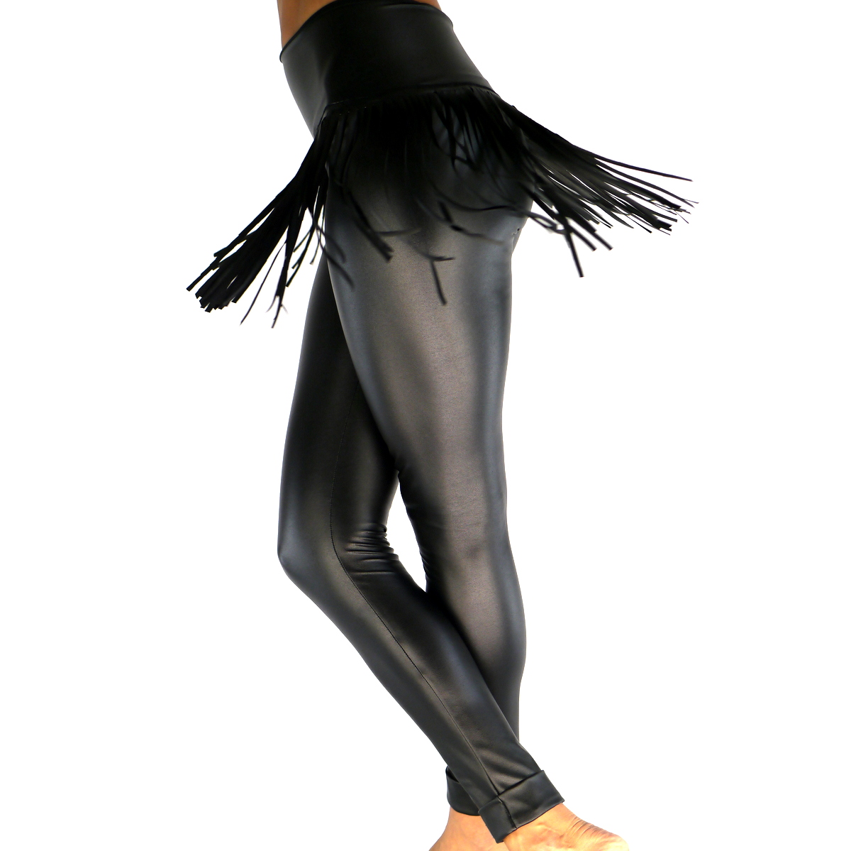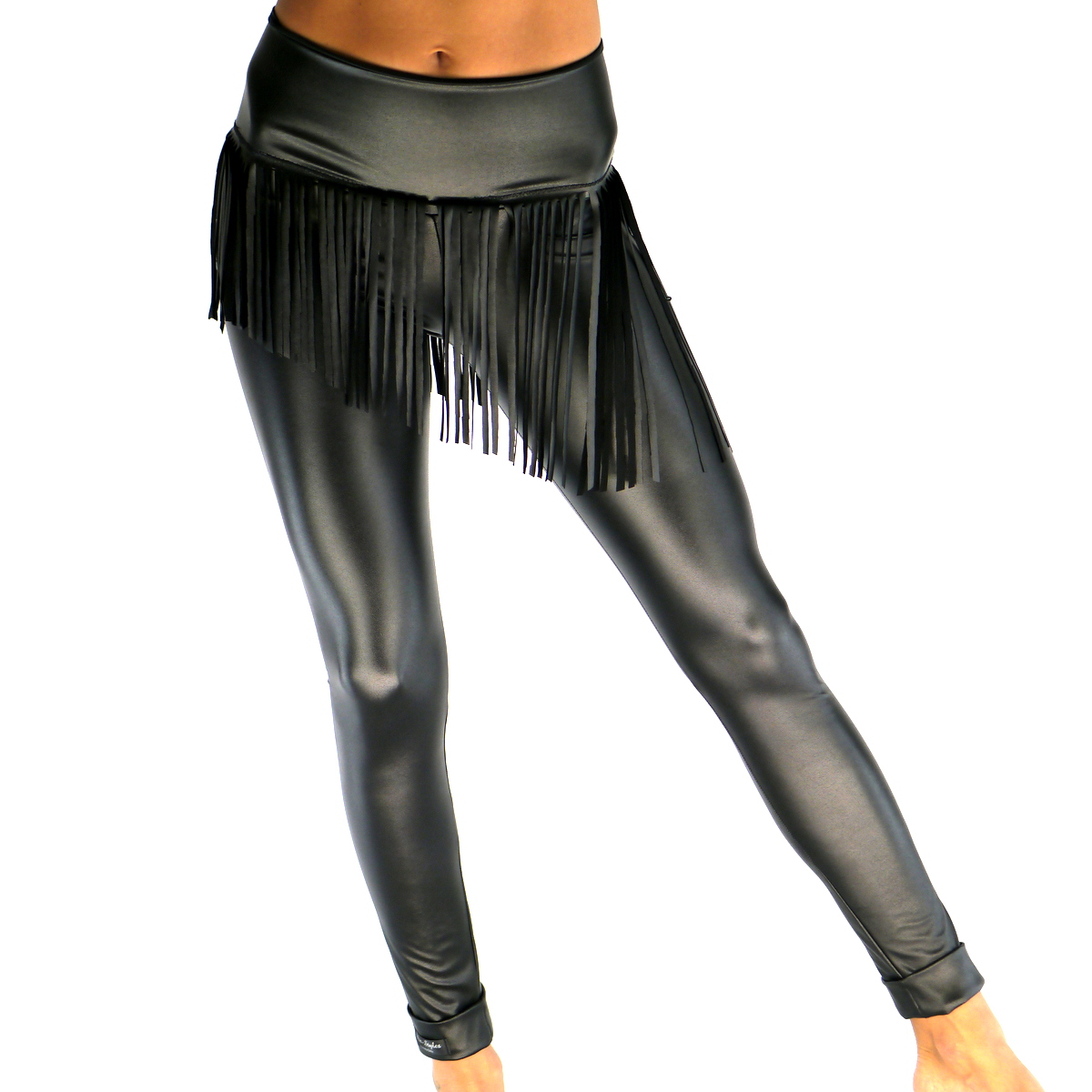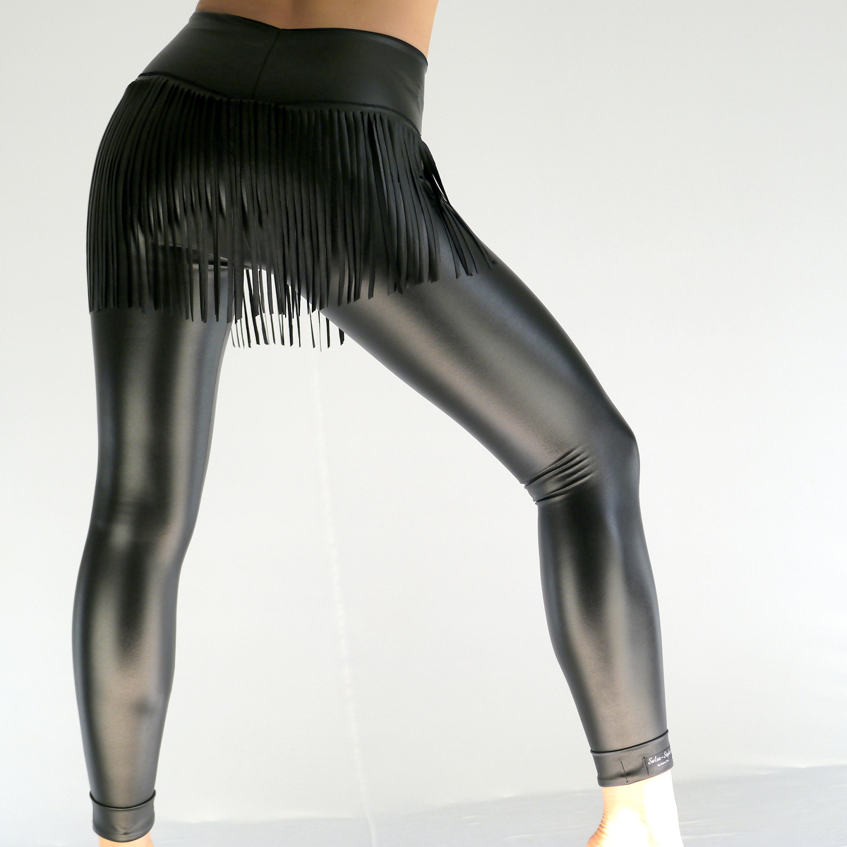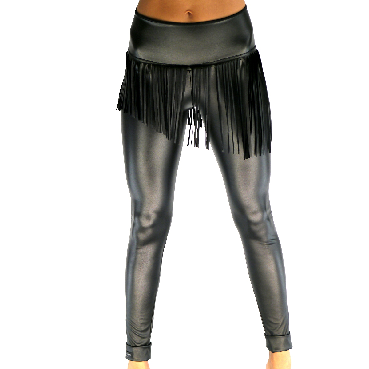 Schwarze Leggings mit Fransen in Leder Look, Kompression, Wettlook, Anti Cellulite, Lack Optik