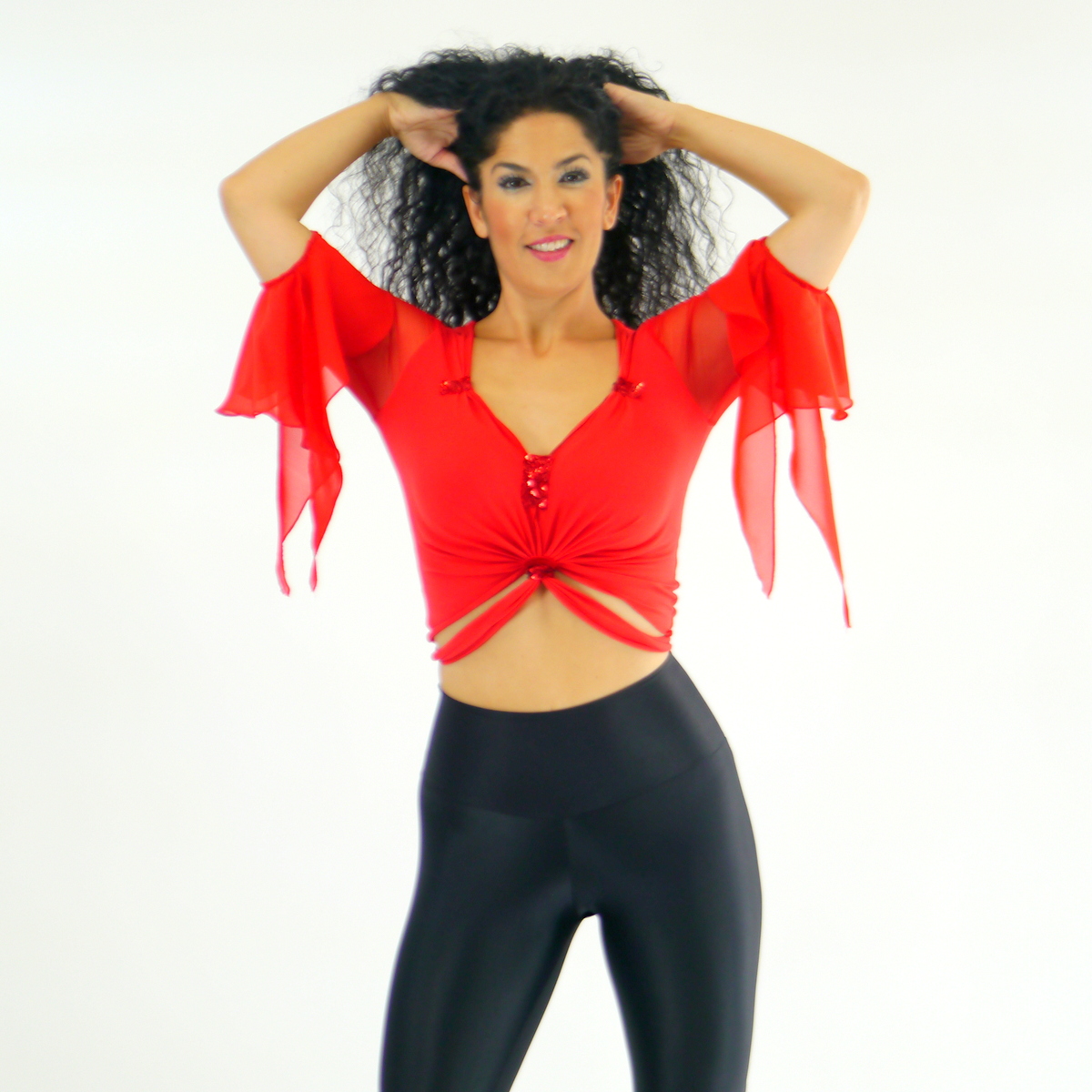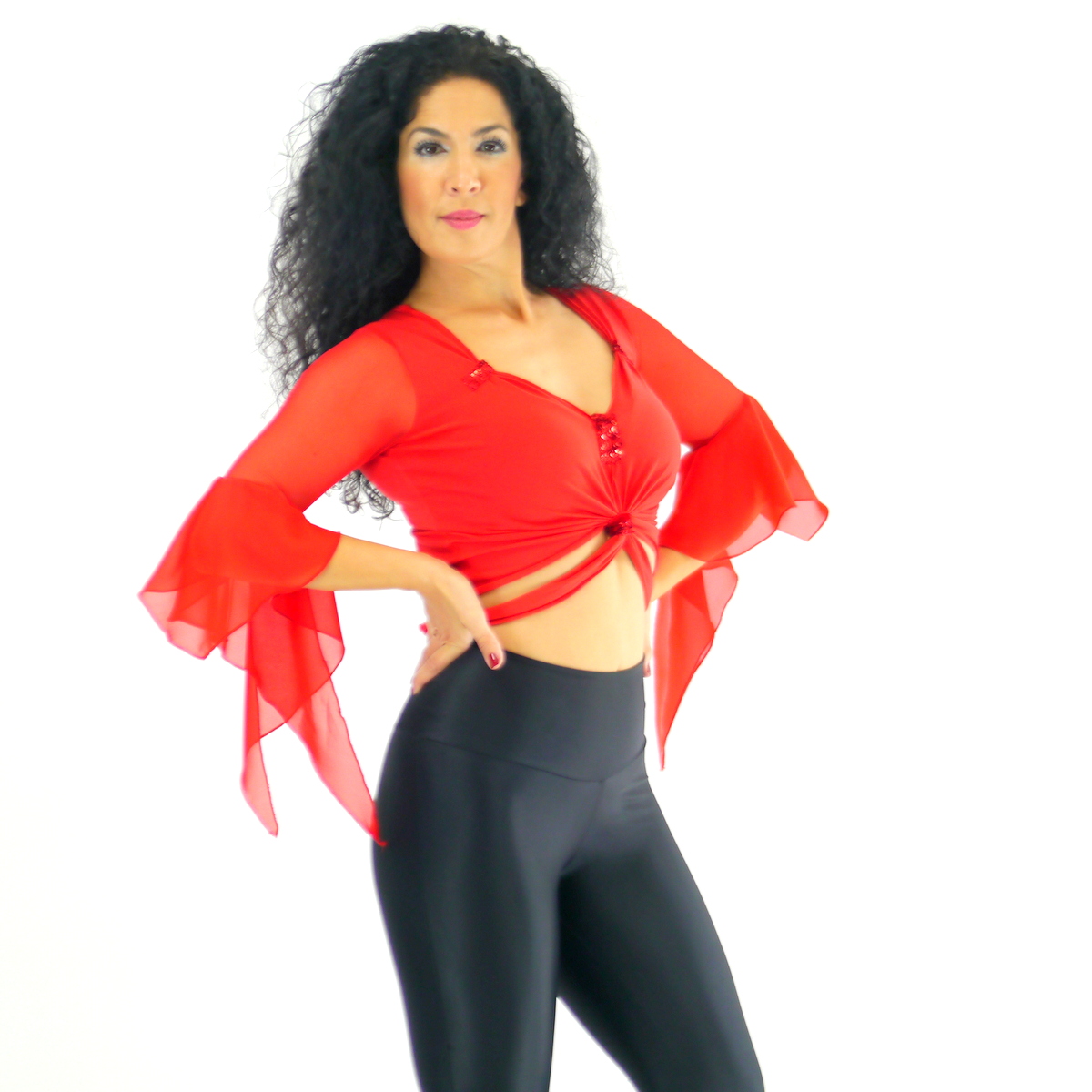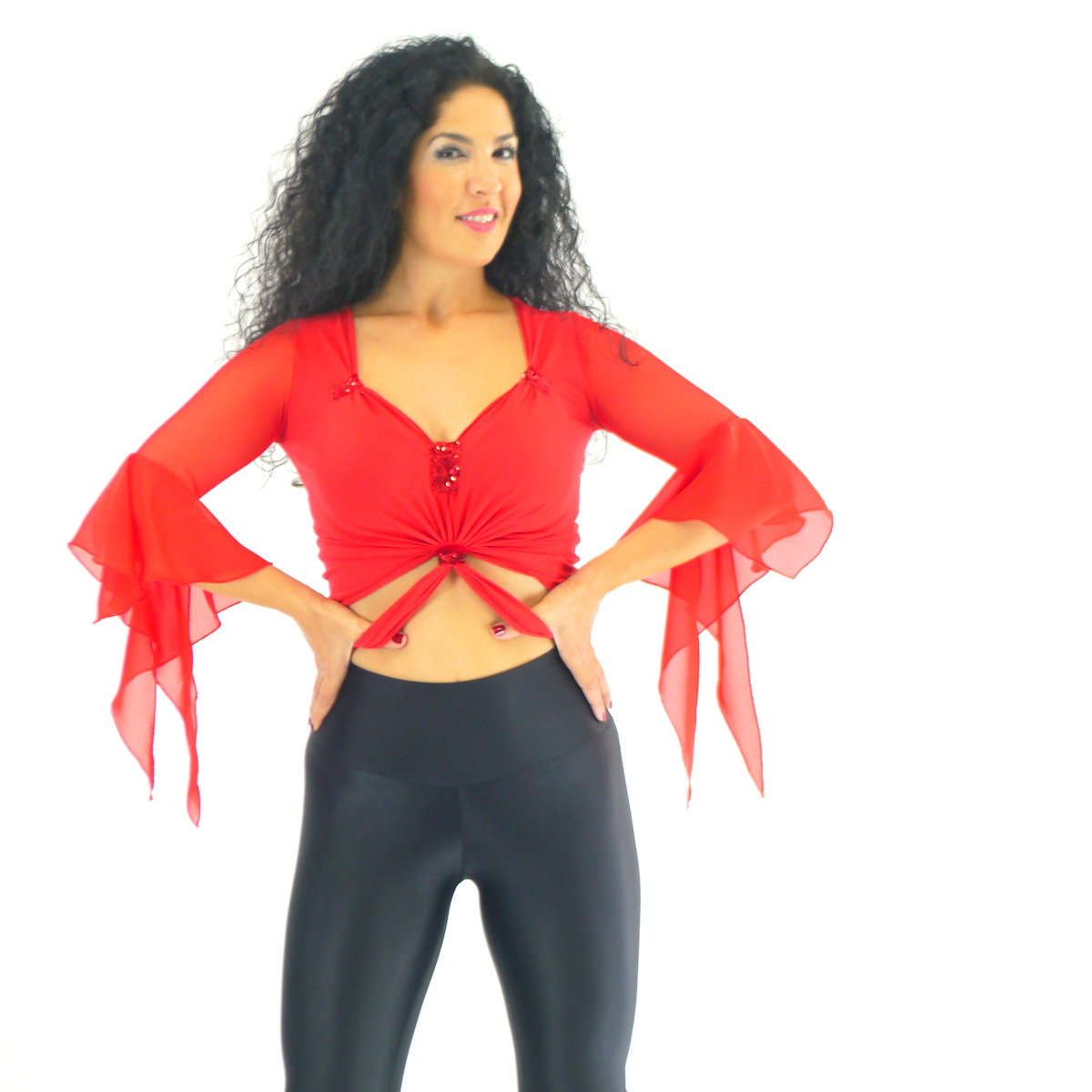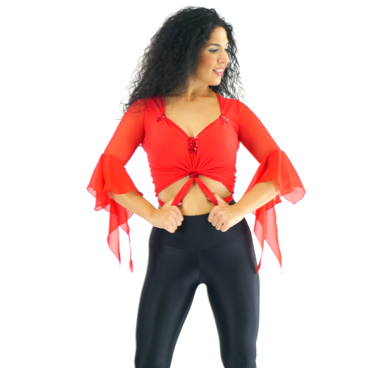 Das Oberteil mit Rüschen ist angefertigt aus Baumwoll-Jersey Stoff. Die Ärmel sind aus Netz Stoff und die Rüschen aus Chiffon. Das Oberteil ist eine Art Bolero, der wird hinten zugeknotet.