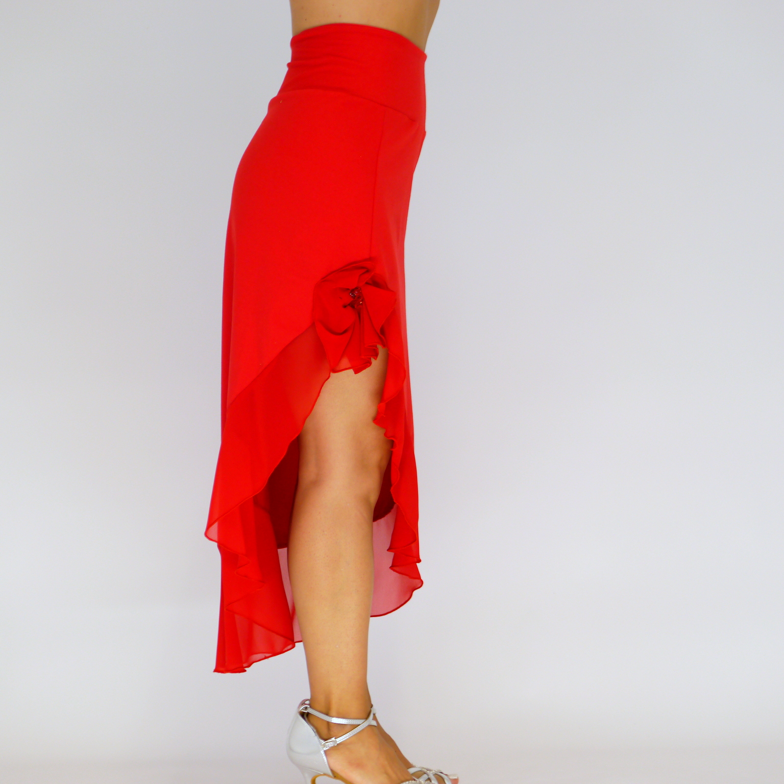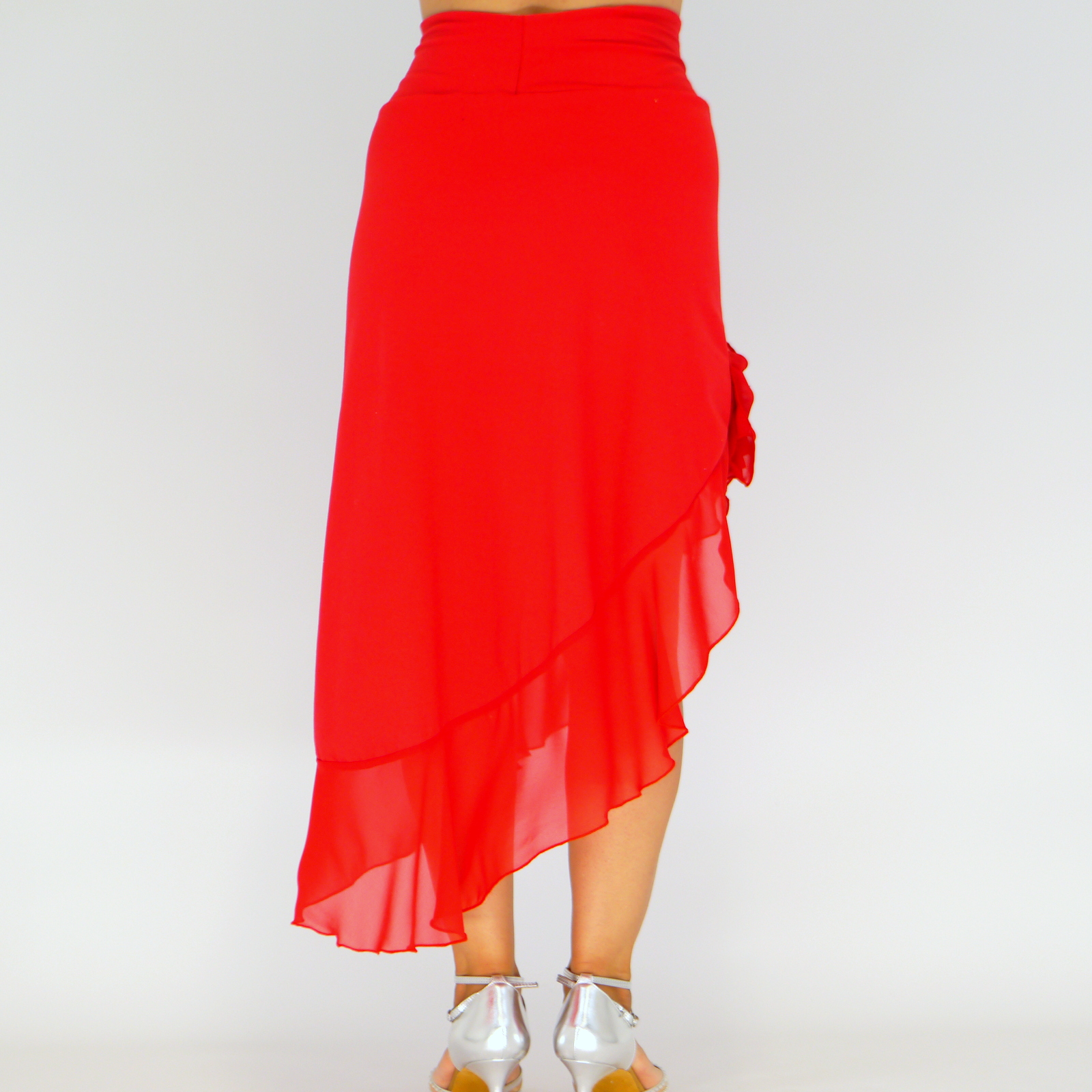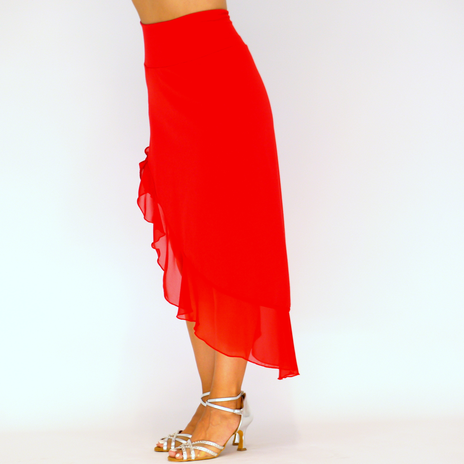 Entdecke unseren stilvollen Damenrock, ideal für leidenschaftliche Tänzerinnen! Dieser asymmetrisch geschnittene Rock aus hochwertiger Baumwolle und Elasthan bietet nicht nur einen angenehmen Tragekomfort, sondern auch eine elegante Optik. Der Schlitz sorgt für Bewegungsfreiheit und einen verführerischen Look, während die chiffonene Rüsche entlang des Saums dem Rock eine verspielte und feminine Note verleiht.