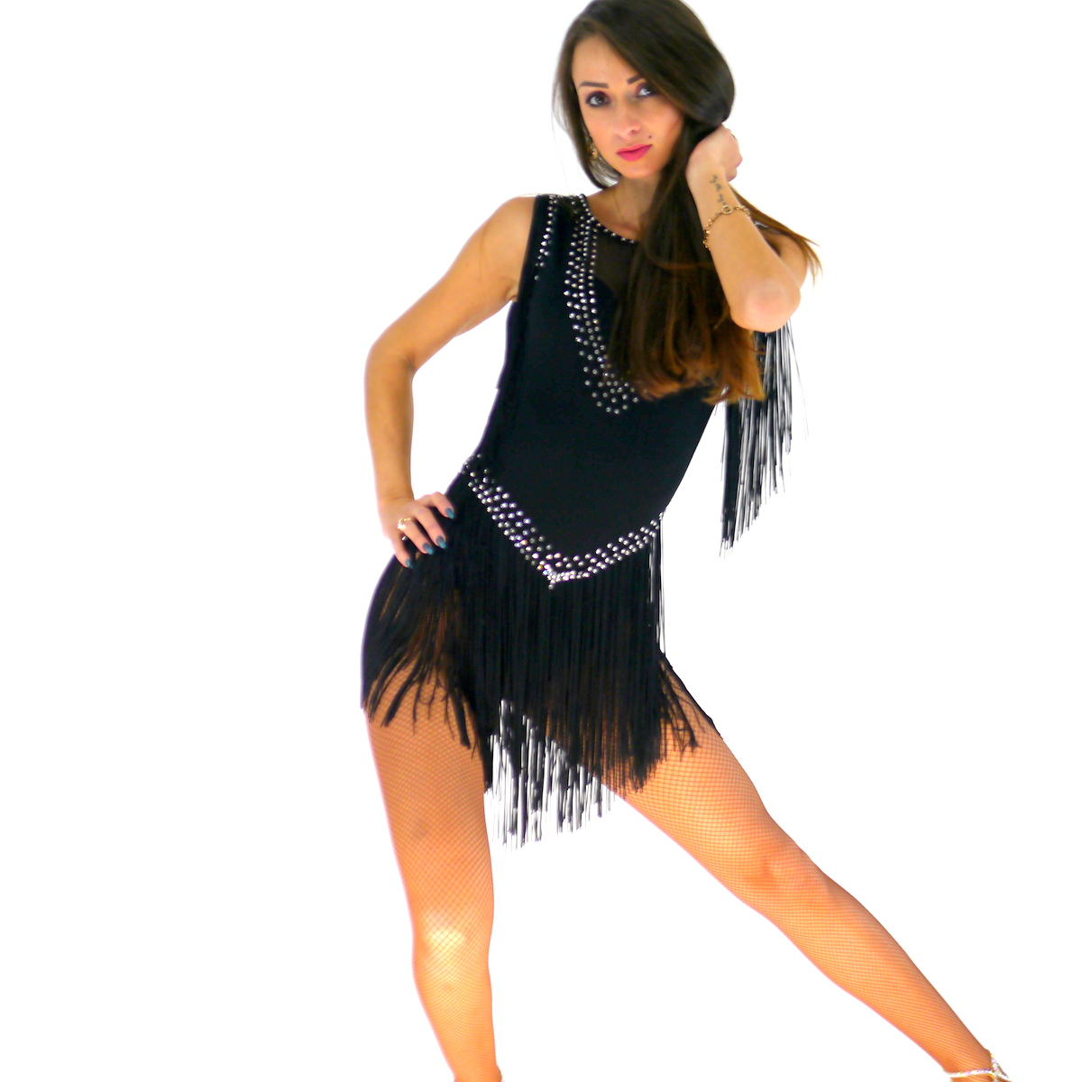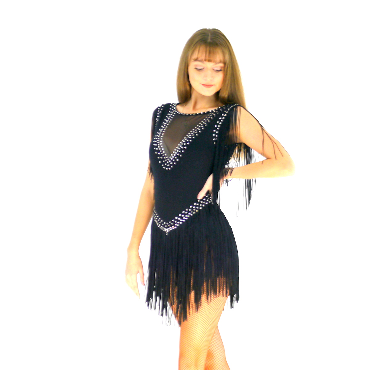 Das Tanzkleid mit Fransen und Strass Steine ist angefertigt aus einen hochwertigen Baumwollstoff mit Elasthan. Das Kleid ist super bequem, hat einen tiefen Ausschnitt aus Netzstoff und sieht ausgezeichnet aus und sexy. Für Shows und Meisterschaften ist das Kleid einfach nur perfekt.