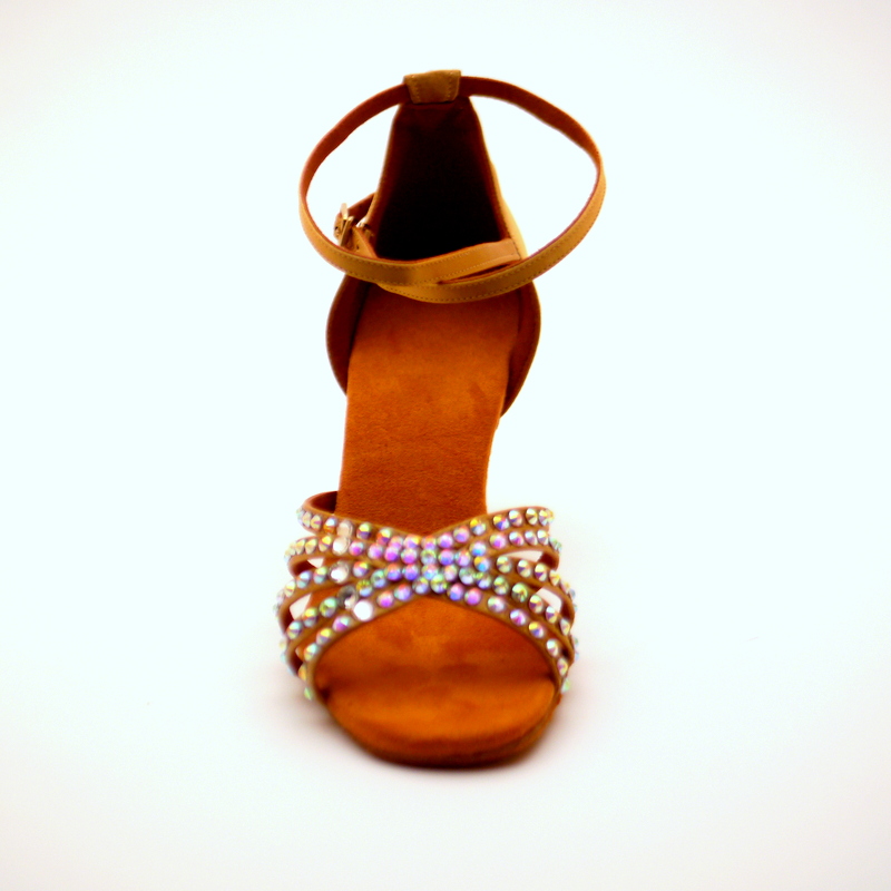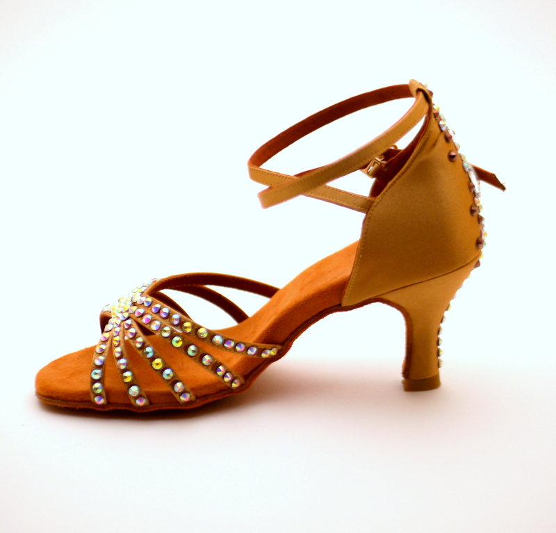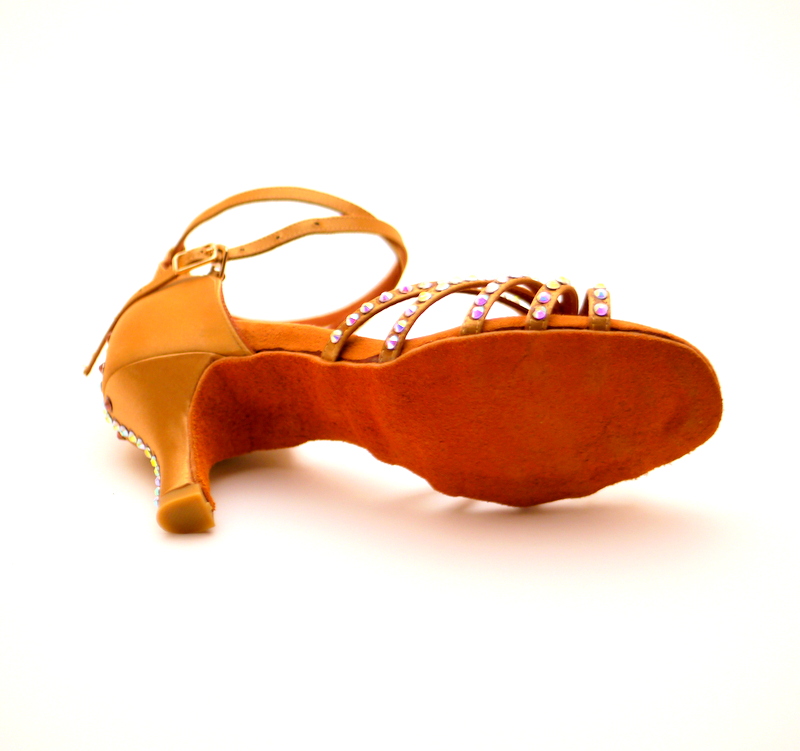 Hochwertige Latein Tanzschuhe aus WIldleder, Absatzhöhe 7,5cm. Mit Hand verziert mit funkelndem Strass und in zeitloser Bronzefarbe ein echter Hingucker!