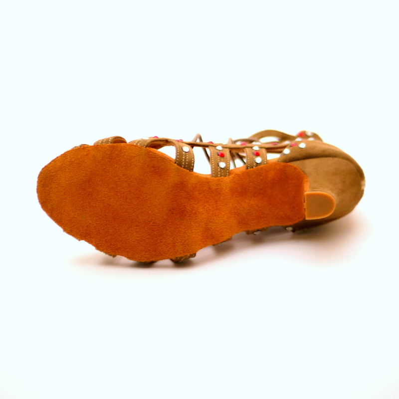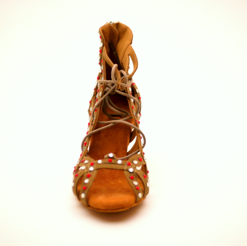Tolle braune Latein Tanzschuhe zum Schnüren, von Hand verziert mit rotem und silber Strass. Absatzhöhe 6,5 cm. Aus hochwertigem Wildleder gefertigt!