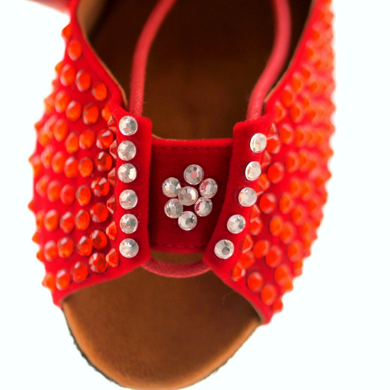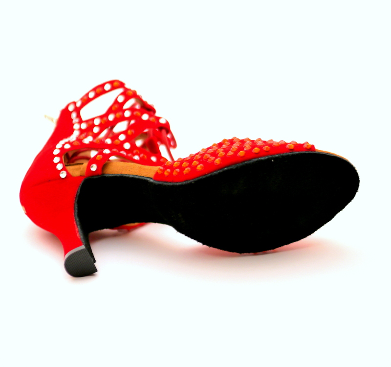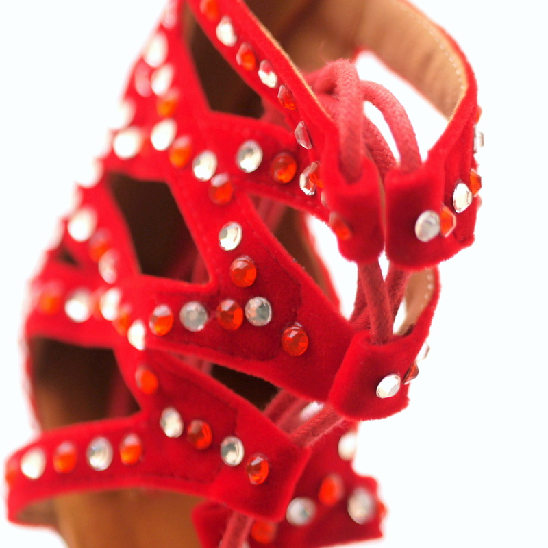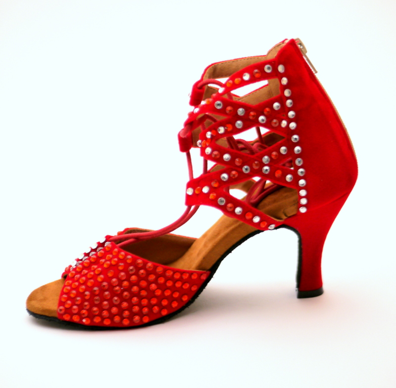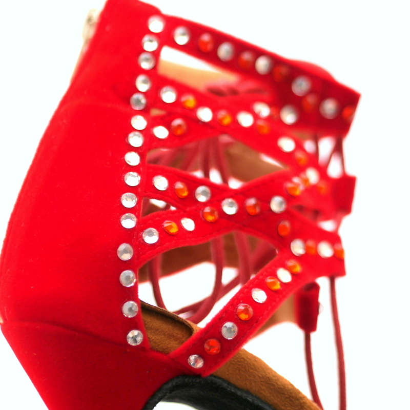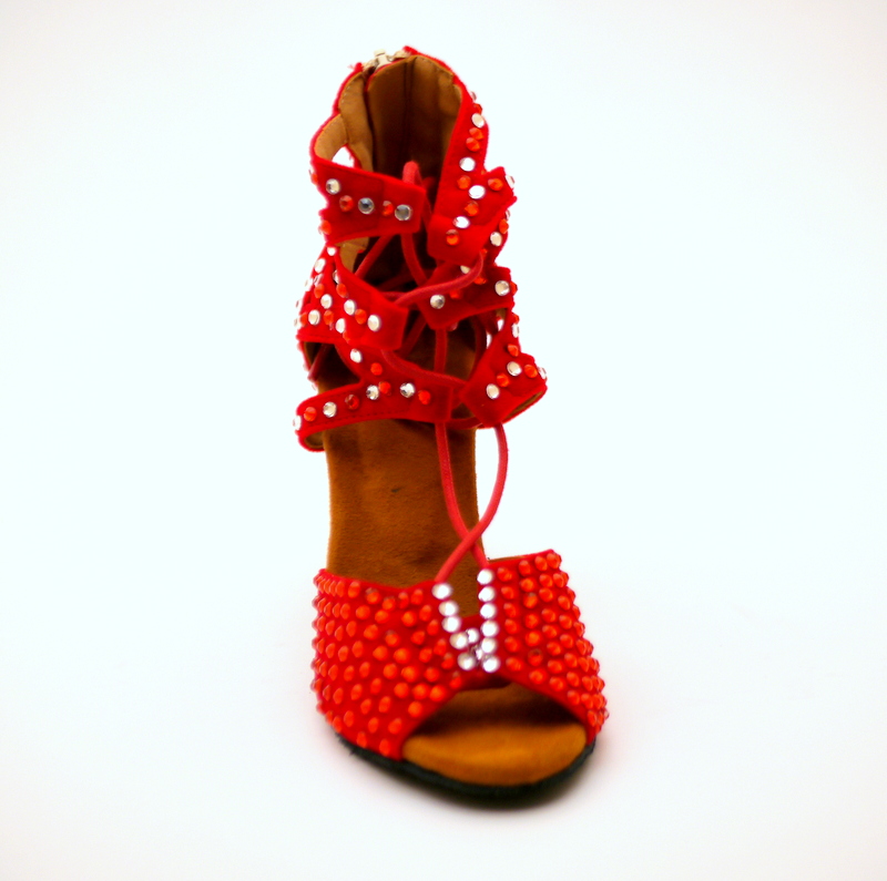 Echte Hingucker: Rote Tanzschuhe zum Schnüren und mit Reißverschluss hinten, hand verziert mit rotem und silbernem Strass. Absatzhöhe von ca. 8cm