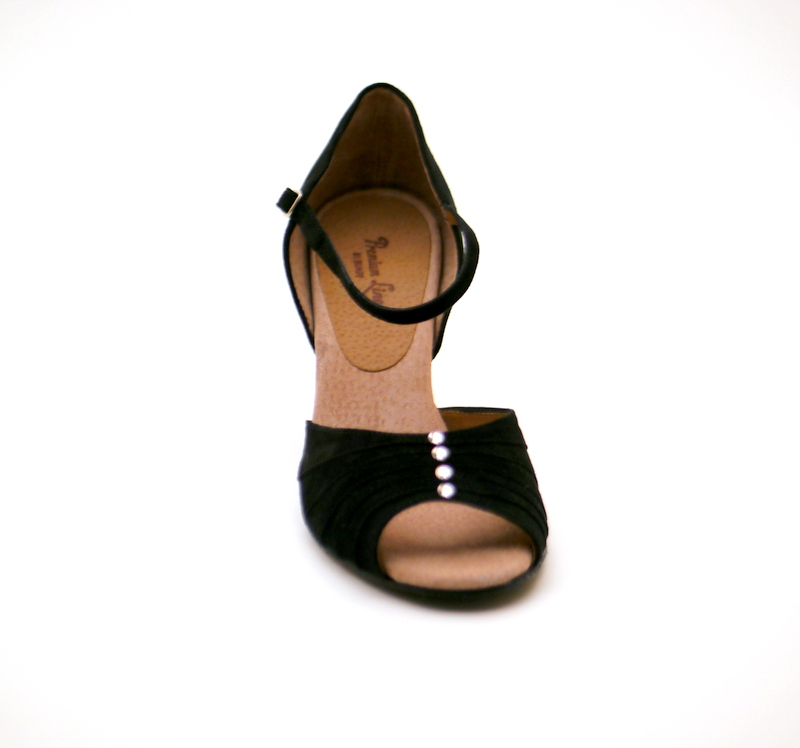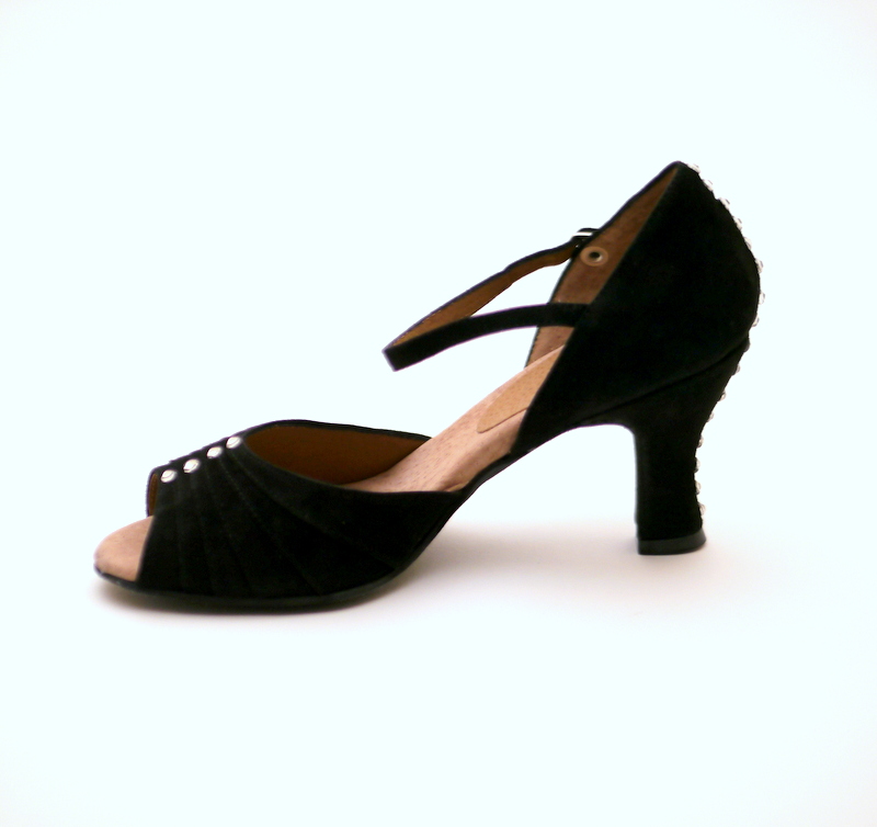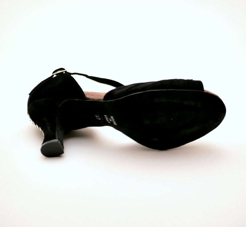 Hochwertige Tanzschuhe aus Leder, handmade in Italy. Absatzhöhe ca. 7,5 cm und somit bestens geeignet für Anfänger und Fortgeschrittene. In zeitlosem Schwarz und mit silbernem Strass von Hand veredelt.