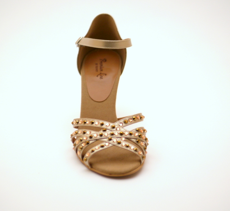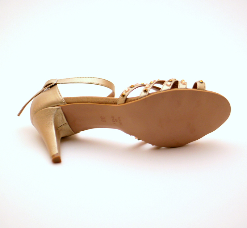 Vegane Latein Tanzschuhe aus hochwertigem Kunstleder in zartem Gold. Handmade in Italy. Absatzhöhe 7cm, mit Strass handverziert. Aufraubare synthetische Sohle. Innensohlenlänge in Größe 38 ca. 25 cm.